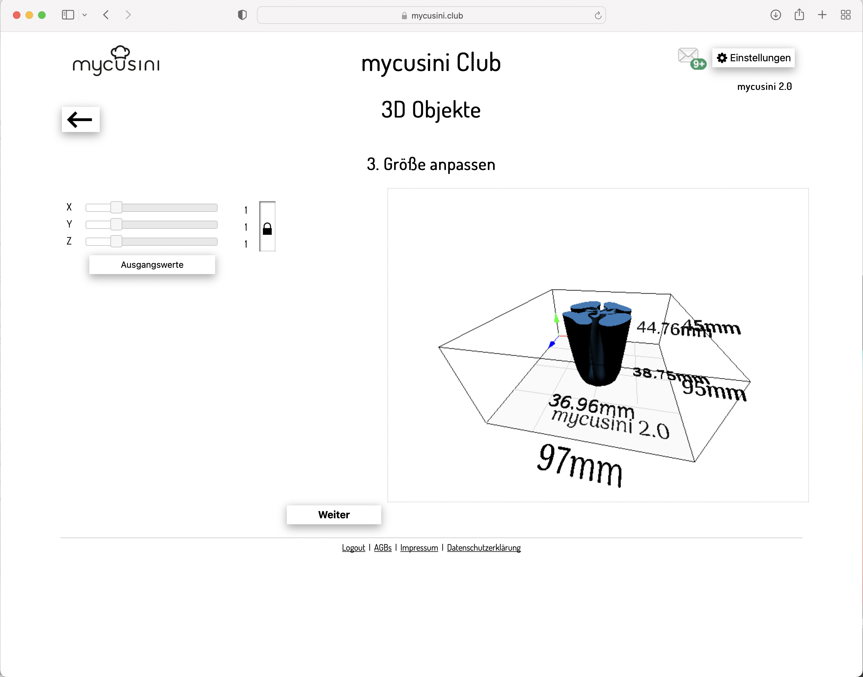 mycusini ermöglicht auch, selbst Druckvorlagen zu erstellen. Es ist lediglich eine Anmeldung im mycusini-Club notwendig. Dort gibt es dann verschiedene Auswahlmöglichkeiten. Schriftzüge(verbunden), Textbotschaften, 3D Objekte (beta), Umrisse, eigene STL-Dateien und Hohlformen. Auch gibt es noch kostenpflichtige Apps, die einem ermöglichen, aus digitalen Bildformaten wie JPEG oder PNG Dateien fertige Vorlagen zu erstellen.