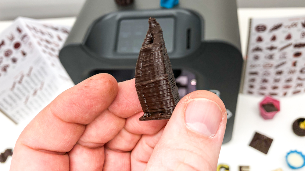 Unser Appetit ist bei den ersten Tests mindestens so hoch wie unsere Erwartungen an den Drucker. Uns hat zunächst am meisten überrascht, wie schnell die extrudierte Schokolade erstarrt und eine stabile Basis für die nächste Schicht bildet.