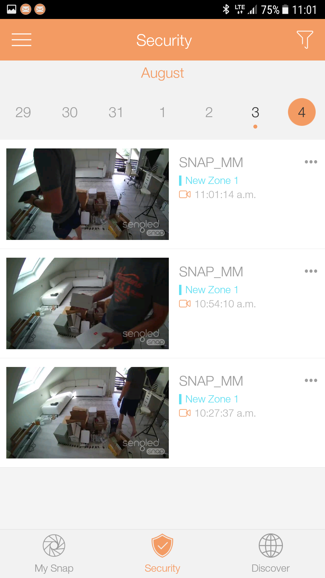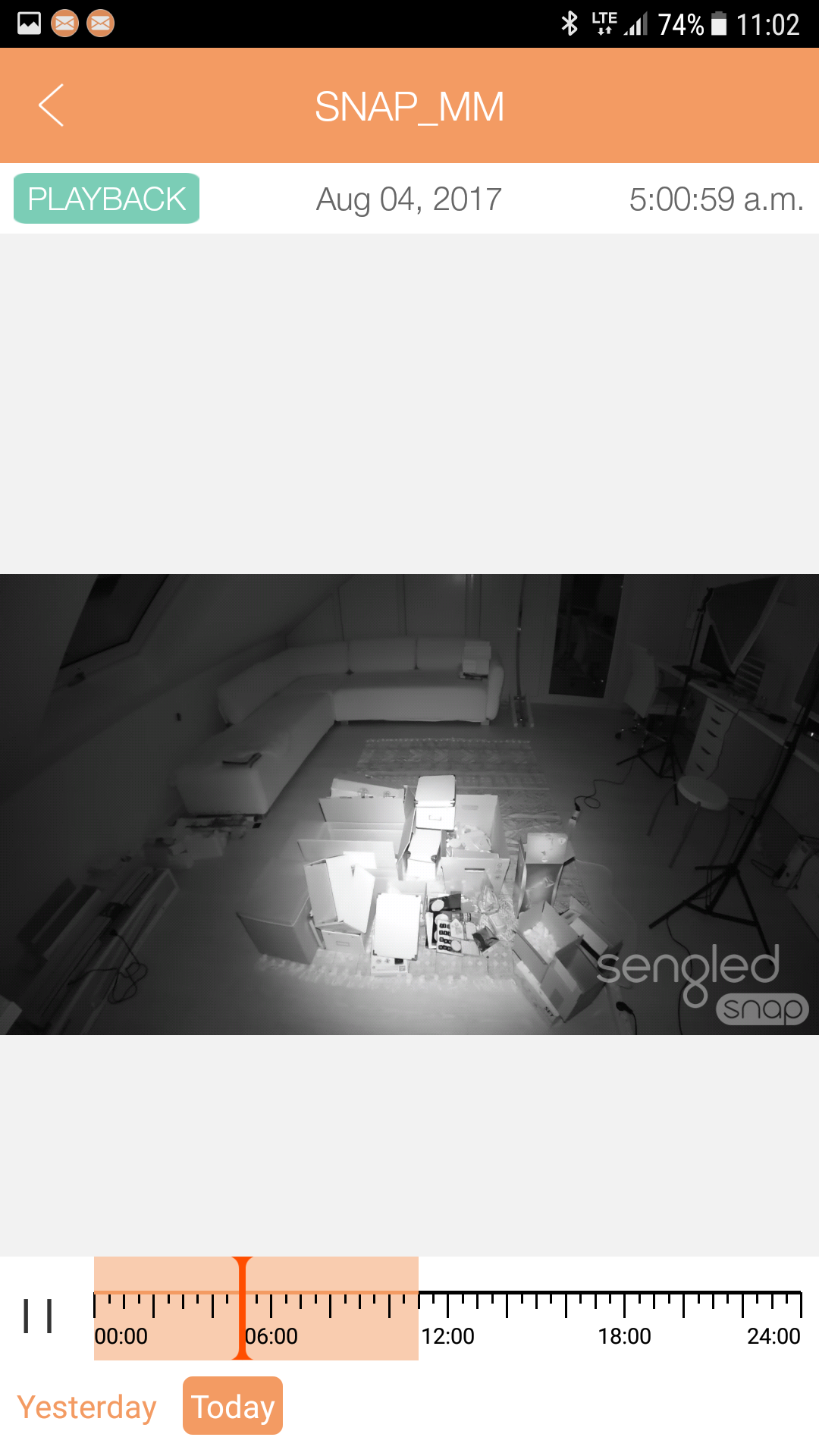 Die Sengled Snap ist in erster Linie für den Einsatz außen am Haus konzipiert. Zur Bedienung gibt es eine Smartphone-App für Android und iOS, die auch bei der Ersteinrichtung der Snap unterstützt und die WLAN-Vebrindung zum Router herstellt. Was vor der Linse geschieht, wird konstant in der Cloud aufgezeichnet. So hat der Nutzer die Möglichkeit, per App nachzuschauen, was an einem bestimmten Datum zu einer bestimmten Uhrzeit geschah. Darüber hinaus gibt es die Option einer zuschaltbaren Bewegungserkennung, wahlweise mit oder ohne Push-Nachrichten auf dem Handy.