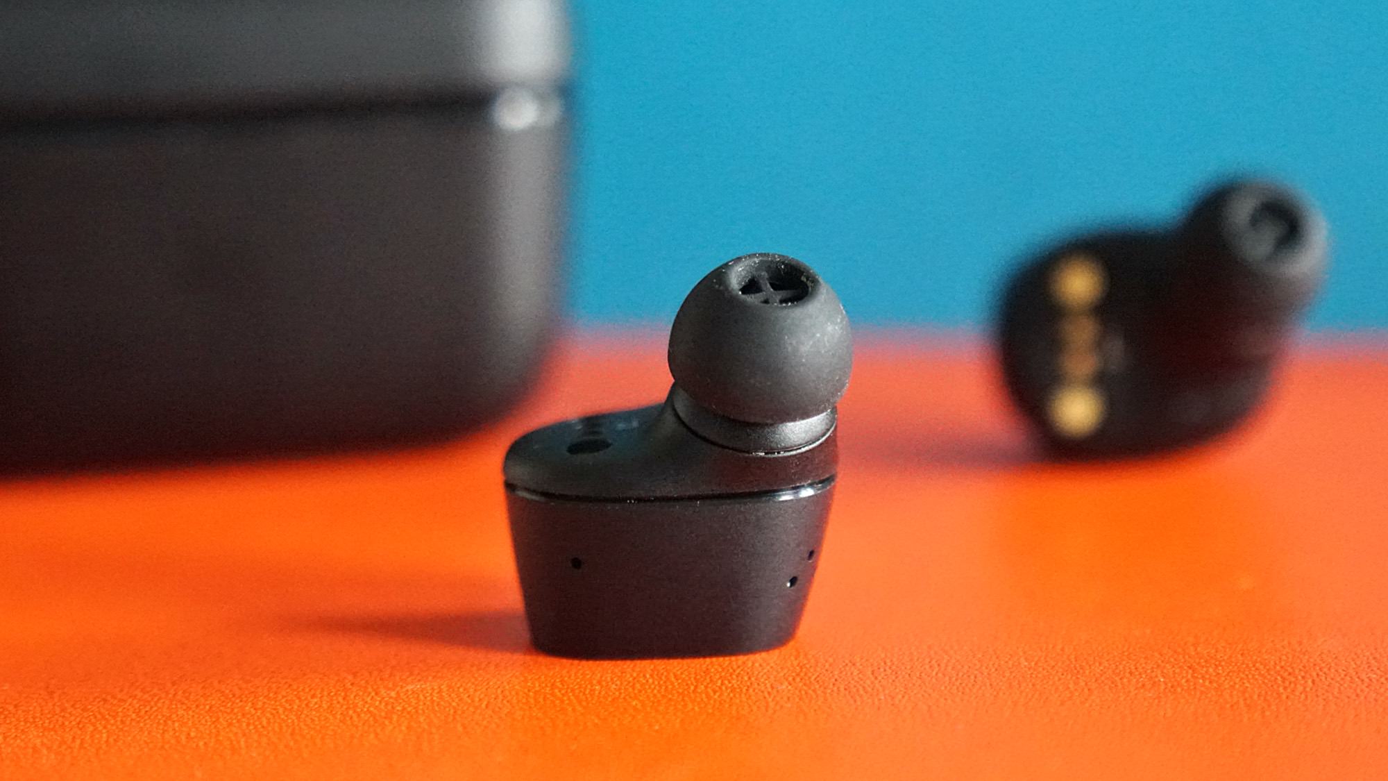 Optisch unterscheiden sich die CX 400BT recht deutlich von den Sennheiser-Flaggschiffen – angefangen bei der nur 37 g leichten Ladebox. Die Form erinnert an eine Kühlbox oder einen Werkzeugkasten im Miniaturformat. Der verwendete Kunststoff wirkt nicht sehr hochwertig, außerdem ist die Box schon fast zu groß für die Hosentasche. Die Ohrhörer wiegen jeweils 6 g, auch hier fühlt sich der Kunststoff bei Weitem nicht so hochwertig an wie bei den teureren Familienmitgliedern. Statt auf eine runde Bauform setzt Sennheiser bei den CX 400BT auf eine rechteckige Rückseite – die gleichzeitig als berührungsempfindliches Bedienfeld dient. Die Seiten sind leicht mattiert und enthalten die Mikrofone für Telefonate und Sprachbefehle.