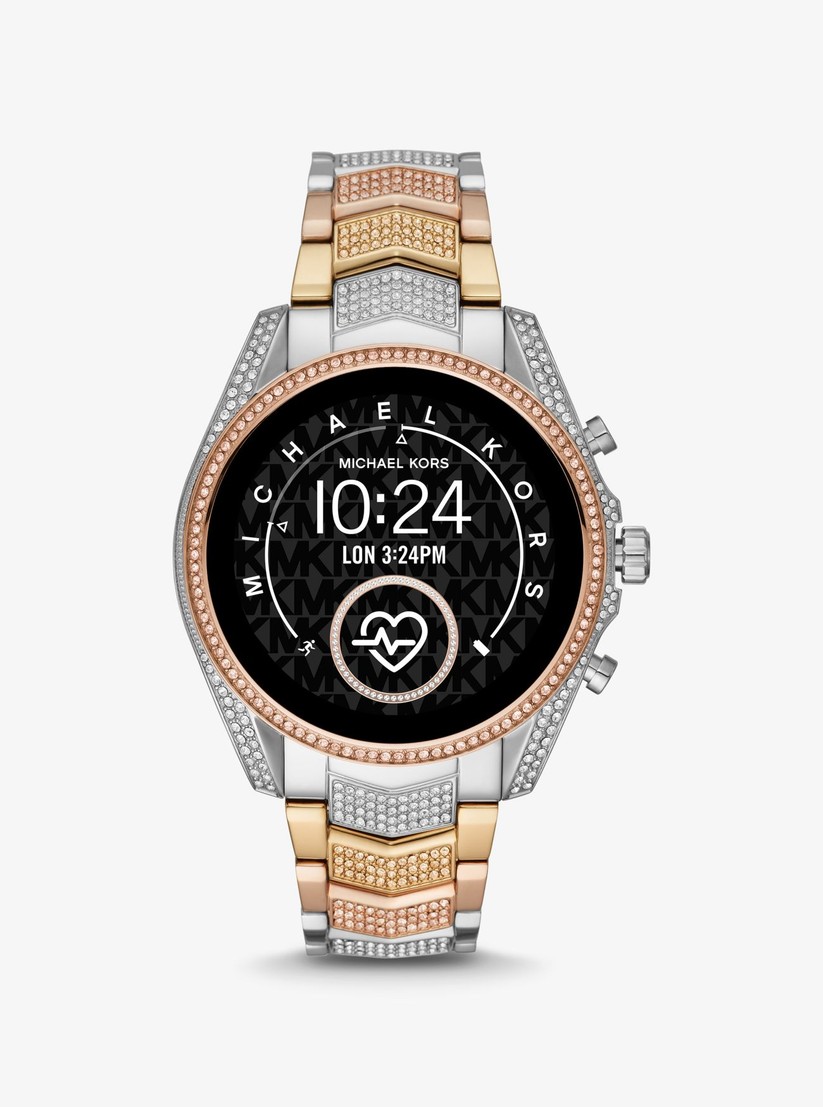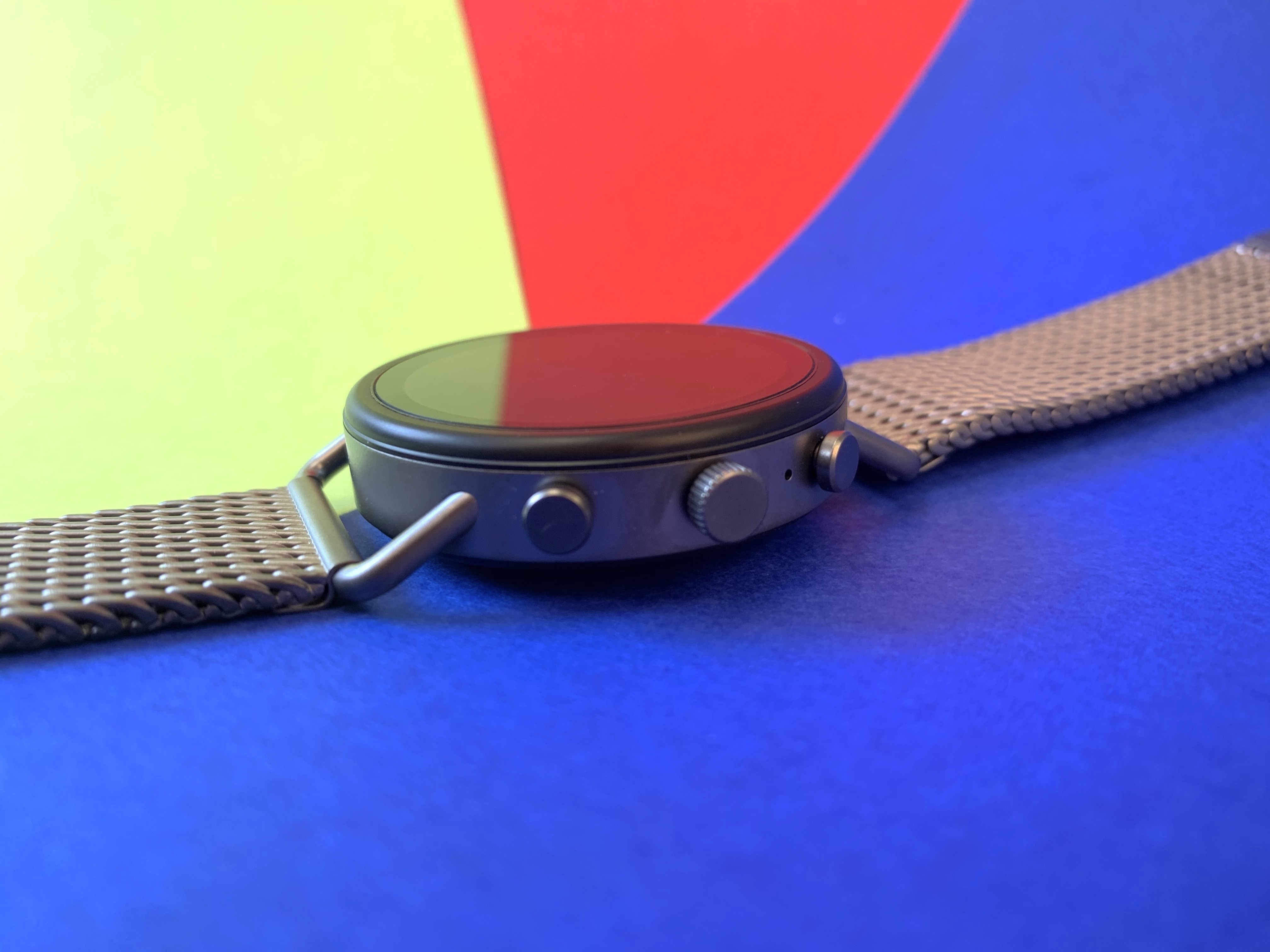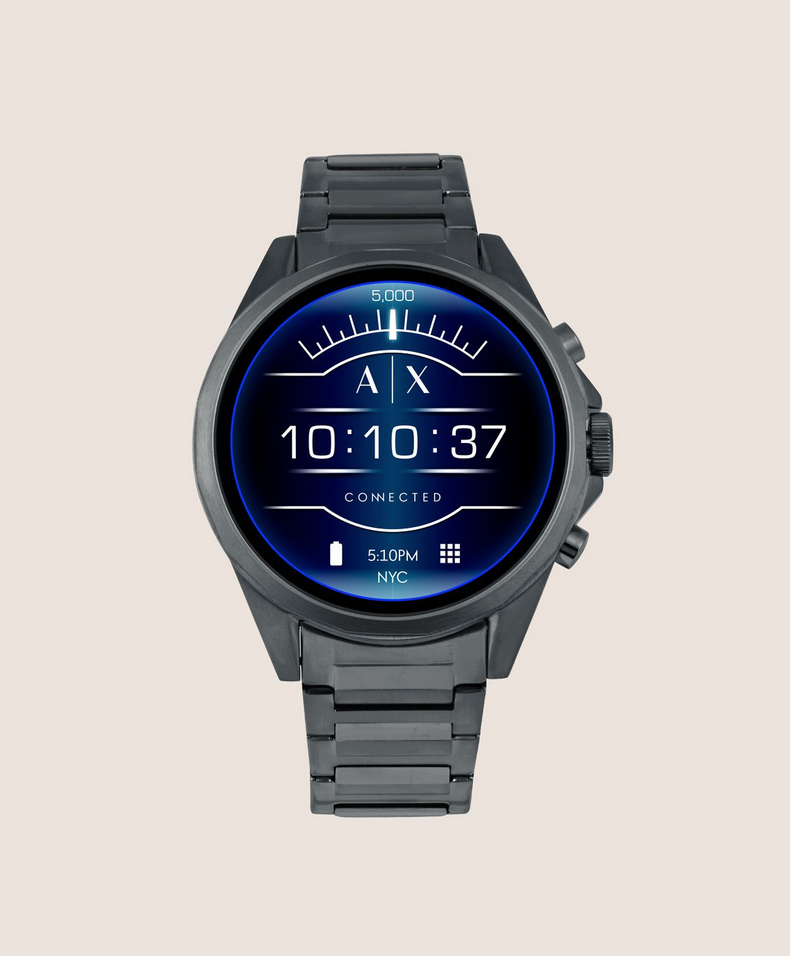 Der Uhr liegen ein Ladekabel und eine Betriebsanleitung bei. Die Smartwatch selbst gibt es in Hinblick auf die Armbänder in drei Varianten. Unser Testmodell hat ein Armband aus rostfreiem Stahl mit dem Namen Band Gun-metal Gauge Mesh . Das Gehäuse der Uhr ist aus dem gleichen Material gefertigt.