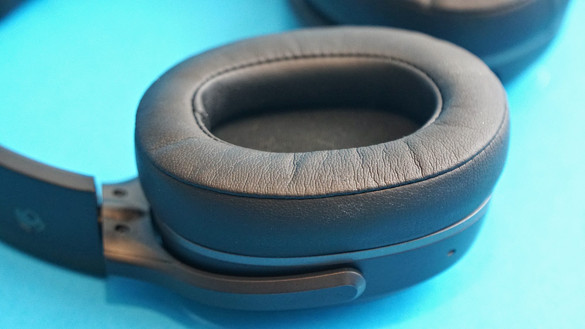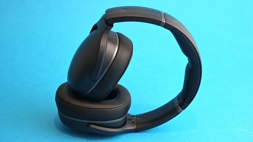 Durch die schweren Hörmuscheln reicht es für diesen Effekt, wenn man den Kopfhörer am Bügel festhält und die Hand dann in einer schnellen Bewegung dreht – ähnlich einer Angabe beim Tischtennis. Die wuchtigen Hörmuscheln des Over-Ear-Kopfhörers hängen an einem um 180 Grad schwenkbaren und umknickbaren Scharnier. Die zwei Zentimeter dicken Polster sind mit angenehm weichen Kunstleder bezogen, wodurch Ohren komplett und bequem umschlossen werden. Bei längerem Tragen kann es aber auch schon mal recht warm werden.