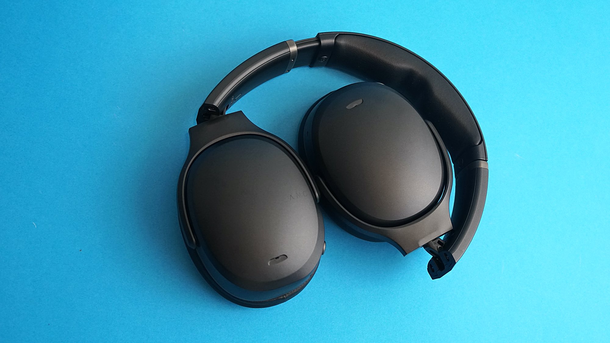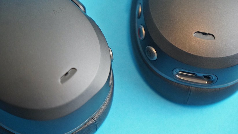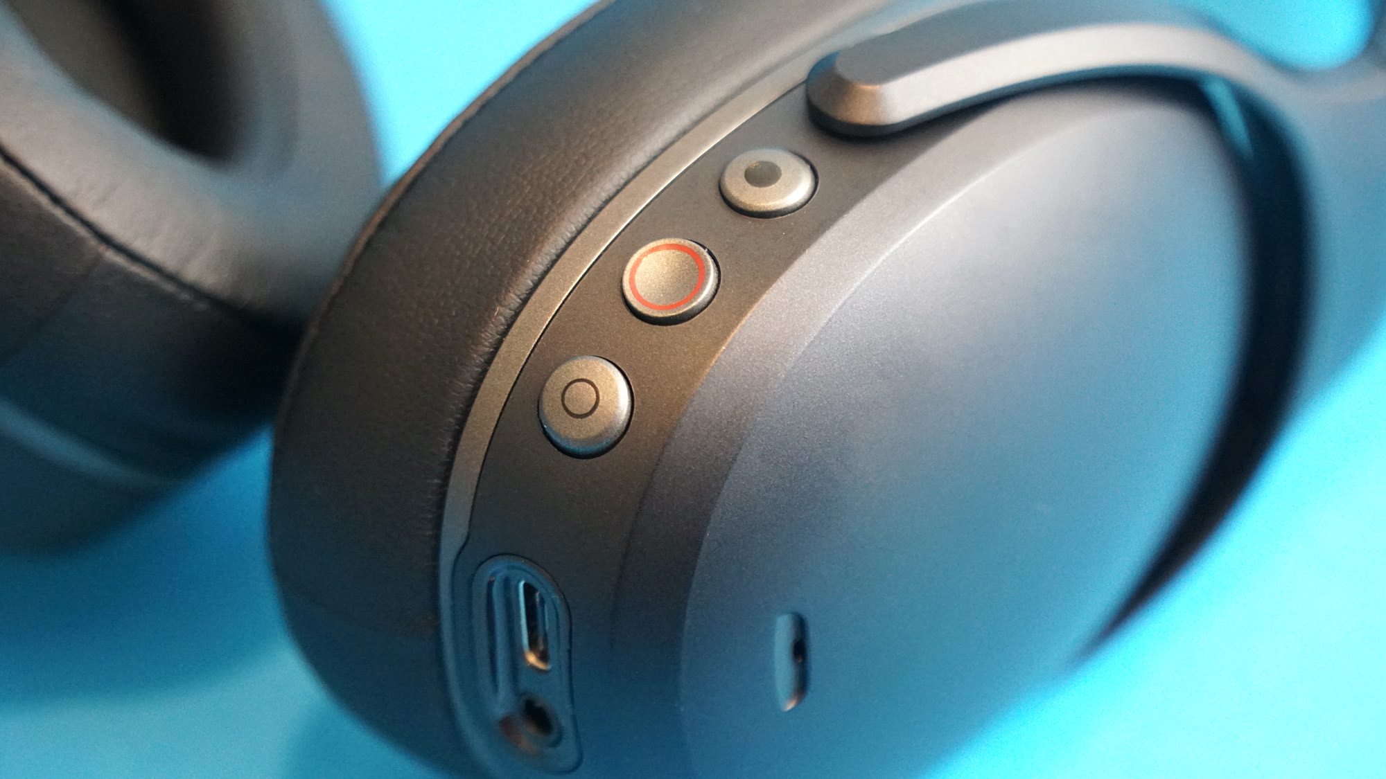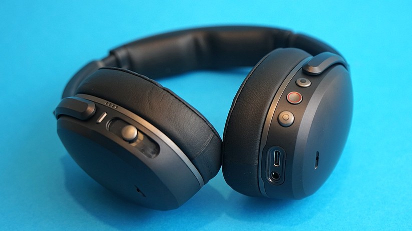 Die Bedienelemente sind alles andere als zurückhaltend. An der hinteren linken Seite befinden sich drei leicht aus dem Gehäuse ragenden Drucktasten. Hierüber werden Lautstärke geregelt, Tracks ausgewählt, Musik gestartet und gestoppt oder Anrufe angenommen. An der Unterseite befinden sich die beiden Anschlüsse für USB-C und Klinke. Auf der linken Seite sitzt der schmale Powerschalter, mit dem auch die aktive Geräuschunterdrückung gestartet wird. Wurde ANC aktiviert, dient der linke Ohrhörer als zusätzliches Touchpad: Wird die Oberfläche für drei Sekunden berührt, schaltet sich der Ambient-Modus und damit die Außenmikrofone ein, wodurch die Umgebung besser hörbar ist, als bei deaktivierten ANC.
