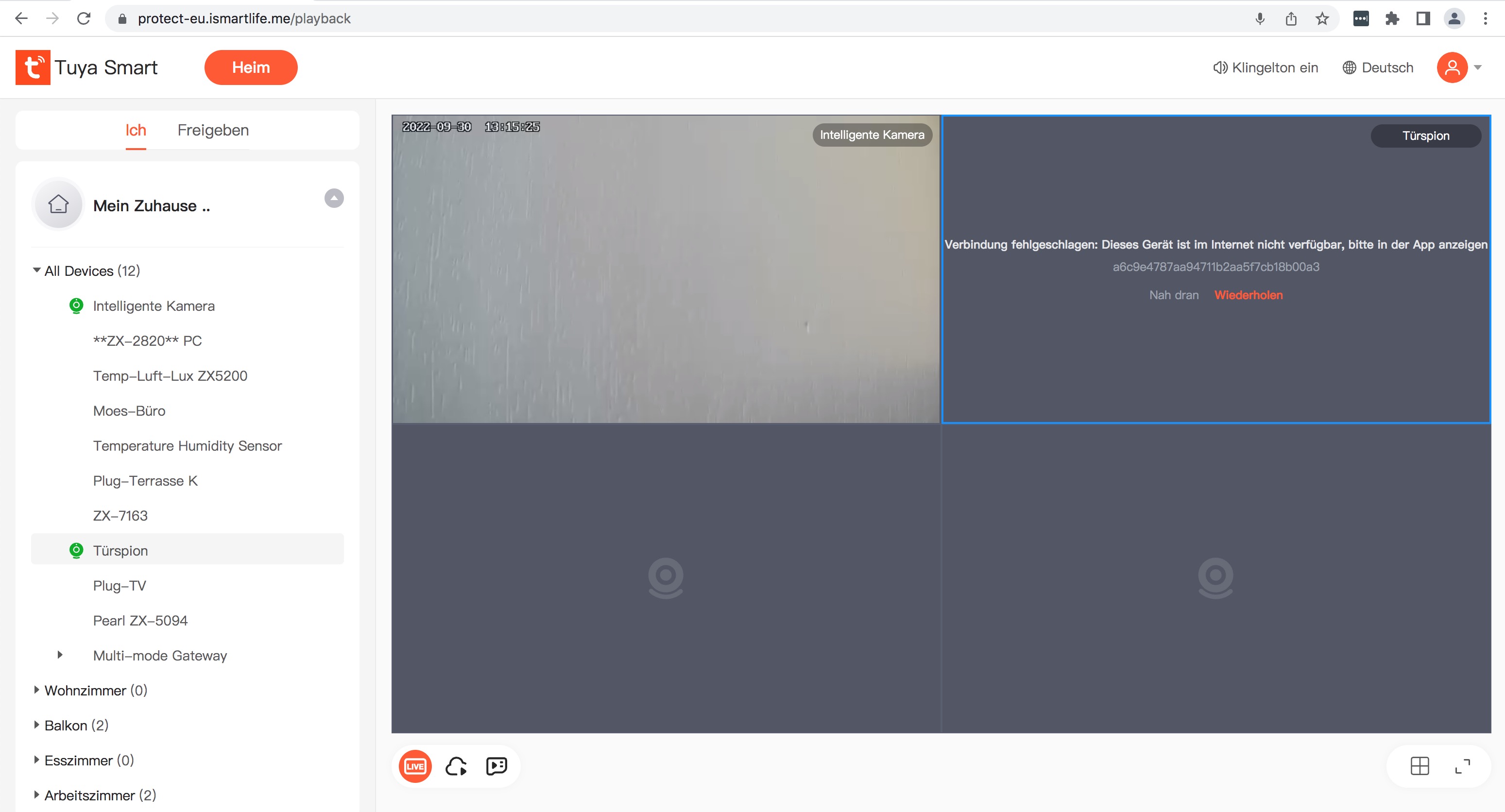 Aufgelaufene Alarmmeldungen finden sich nicht im Hauptmenü der Kamera, sondern über Profil – Nachricht. Hier werden zentral sämtliche Alarm-Benachrichtigungen aller verwendeten Tuya-Geräte gelistet. Allerdings werden erkannte Bewegungen nur in Form eines Fotos dargestellt. Beim Klick auf „Zum Anzeigen klicken“ wird lediglich der Live-Stream der Kamera aktiviert. Wer bislang aufgenommene Videos betrachten möchte, tippt dazu im Menü der Kamera auf Wiedergabe. Dort gibt es zwar eine Zeitskala, allerdings keine Markierung für aufgenommene Videos, was das Suchen nach einer bestimmten Sequenz umständlich macht. Das hat etwa Ezviz bei der CP4 deutlich besser gelöst.