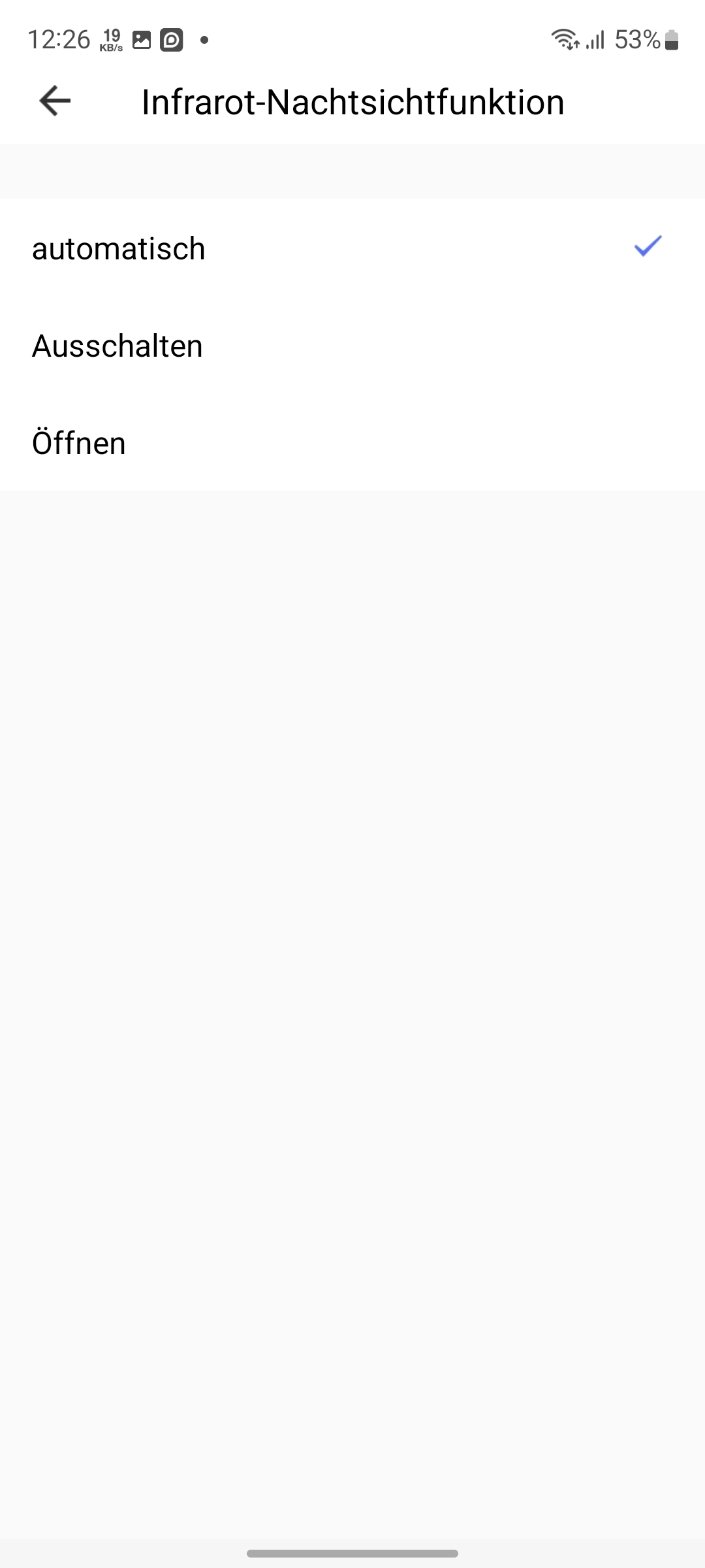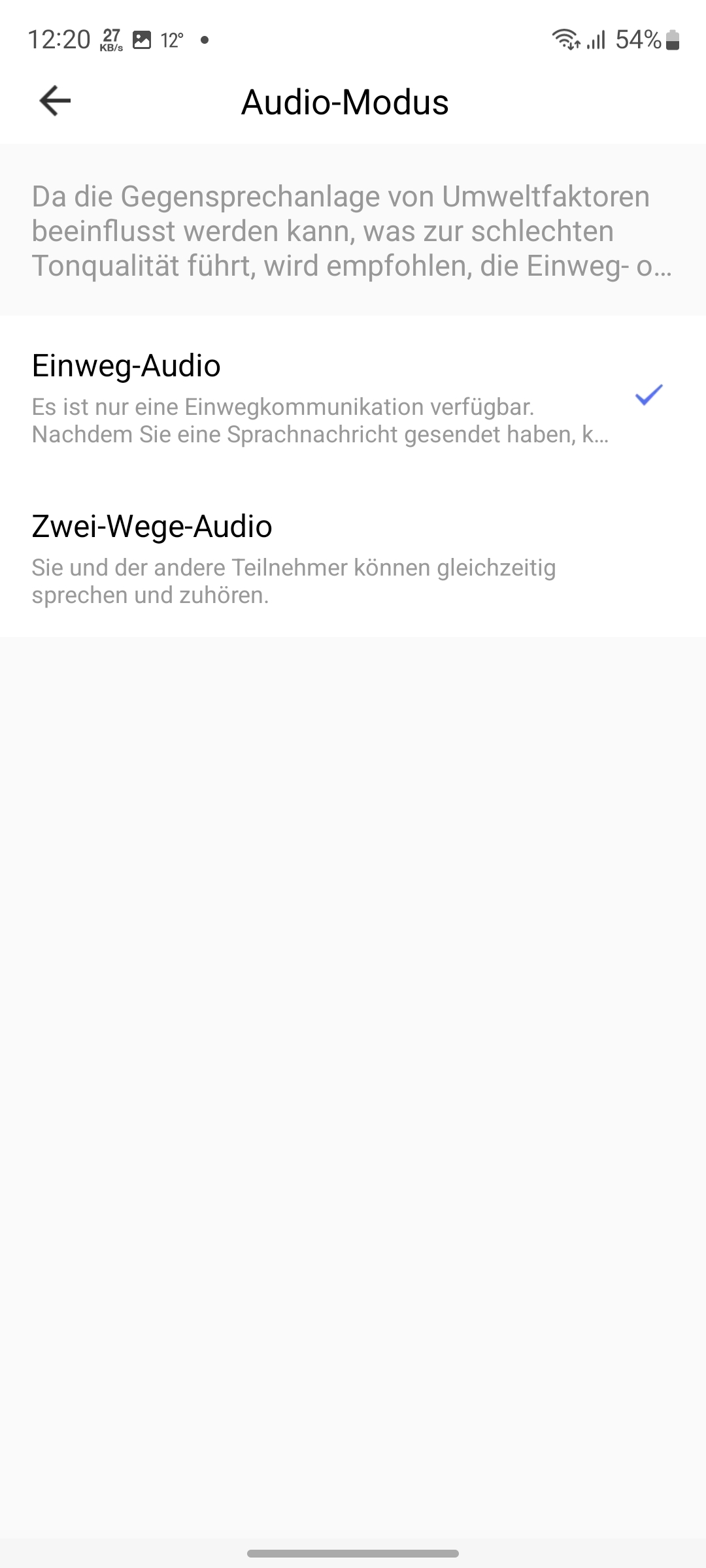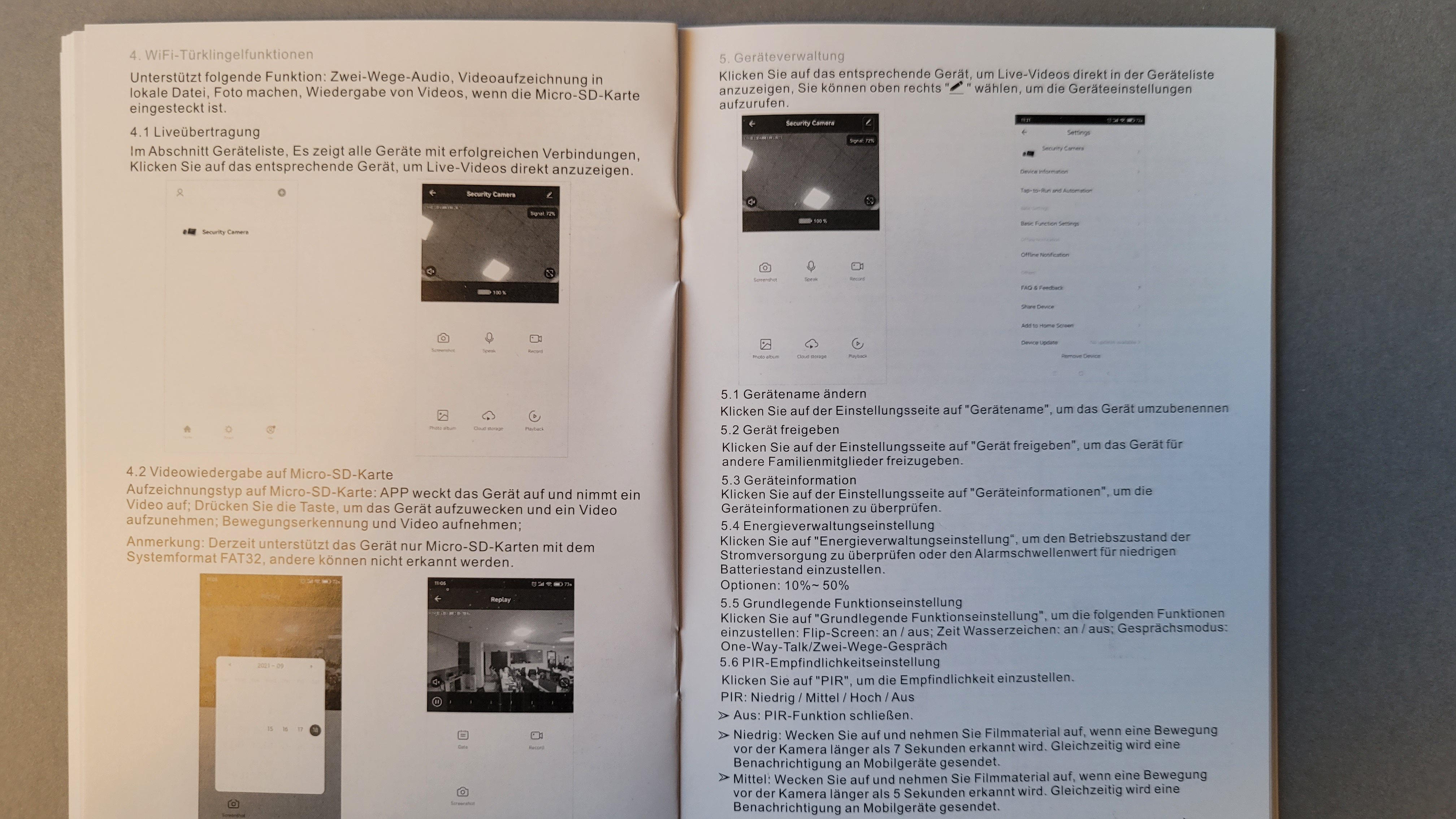 Viele Einstellungsmöglichkeiten bietet die App nicht, was aber der Übersichtlichkeit zugutekommt. Im Hauptmenü sieht man das Live-Bild der Kamera mit Angabe der Signalstärke des Funknetzwerks, den Status der Batterie sowie die Menü-Kacheln Fotografieren, Sprechen, Aufnehmen, Photo Album, Cloud-Speicher und Wiedergabe. Über das Bearbeiten-Symbol rechts oben gelangt man zu den Einstellungen. Hier lassen sich Informationen zum Gerät abrufen oder bestimmte Konfigurationen wie Audio-Modus, Infrarot-Nachtsicht, Lautstärke der Sprachausgabe (Geräusche) und die Bewegungserkennung (PIR-Schalter) vornehmen. Unterschiedliche Klingeltöne stehen leider nicht zur Auswahl, sodass man mit dem Standard-Klingelton vorliebnehmen muss.