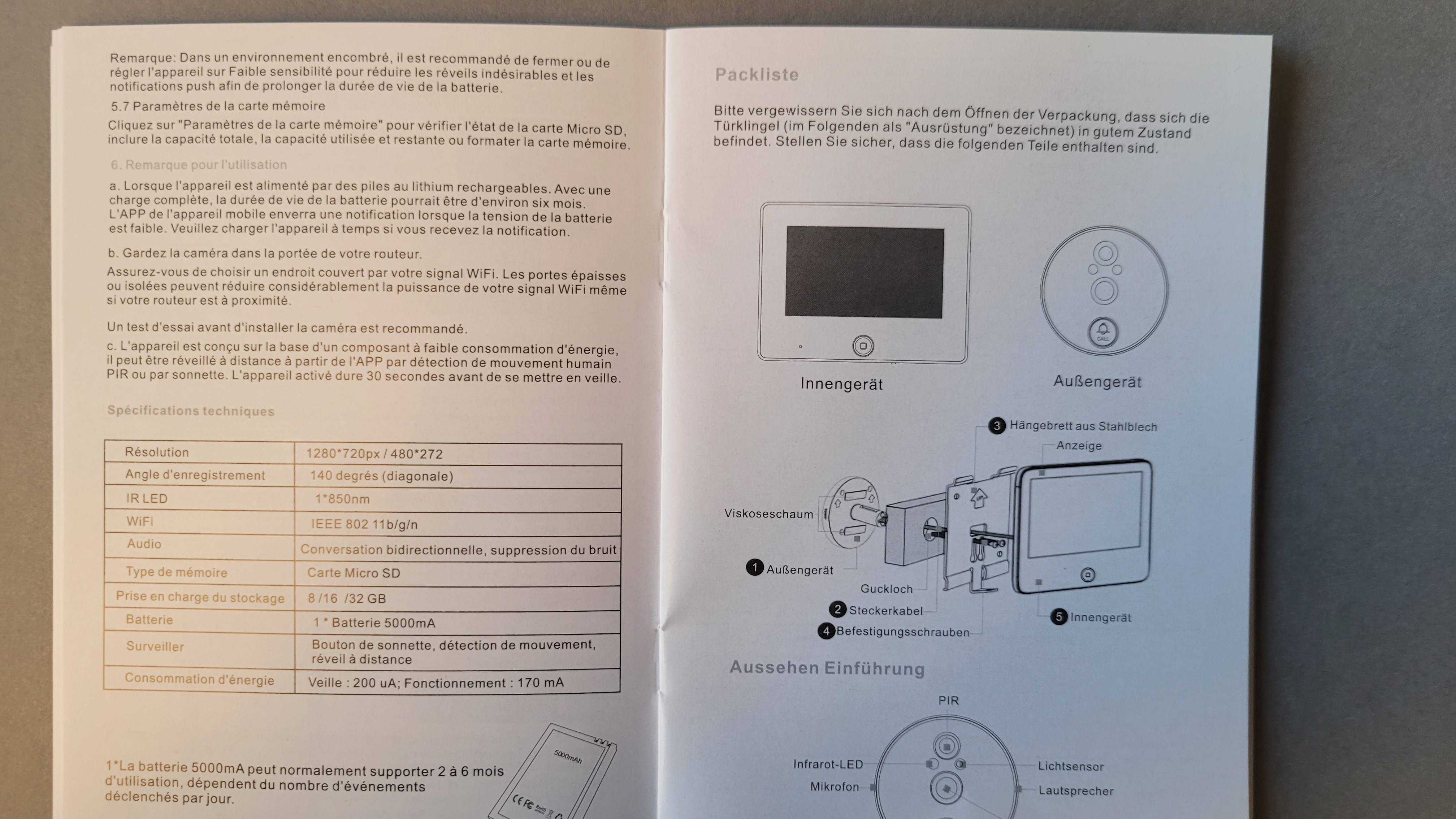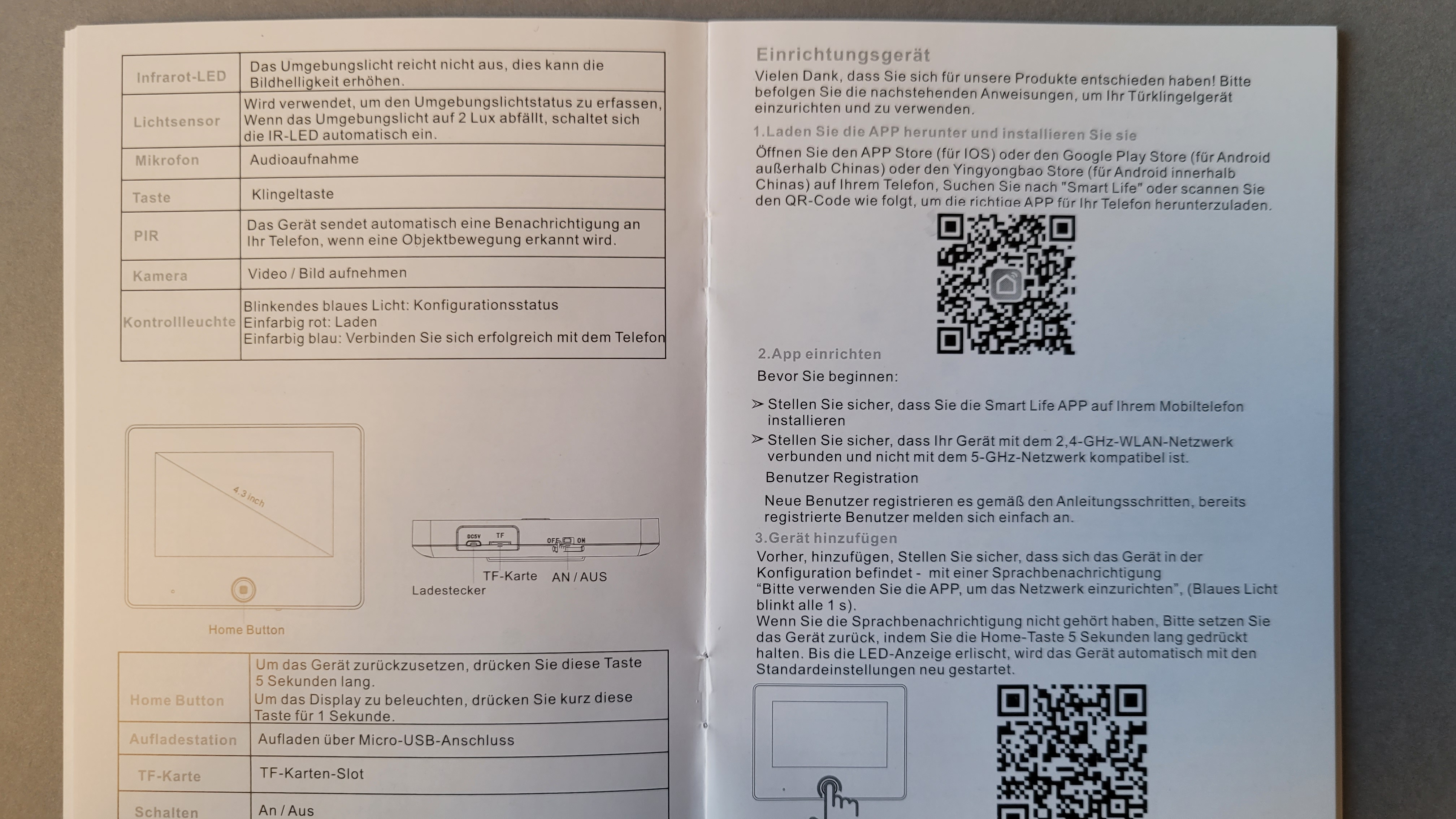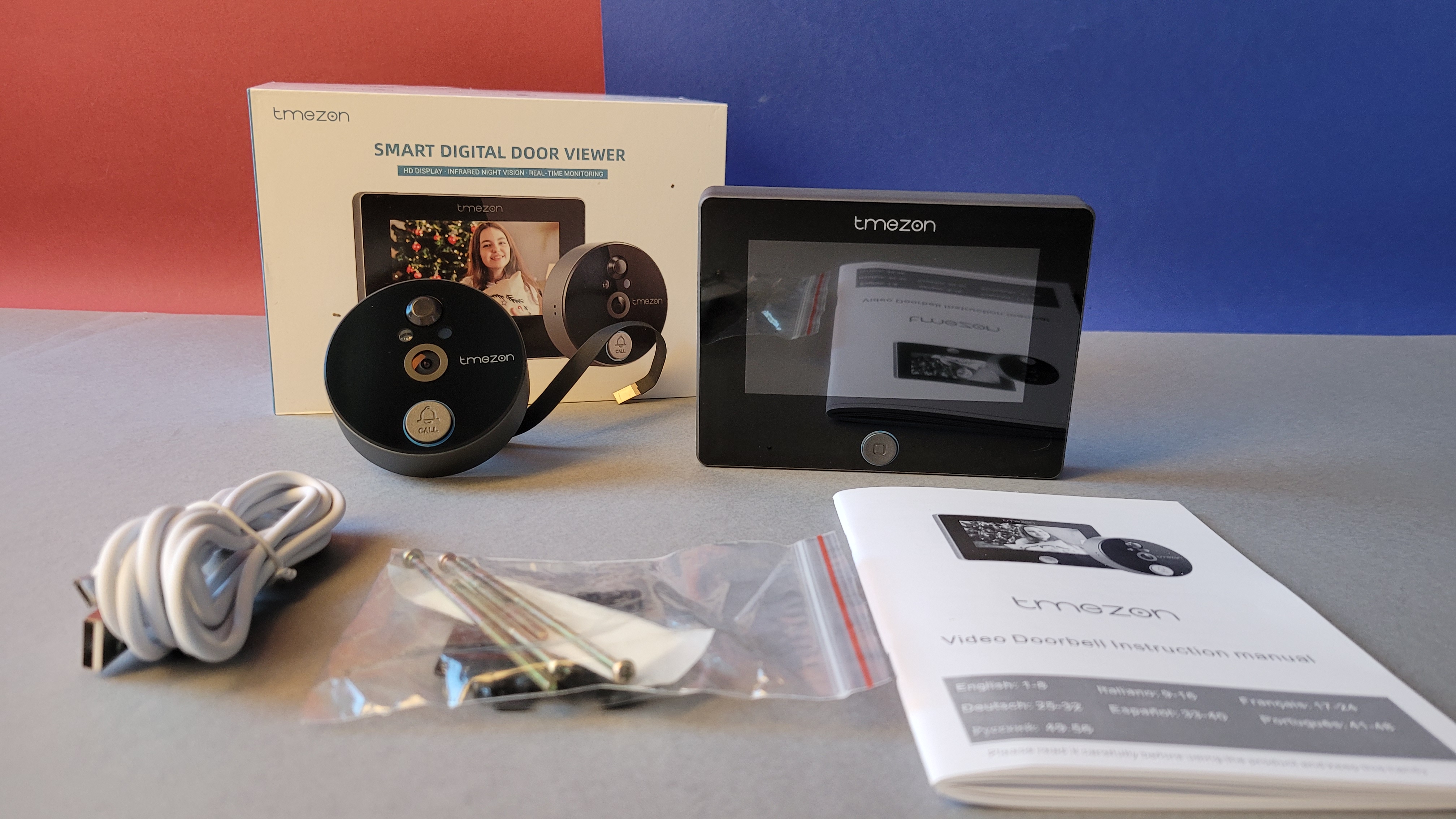 Der Lieferumfang der Tmezon MZ-DV11 besteht aus einer Außeneinheit mit HD-Kamera, Lautsprecher, Bewegungsmelder, Mikrofon, Klingeltaster, Infrarot-LED und Lichtsensor. Das Gehäuse hinterlässt einen etwas klobigen Eindruck, weil Tmezon auf schräg abfallende Seiten, die es ein wenig eleganter wirken ließen, verzichtet. Aus dem Gehäuse verläuft ein Flachbandkabel, das über den Türspion-Kanal geführt Anschluss an das Innen-Display findet. Dieses bietet einen 4,3-Zoll großen Bildschirm, der über die Taste am unteren Rand aktiviert wird. Zudem bietet es an der Unterseite einen Ein- und Ausschalter, sowie einen microSD-Card-Slot und eine Micro-USB-Buchse für das mitgelieferte Ladekabel. Ein Netzteil gehört nicht zum Lieferumfang, dafür aber drei Schraubenpaare mit unterschiedlicher Länge für entsprechend breite Türen. Überraschend ausführlich ist das Handbuch zu dem Gerät, das auch in deutscher Sprache über Montage und App-Anbindung informiert.