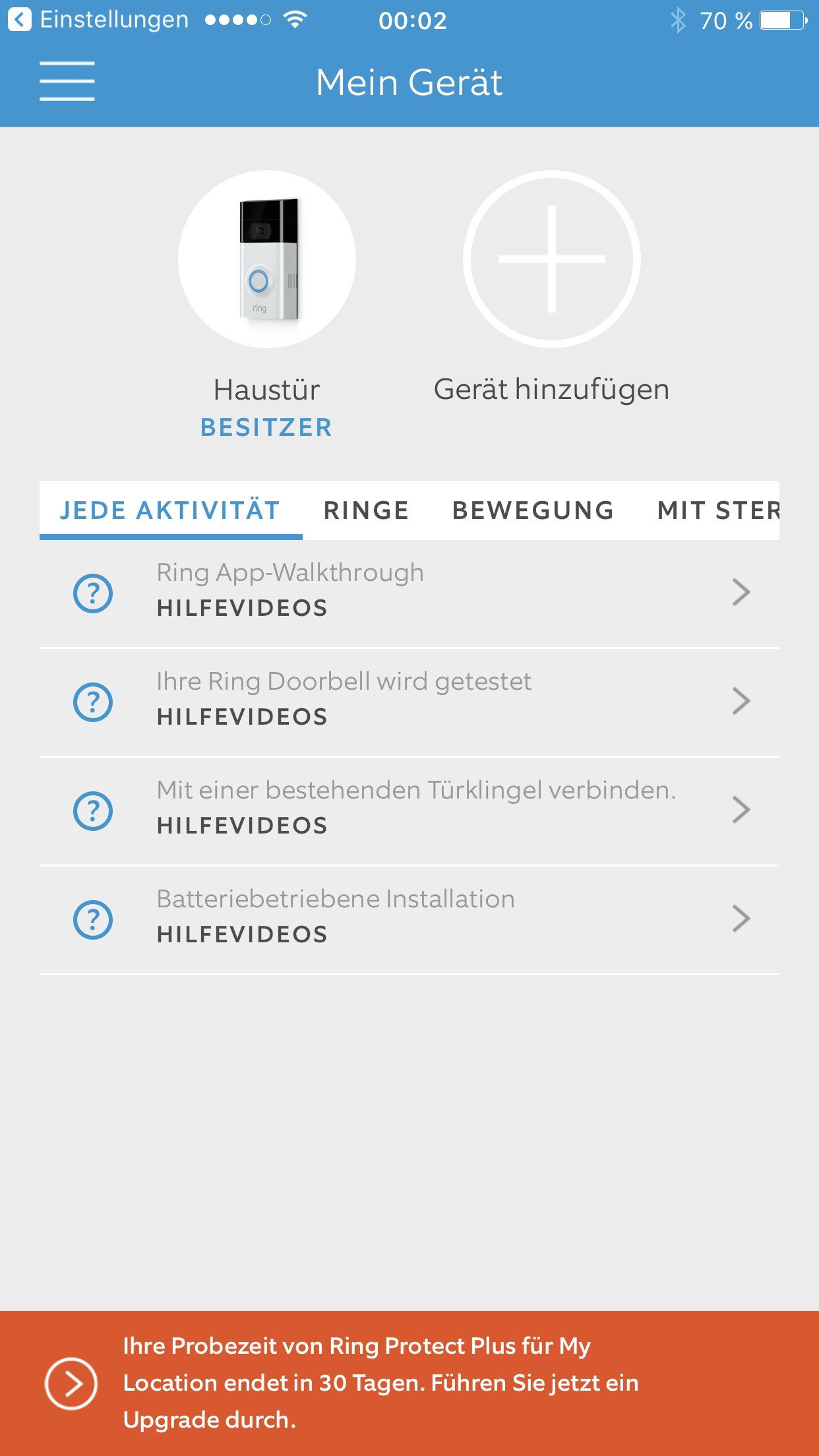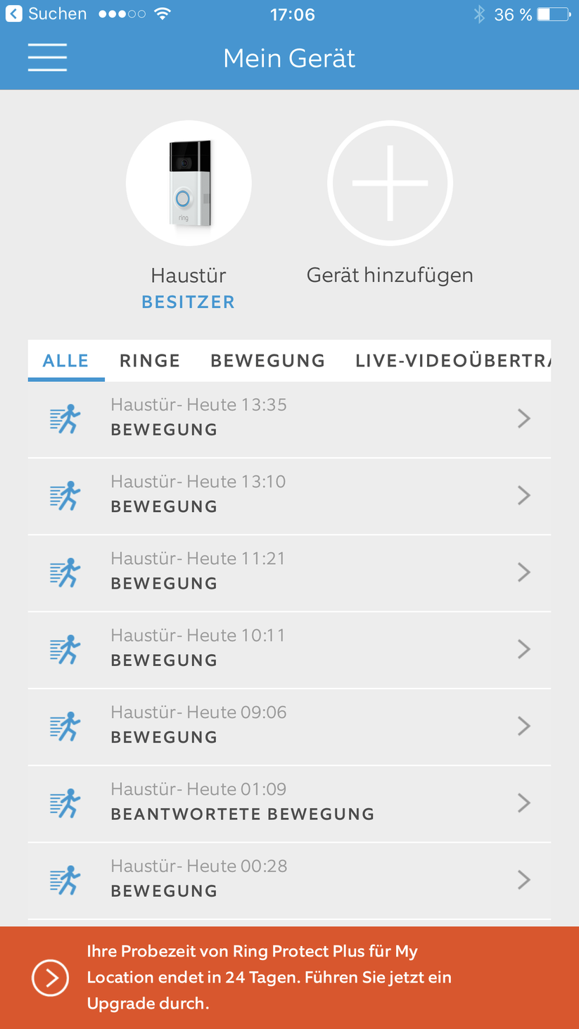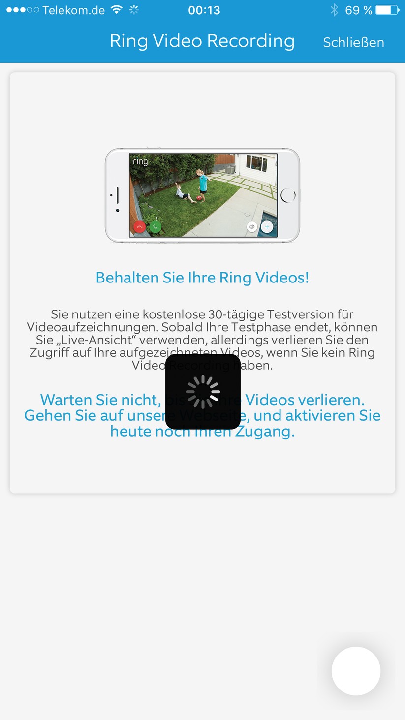 Für 30 Tage nach der Erstinstallation gibt's den Ring-Cloud-Service, danach muss man zahlen. In dem Fall werden Video-Aufnahmen, die sich je nach Einstellung durch Ansprechen des Bewegungsmelders oder durch Druck auf den Knopf aktivieren, auf den Servern des Herstellers gespeichert und lassen sich unterwegs auch mit Verzögerung abrufen. Wer das Abonnement verlängern möchte, zahlt 3 Euro im Monat oder 30 Euro im Jahr. Wer auf den Dienst verzichtet, hat keine Aufzeichnungsmöglichkeit, sondern kann nur das Live-Bild ansehen. Oder, um es deutlich zu sagen: Ohne kostenpflichtigen Cloud-Service verliert die Ring die wichtigsten Funktionen.