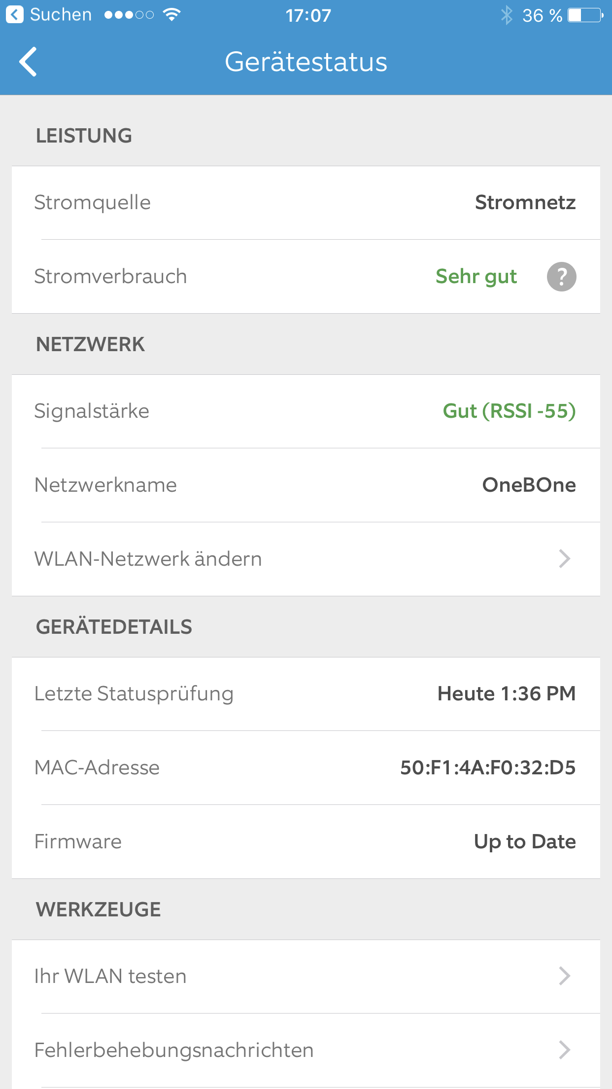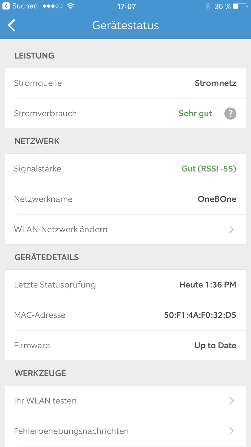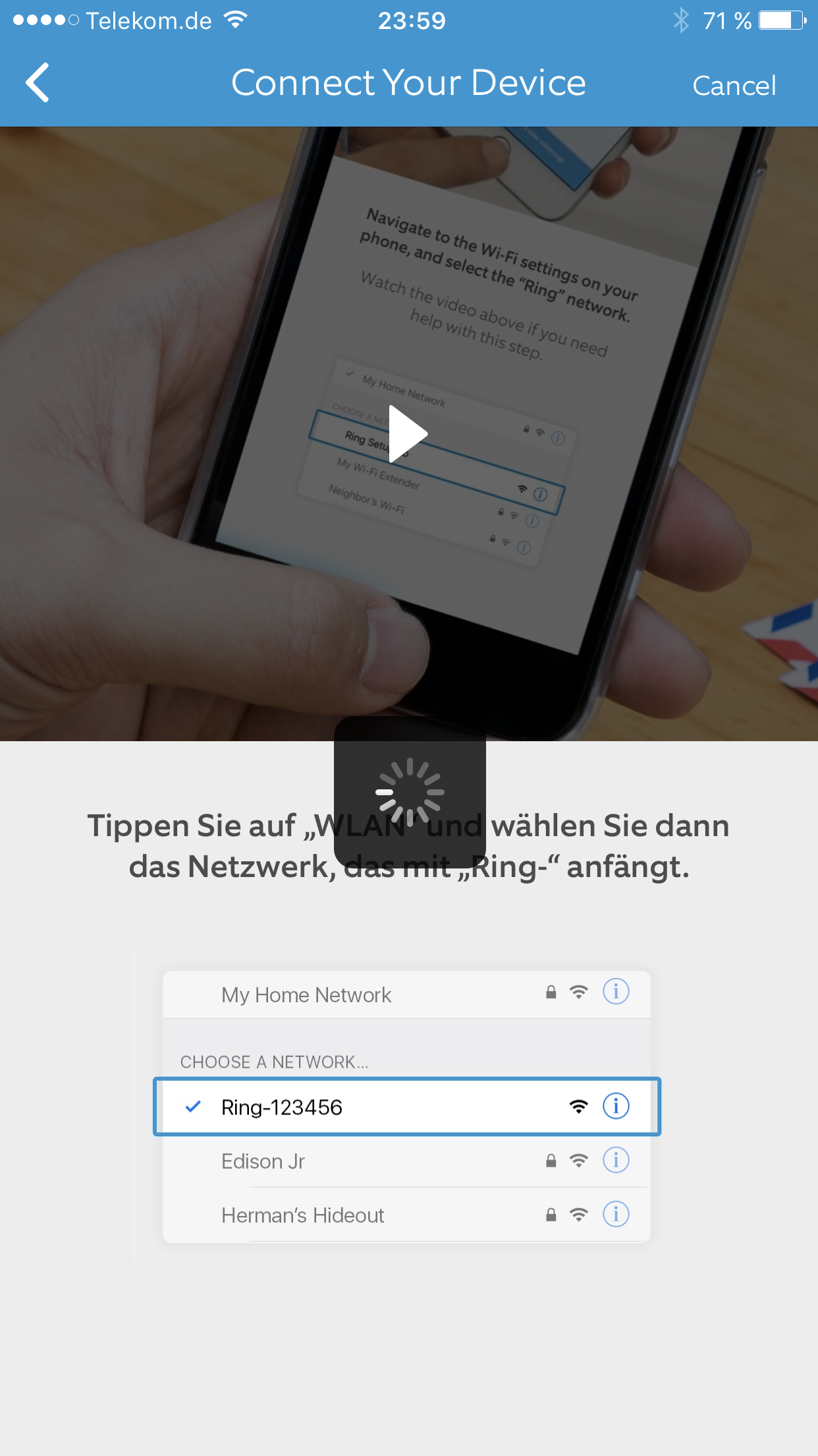 Zunächst sucht die Software nach allen verfügbaren WLAN-Netzen. Man wählt das richtige aus, trägt das Passwort ein. Ring startet neu und verbindet sich, wenn alles glatt gegangen ist, zunächst mit dem hauseigenen Netz und dann mit der Cloud. Das war's eigentlich auch schon.