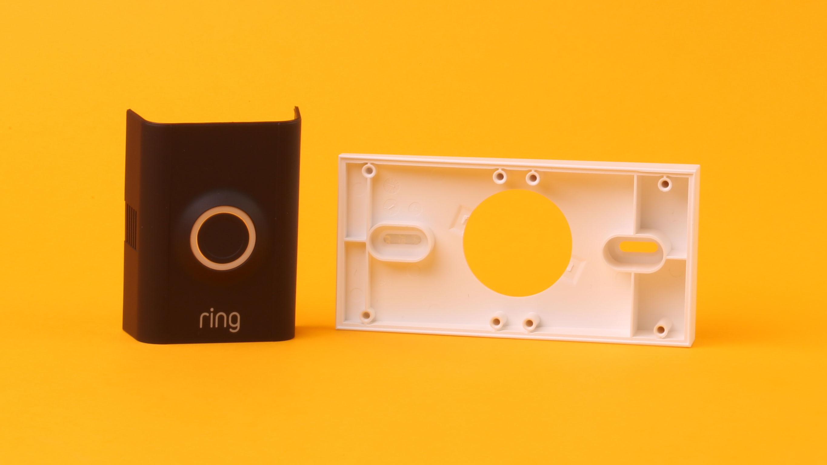 Im Vergleich zu einem normalen Klingeltaster und zur Konkurrenz ist die Ring Video Doorbell 2 vor allem mal ein riesengroßer Klotz. Das rechteckige Gehäuse misst 13 × 6,3 × 2,7 Zentimeter. Weil eine im rechten Winkel zur Wand ausgerichtete Kamera in den meisten Eingangssituationen keinen Sinn macht, legt der Hersteller Montageplatten bei, die die Kamera entweder seitlich oder nach oben und unten neigen. Feine Sache, damit passt die Ring 2 wirklich fast überall – aber trägt eben noch zwei Zentimeter dicker auf.