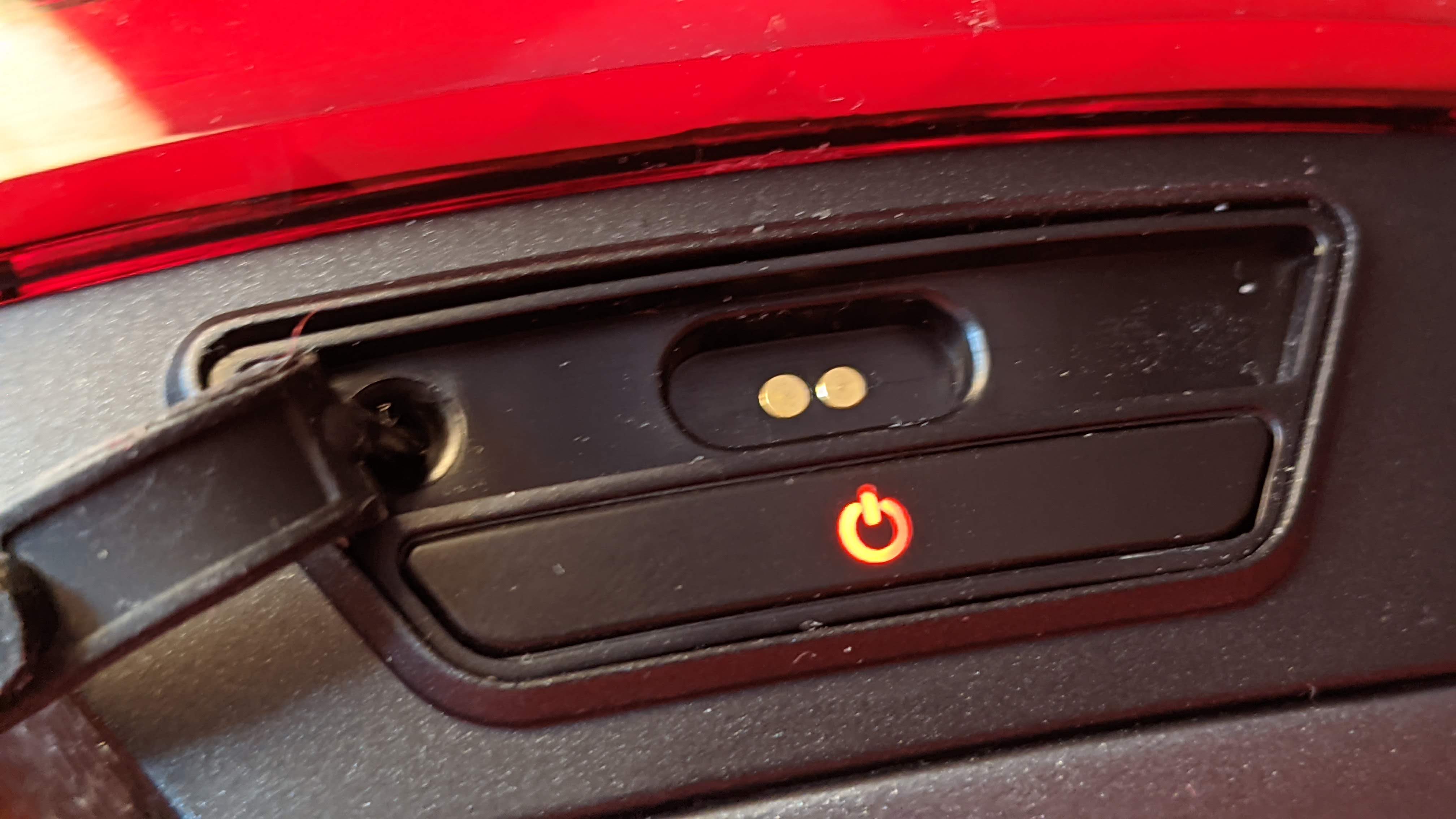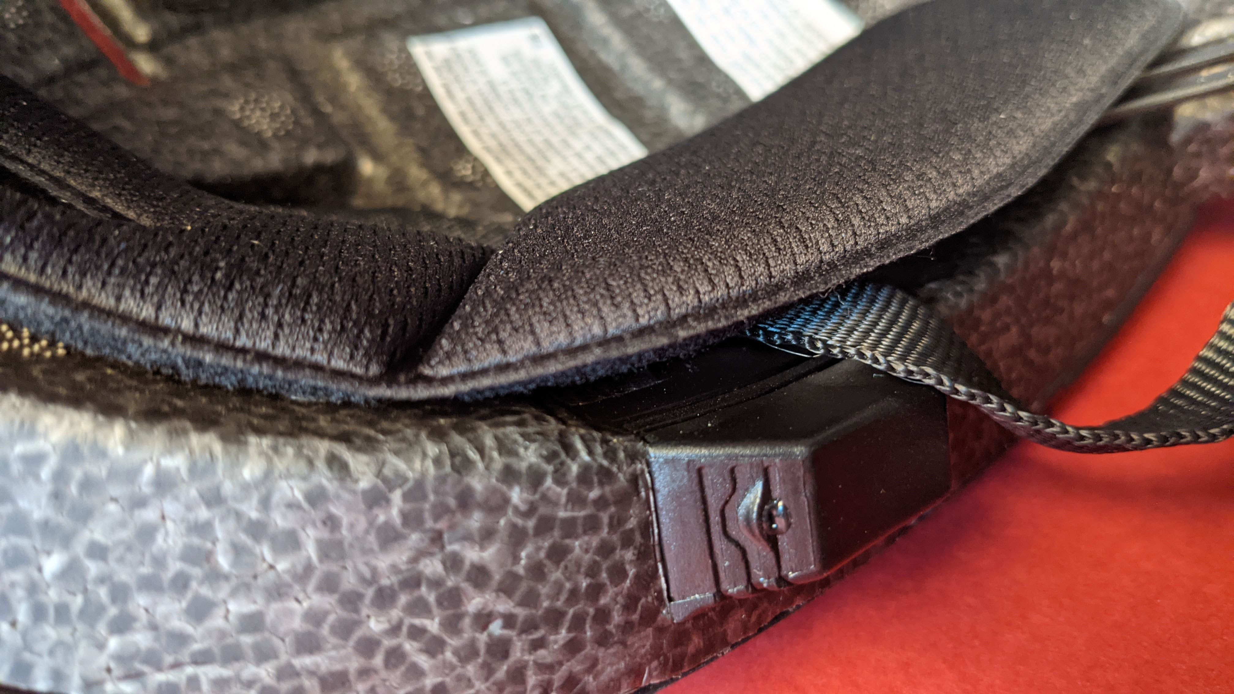 Am hinteren Teil des Helms befindet sich der einzige Knopf zur Bedienung. Leider hat dieser einen etwas unsauberen Druckpunkt. Darüber versteckt sich hinter einer Klappe der Ladeanschluss. Hier hat Livall weder auf einen modernen USB-C-Port noch auf den Micro-USB-Standard gesetzt. Stattdessen wird ein proprietärer Adapter benötigt, den man zum Laden immer dabeihaben muss. Bei Verlust des Adapters hat man ein Problem.