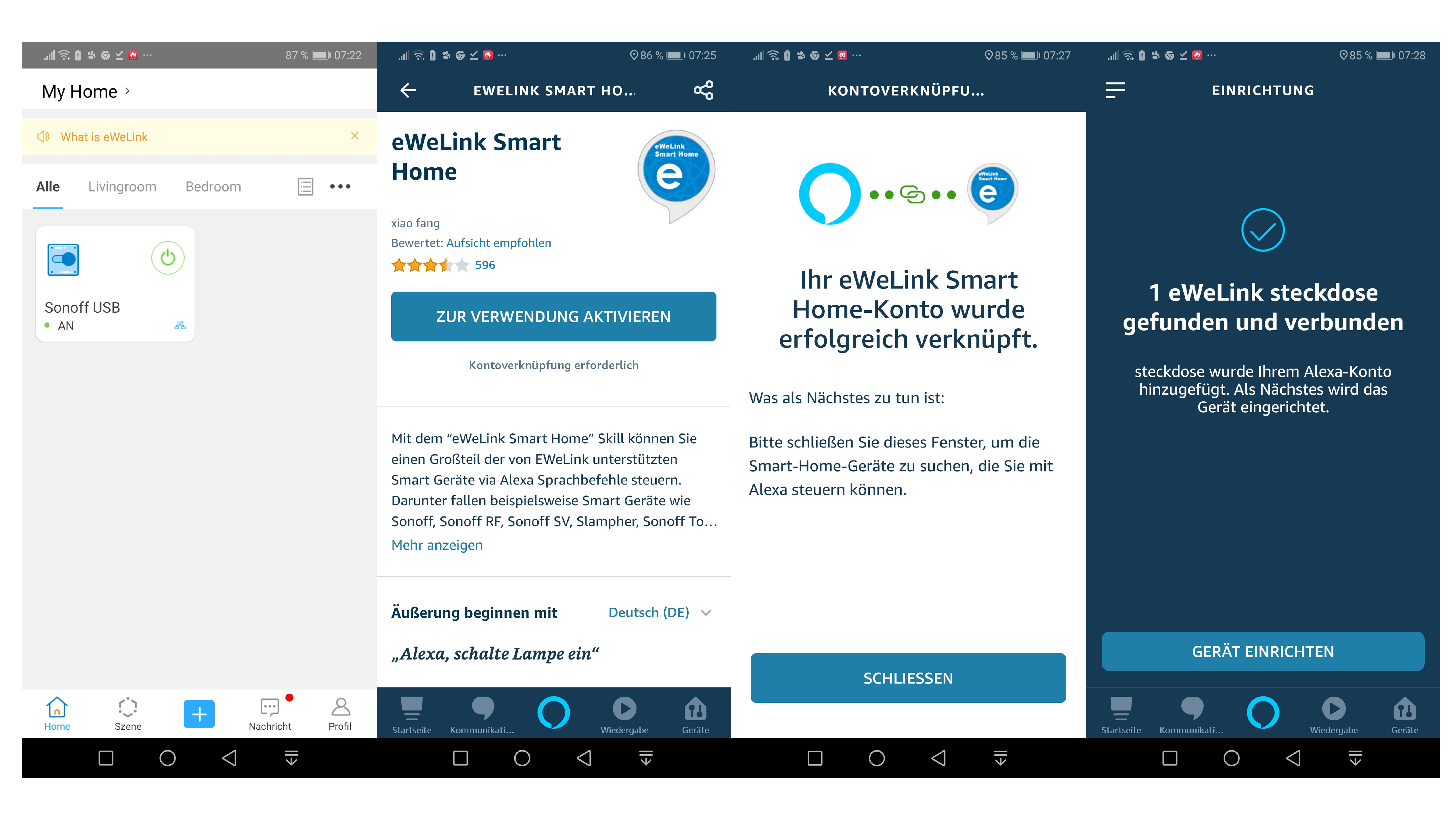 Die Einrichtung funktioniert erfreulich problemlos. Die eWeLink-App ist auf Deutsch verfügbar, nur manchmal findet sich ein Begriff, der nicht aus dem Englischen übersetzt wurde. Dem Käufer sollte allerdings von vornherein klar sein, dass das Deutsch zum Teil hölzern wirkt und sich nicht immer direkt erschließt, welche Funktion sich hinter einer bestimmten Schaltfläche versteckt. Mit rudimentären Grundkenntnissen von WLAN und Smart-Home klappt die Einrichtung aber auf Anhieb, sofern ein 2,4-GHz-WLAN verfügbar ist. 5-Ghz-Verbindungen sind wie erwähnt nicht möglich.