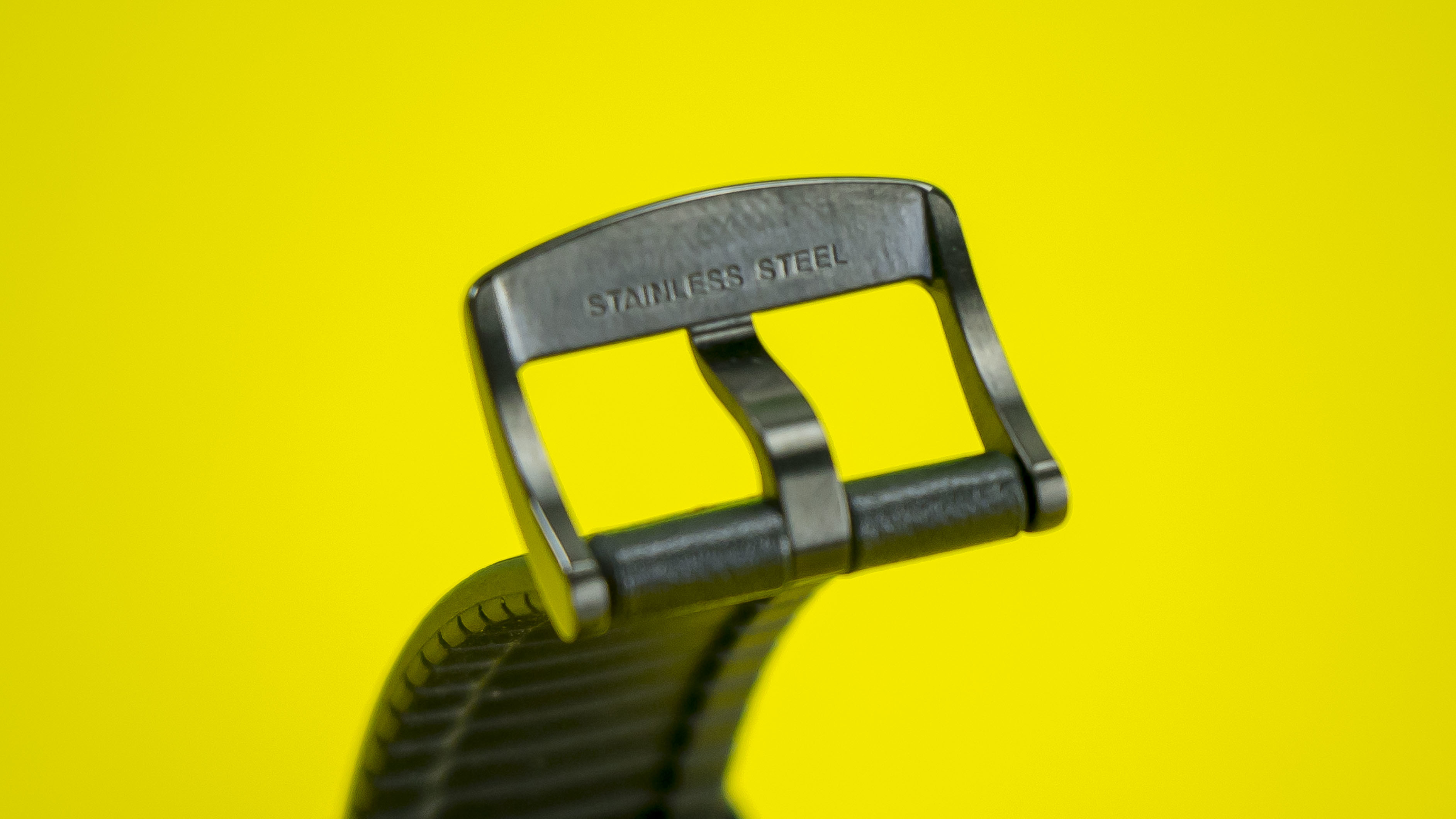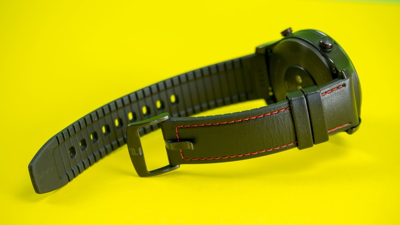 Das mitgegebene Armband nennt sich Hybrid , vermutlich wegen der unterschiedlichen Materialien: innen ist es aus weichem und hypoallergenem Kautschuk im geriffelten Design und außen aus Leder mit roter Naht. Schick sieht’s aus, fast wie das Sportlenkrad eines 911er!