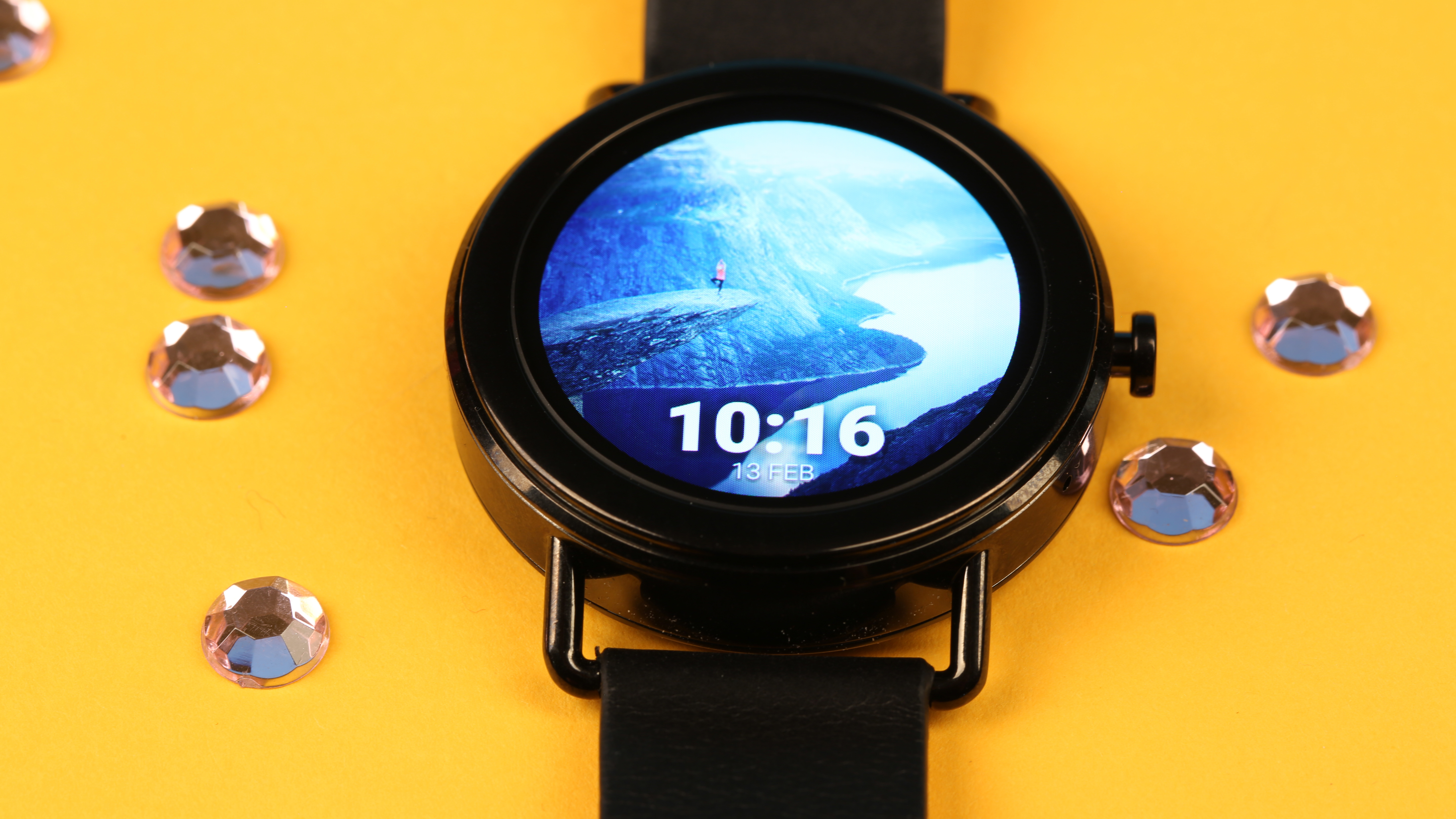 Das runde Gehäuse verfügt über einen Drucktaster und den von Fossil-Smartwatches bekannten Schnellverschluss für Wechselarmbänder. Das Edelstahlgehäuse misst 42 Millimeter im Durchmesser und ist 12 Millimeter dick. Die Falster trägt trotz des recht hohen Gewichts nicht auf und sitzt bequem am Handgelenk. Der Tragekomfort und die Verarbeitung gefallen uns gut. Die vorinstallierten Ziffernblätter sind ebenso schlicht gehalten wie das Uhrengehäuse selbst. Wer es auffälliger und bunter mag, kann jederzeit eigene Skins hinzufügen und diese nach seinen Vorstellungen individualisieren.