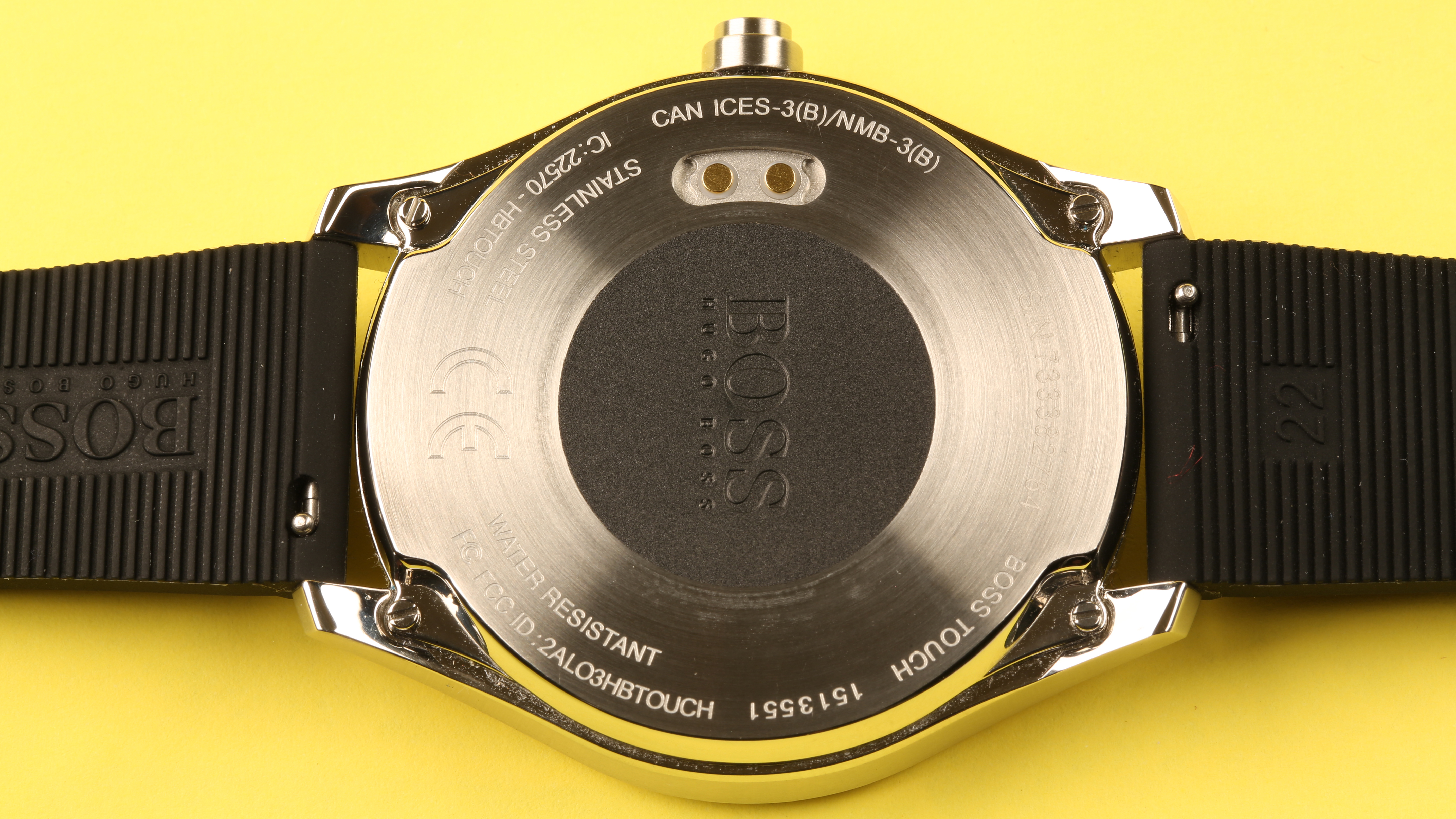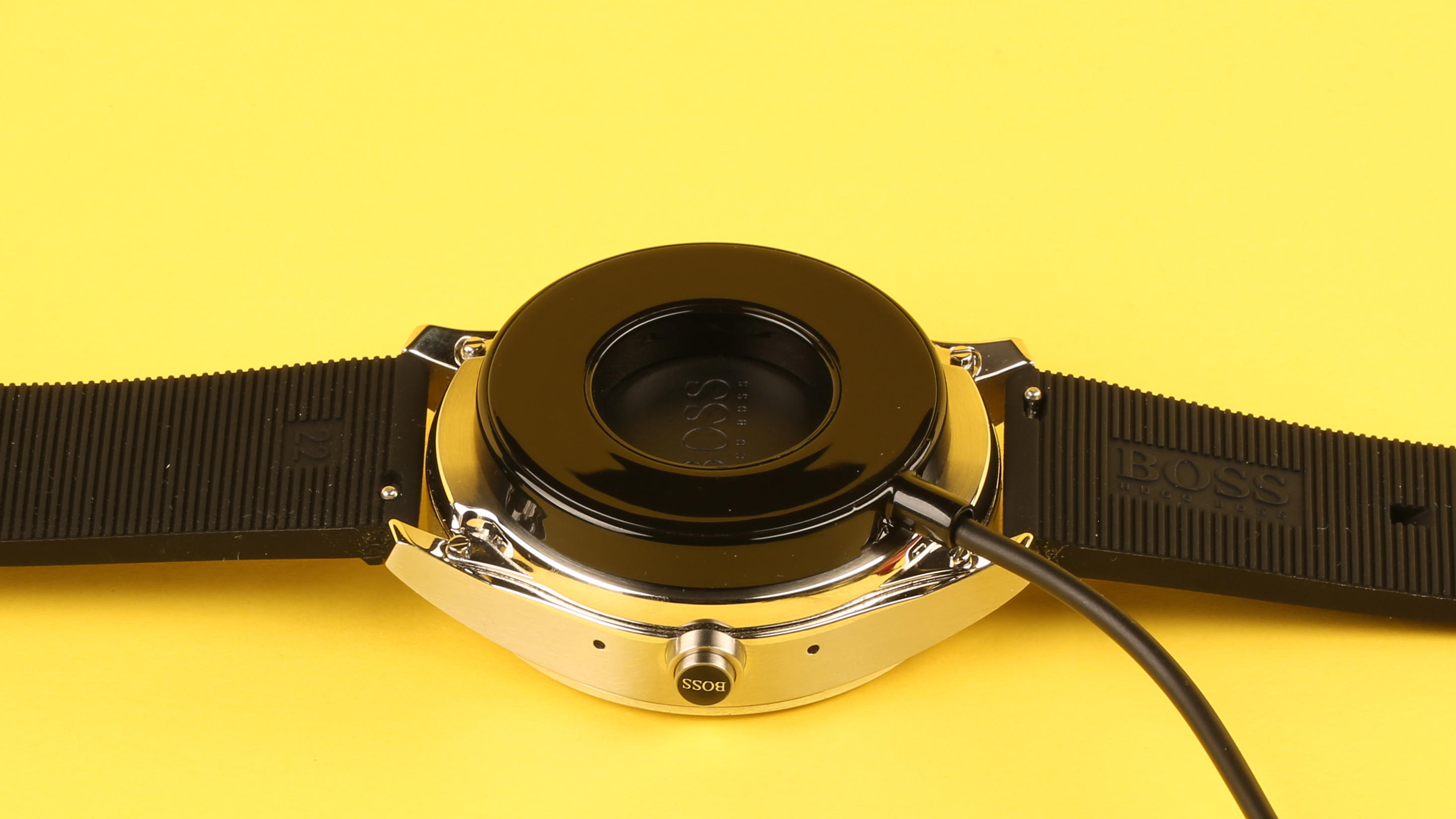 Auf der Unterseite des Gehäuses befinden sich zwei Ladekontakte. Zum Aufladen des Akkus wird das magnetische Ende des Ladekabels einfach aufgelegt. Auf drahtloses Ladung per Induktionsspule verzichtet Hugo Boss. Grundsätzlich funktioniert das auch; die Langzeiterfahrung mit Kontaktflächen anderer Produkte zeigt allerdings, dass sie nicht wartungsfrei sind. In der Praxis setzt sich hier Dreck an, manche neigen auch in Kombination mit Körperschweiß zu Korrosion – dann gibt's Probleme.