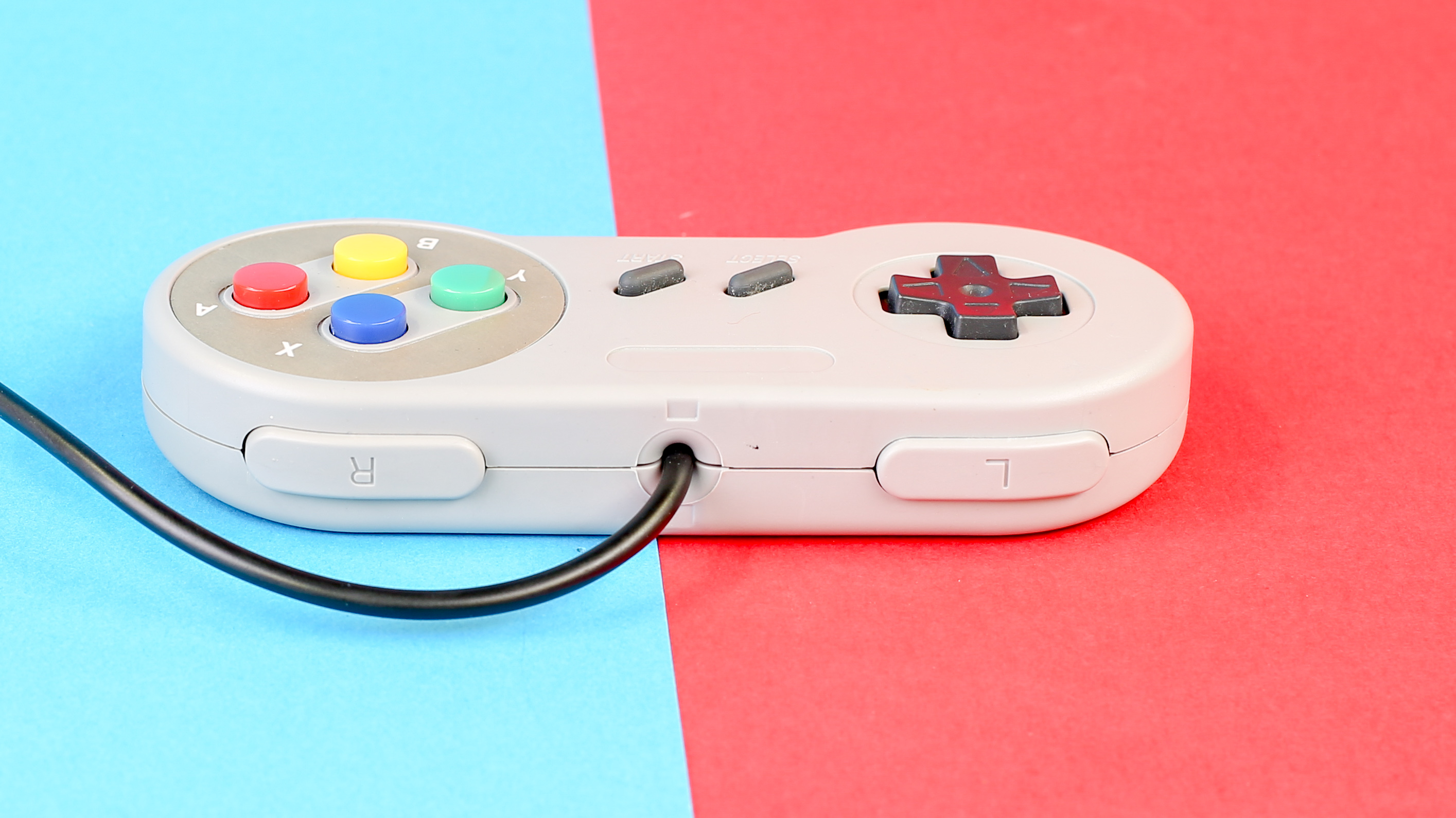 Für alle älteren Gamer ruft der Controller sofort Erinnerungen wach: Er sieht aus wie das SNES-Gamepad, Tasten, Farben und Form sind genau gleich – oder zumindest so nahe am Original, dass man sich sofort wohl fühlt.