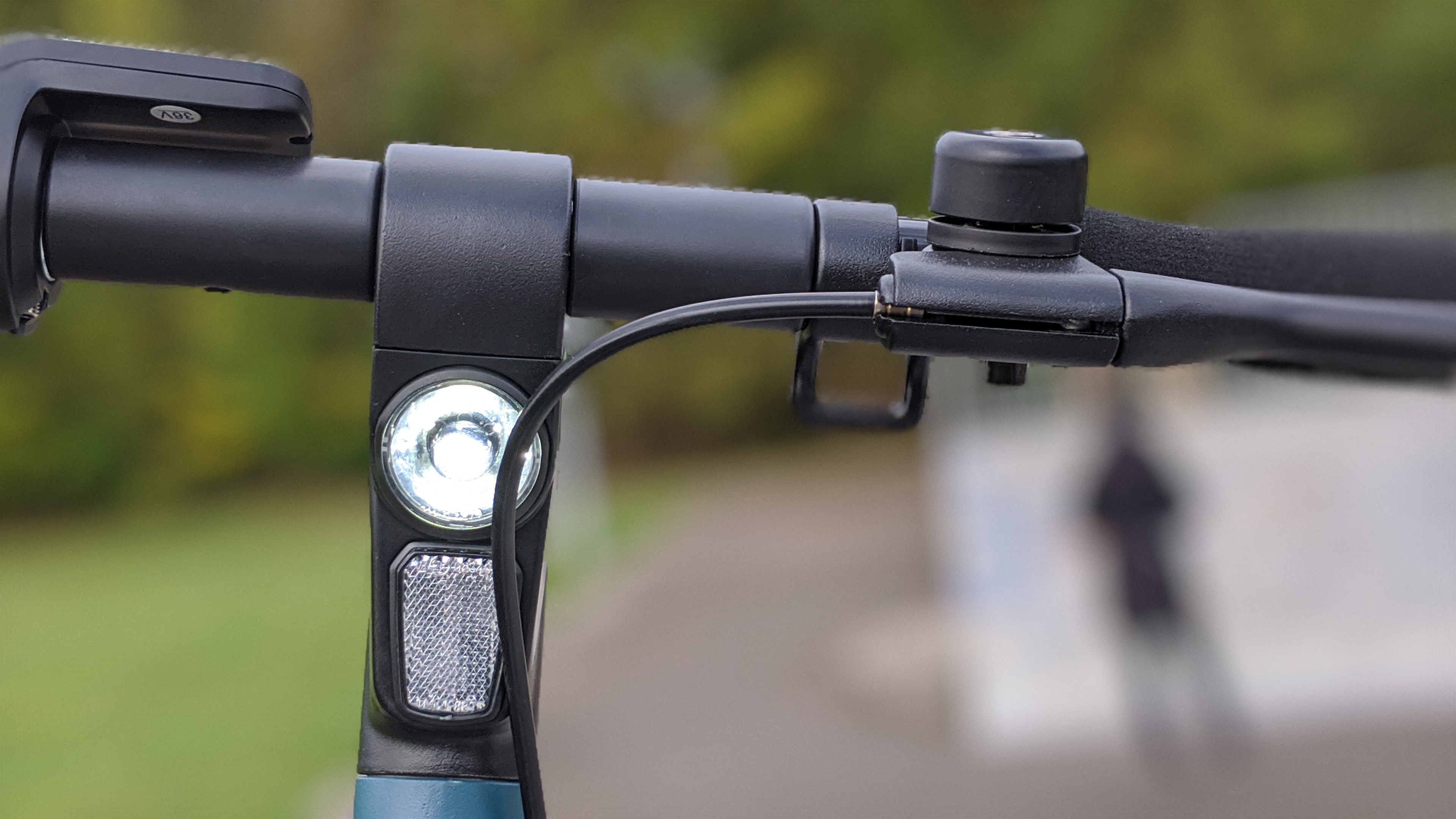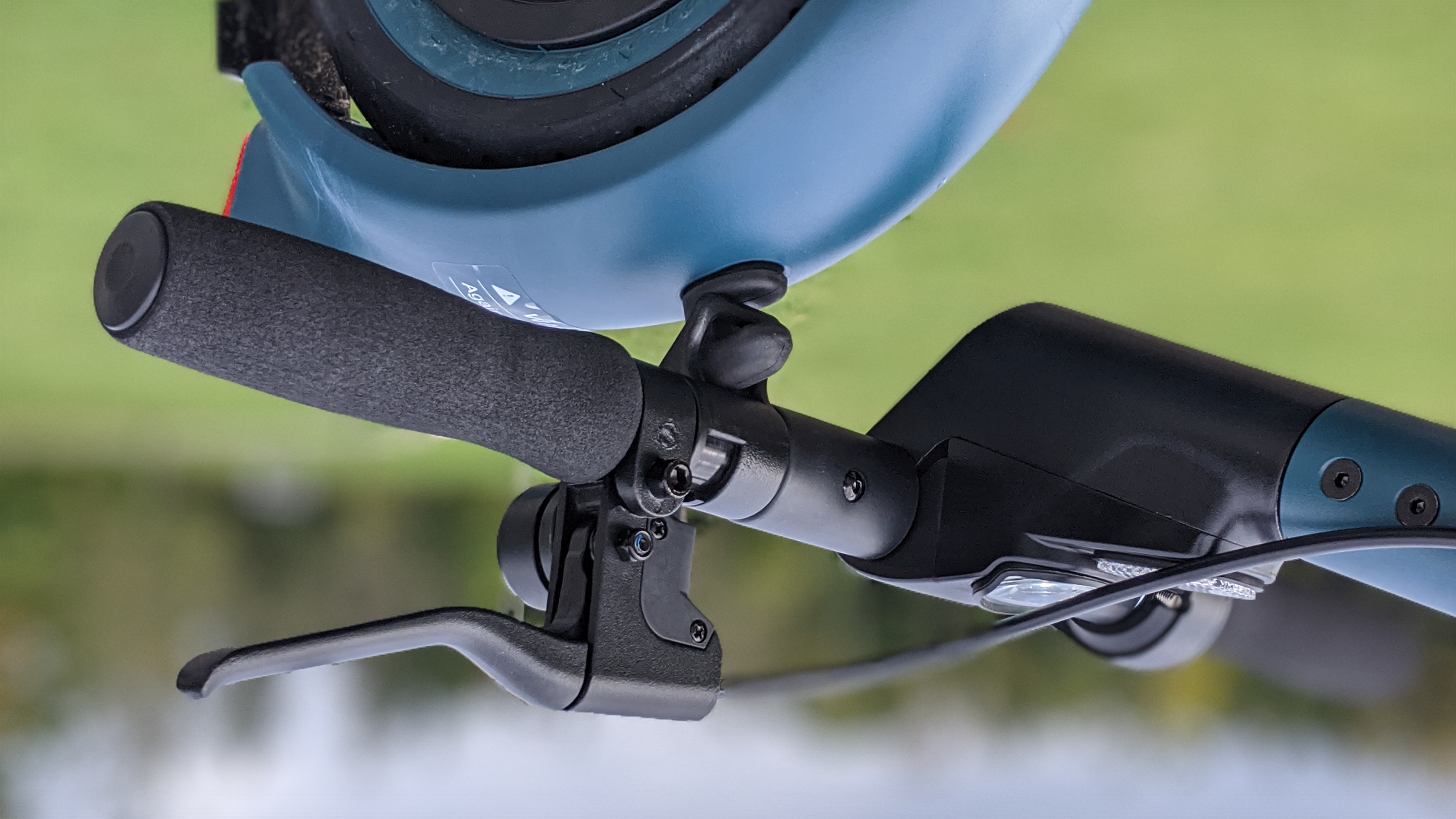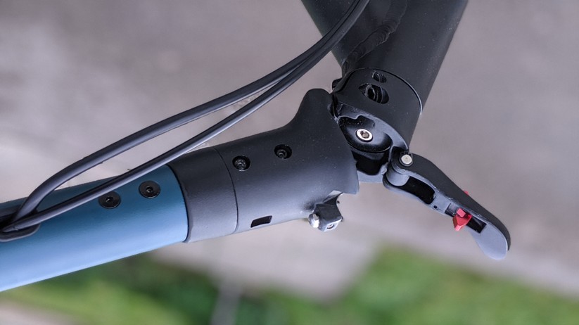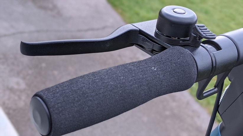 Am Lenker befindet sich auf der linken Seite der Handzug für die Rückbremse, direkt darüber eine kleine, gut hörbare Klingel. Auf der rechten Seite sitzt das Display mit zwei Knöpfen. Der eine schaltet den E-Scooter, der andere das Licht ein und aus. Das kleine, hintergrundbeleuchtete LC-Display zeigt dem Fahrer auch bei direkter Sonneneinstrahlung gut lesbar unter anderem die aktuelle Geschwindigkeit sowie den Akkuladestand an. Rechts neben den Display sitzt der obligatorische Daumenhebel zum Beschleunigen des Rollers.