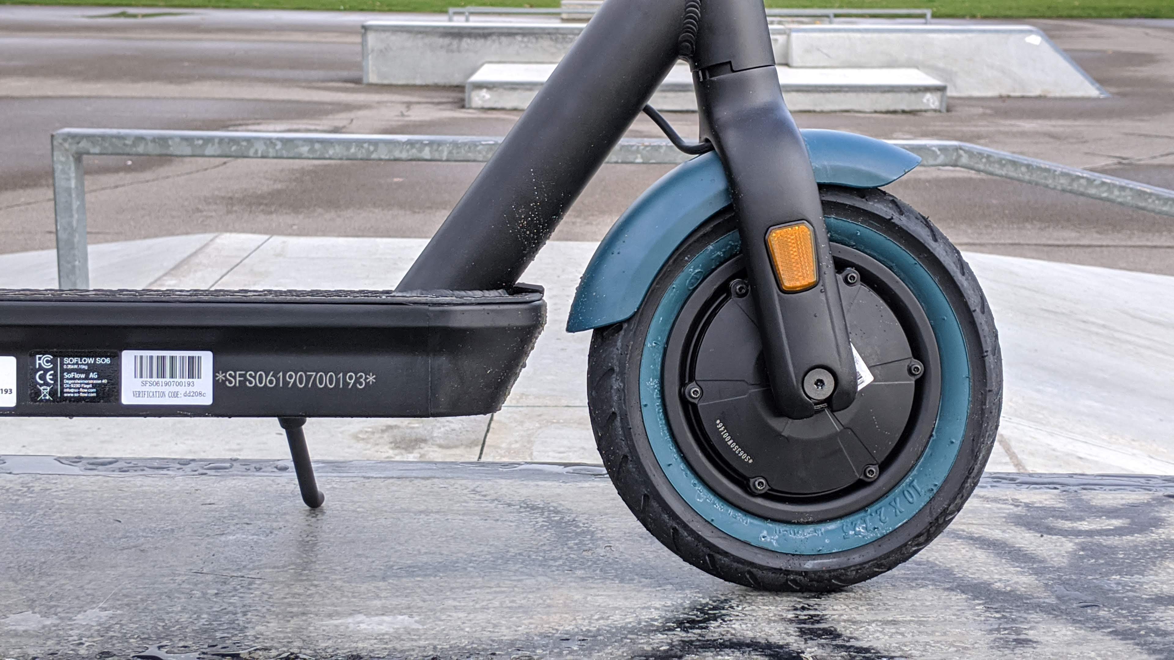 Das Fahrverhalten des Soflow ist dank der 10 Zoll großen Gummireifen in Ordnung, leichte Unebenheiten stecken sie locker weg. Achtung: Im Auslieferungszustand sind sie leer, eine Luftpumpe ist nicht dabei. Dank der recht hohen Unterbodenfreiheit von gut 9 cm nimmt er auch normal hohe Bordsteine, ohne dabei aufzusetzen. Bei längeren Fahrten nervt auch hier der Gashebel, der für eine konstante Fahrt dauerhaft nach unten gedrückt werden muss. Das schmerzt wie bei vielen E-Scootern mit der Zeit am Daumen. Der Rollwiderstand des Soflow S06 ist recht hoch, dennoch kann man ihn nötigenfalls auch bei leerem Akku wie einen normaler Scooter fahren.
