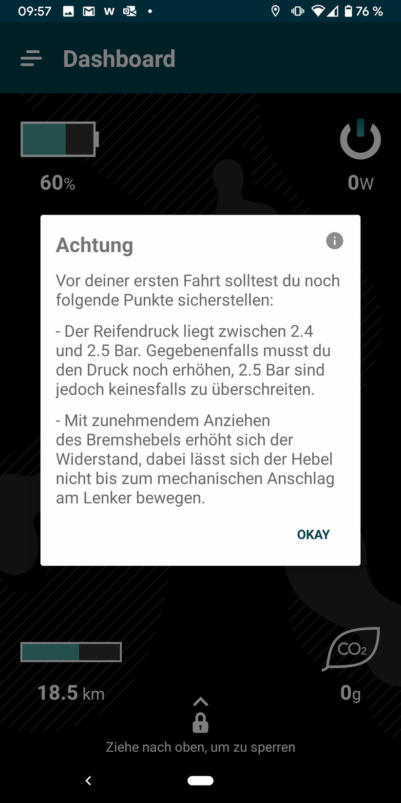Wischt der Nutzer im Hauptmenü der App von unten nach oben, aktiviert er die elektronische Vorderradbremse am E-Scooter. Das soll Diebe abschrecken, tut es aber nur sehr eingeschränkt: Der Dieb muss den E-Roller einfach per Tastendruck ausschalten, schon deaktiviert sich auch die Bremse. Schaltet man den Scooter an, ist sie aber wieder aktiv.