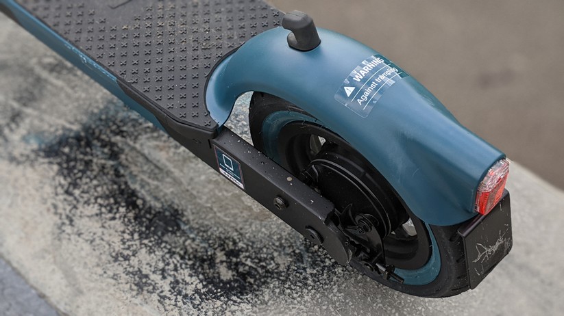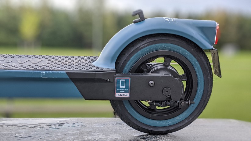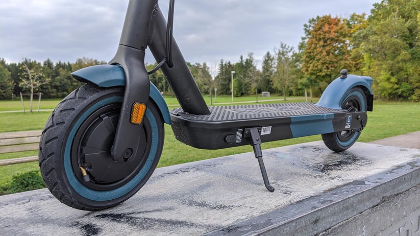 Auf der mit 49 × 15 cm ausreichend große Trittfläche sorgt eine Gummierung für einen guten Halt. Der Fahrer darf bis zu 120 kg wiegen – das ist vergleichsweise viel, der fast 2000 Euro teure Metz Moover (Testbericht) erlaubt nur 94 kg Zuladung. Am Schutzblech des Rückrads hängt hinten mittig die Fläche für das Versicherungszeichen, auf der Oberseite des Schutzblechs sitzt ein kleiner Gummihaken, der an der Gegenstelle am Lenker einrastet, um den Roller im zusammengeklappten Zustand tragen zu können.