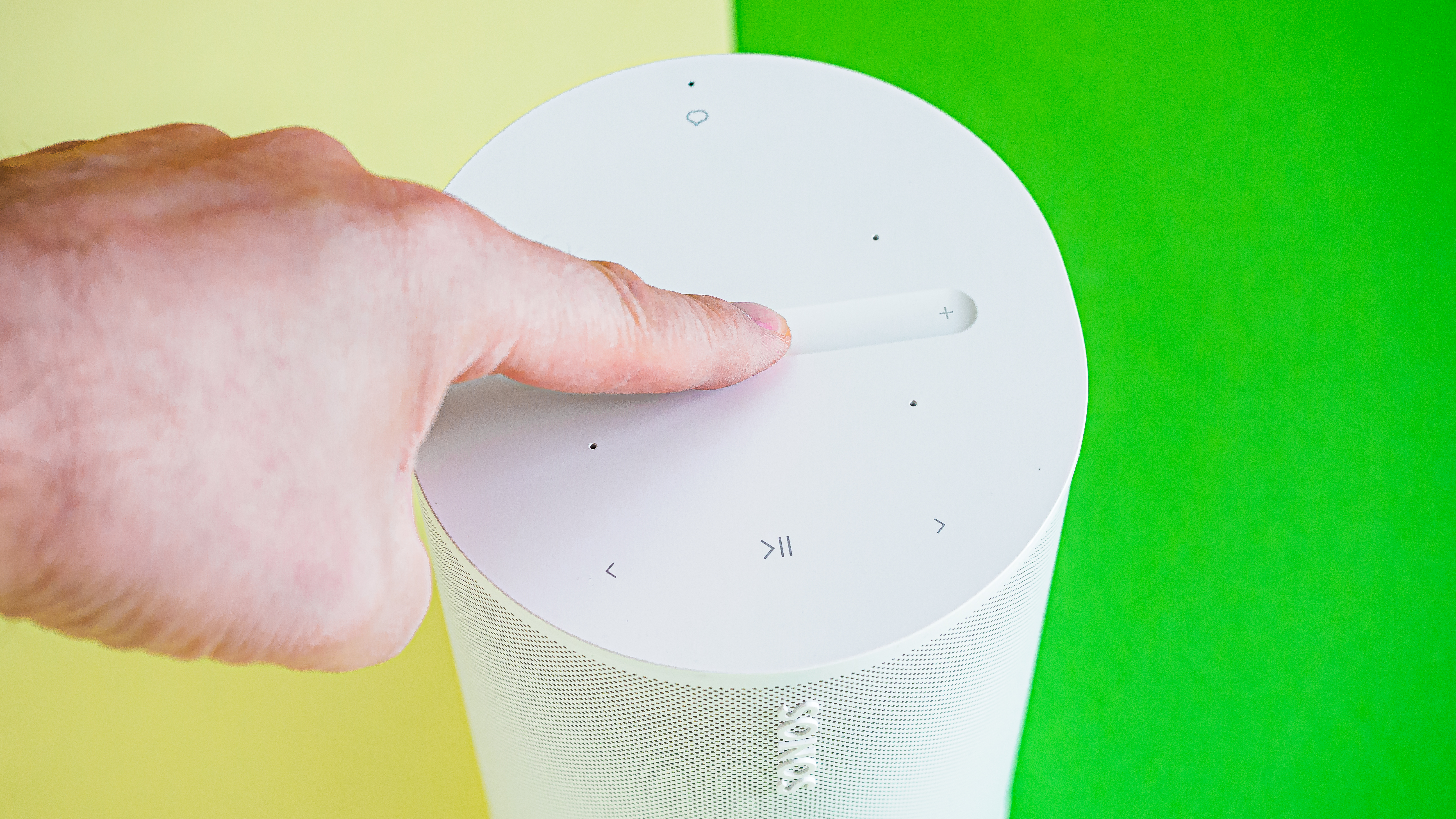 Die Kopplung mit Bluetooth ermöglicht eine separate Taste auf der Gehäuserückseite des Sonos Era 100. Als weitere Bedienelemente sind auf der Deckplatte Sensortasten für Play und Pause, für Vor und Zurück sowie für die Lautstärke zu finden. Prima, dass Sonos Lautstärke und Skipping nun trennt und nicht mehr in Multifunktionstasten bündelt. Das vereinfacht die Bedienung.