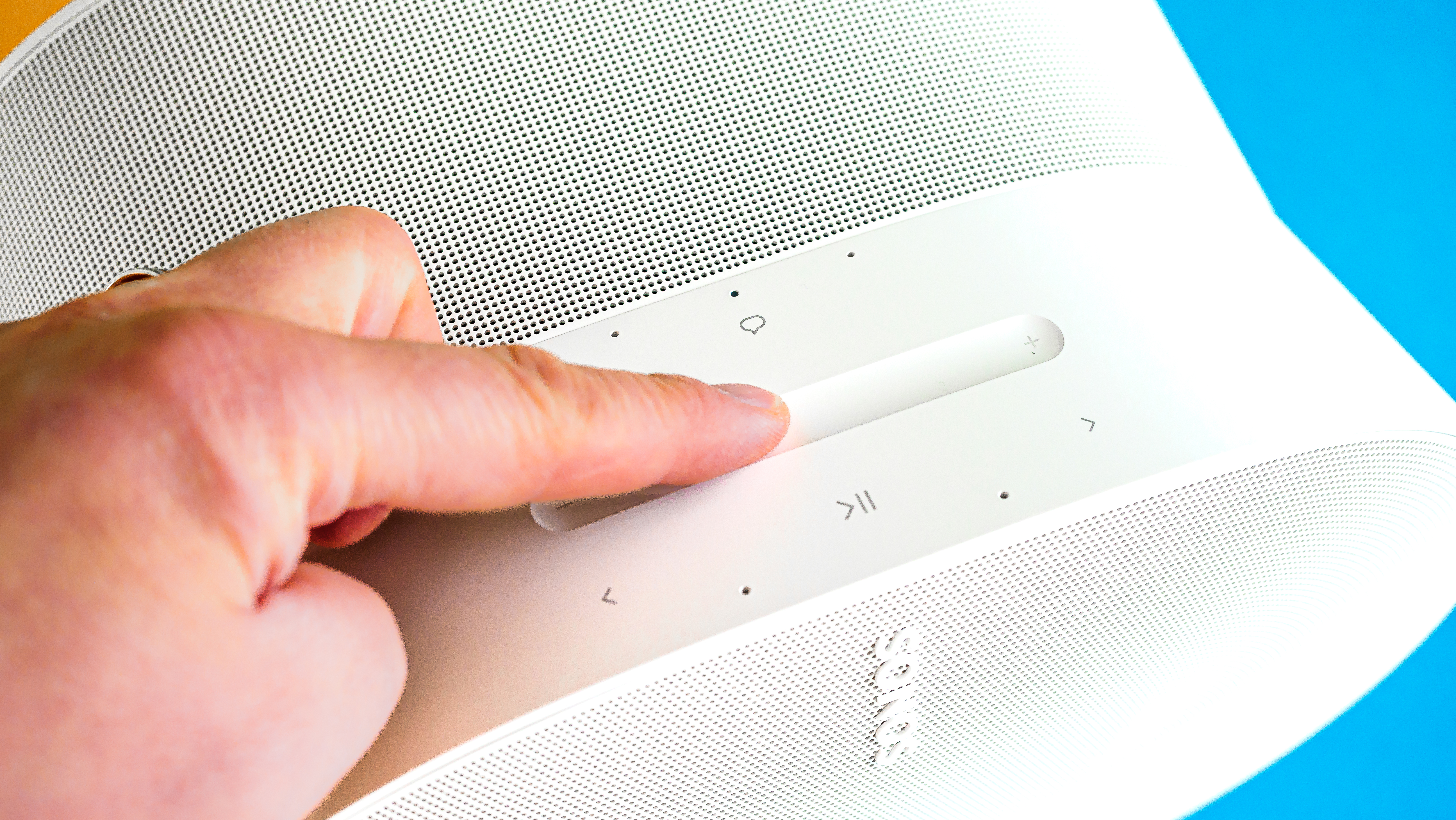 Direkt am Lautsprechergehäuse lässt sich zwar keine Musik auswählen, aber zumindest grundlegend steuern. Die Deckplatte des Era 300 verfügt über Sensortasten für Play und Pause, für Vor und Zurück und für die Lautstärke. Wir empfinden es als Erleichterung, dass Sonos Lautstärke und Skipping trennt. Bei bisherigen Modellen kommen dafür Multifunktionstasten zum Einsatz. Beim Era 300 – und auch beim Era 100 – gelingt der Zugriff direkter und damit schneller.