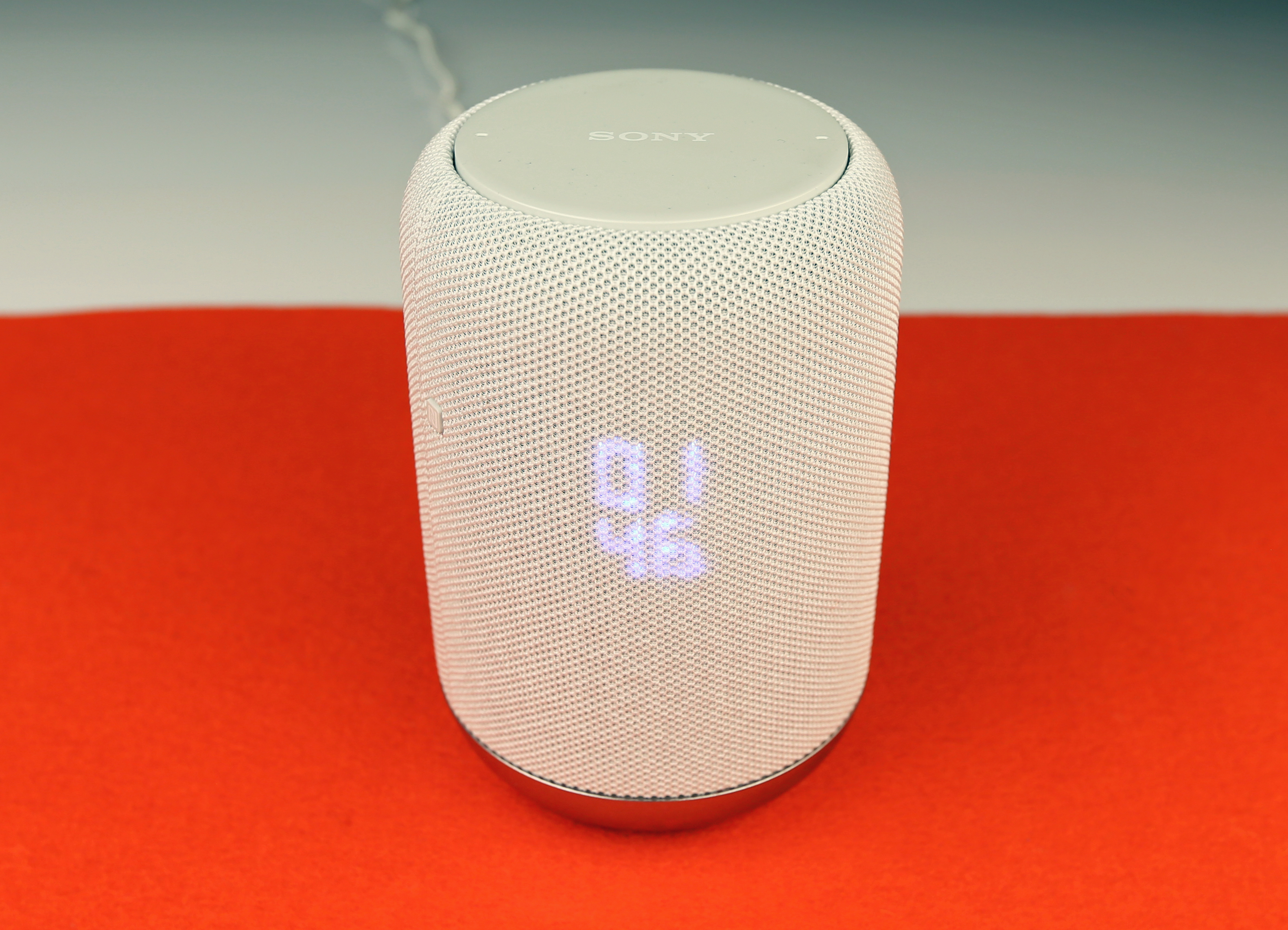 Der 360-Grad-Lautsprecher von Sony hat eine Bauhöhe von 16 Zentimetern und einen Durchmesser von 11 Zentimetern, damit ist er ein kleines Stückchen größer als der Echo 2 von Amazon (Testbericht) . Das Gewicht liegt mit knapp 750 Gramm unter dem des Amazon-Lautsprechers. Die Box ist mit Stoff überzogen und hat einen chromfarbenen Standfuß. Auf der Vorderseite gibt es eine durch den Bezug leuchtende zweizeilige Anzeige für die Uhrzeit. Am Standfuss sitzen ein Bedientaster für Bluetooth und ein Taster, um die Mikrofone des Speakers zu deaktivieren.