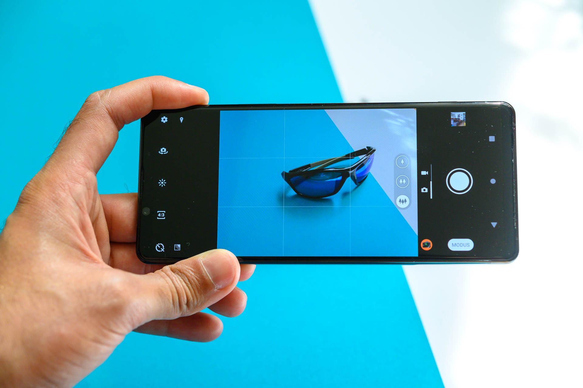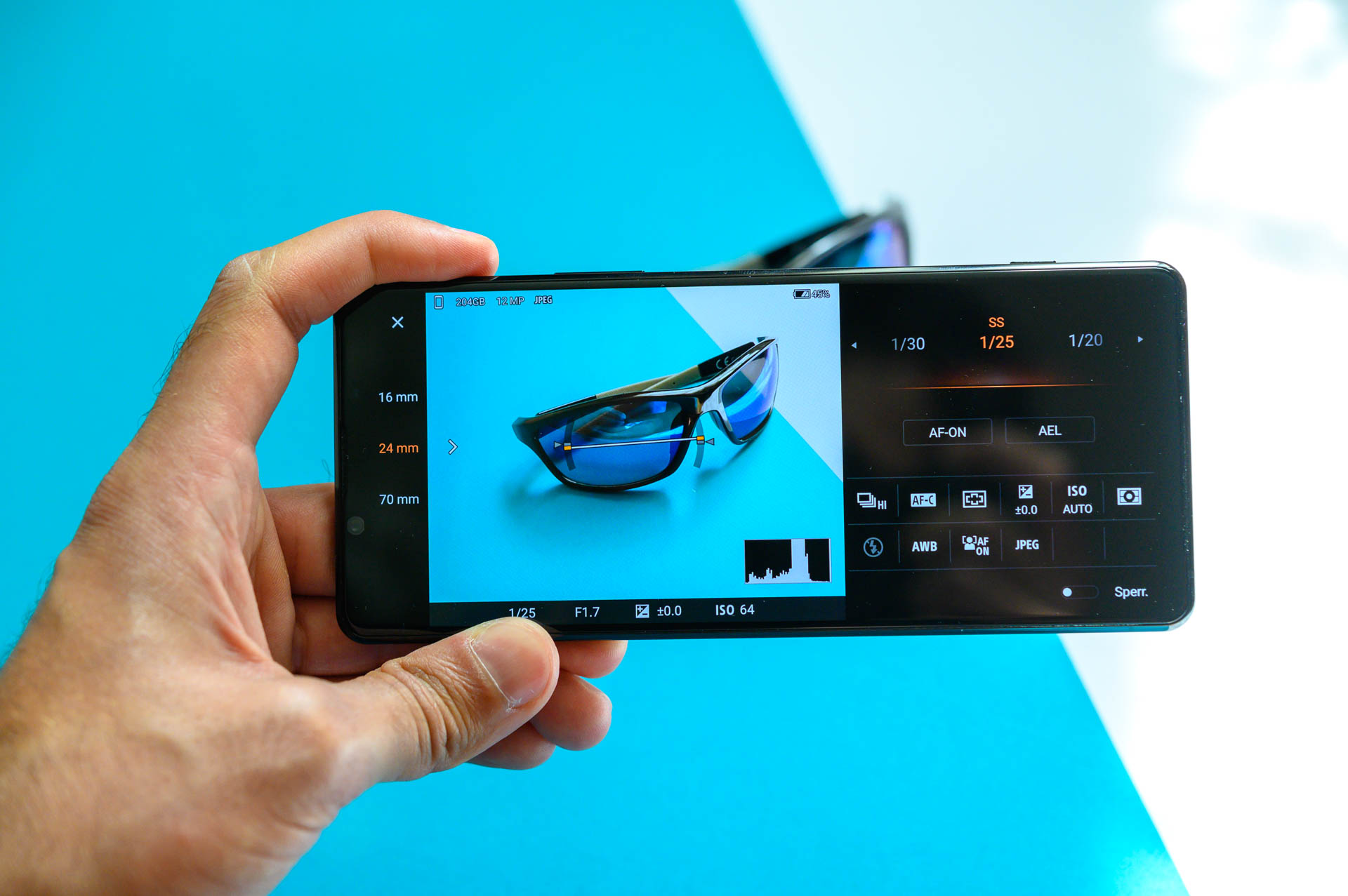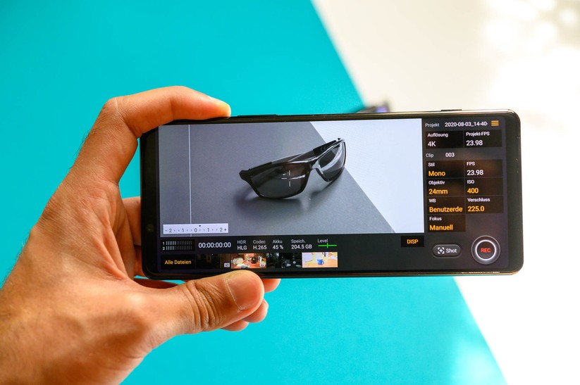 Das ist längst nicht alles, Sony hat noch weitere Features aus den eigenen Kamerasystemen entlehnt. Die Apps Photo Pro und Cinema Pro hat das Unternehmen bei der Oberfläche so gestaltet, dass sich Nutzer von Sony-Kameras heimisch fühlen dürften. Zudem sind hier allerhand manuelle Einstellungen möglich, die in der auf Schnappschüsse ausgelegten Standard-Kamera-App fehlen. So lassen sich für Foto-Aufnahmen Belichtungszeiten, ISO-Wert, Fokusbereich und -modus sowie der Messmodus einstellen, zudem ist die Einstellung des RAW-Formats (DNG-Datei) möglich. Ein Echtzeit-Histogramm und eine virtuelle Wasserwaage sind hilfreiche Werkzeuge für geplante Bildkompositionen. In der Cinema-Pro -App dürfen Einstellungen am Verschluss, der Framerate, dem Fokus und am Look vorgenommen werden. Mit einer praktischen Projektübersicht am unteren Bildschirmrand haben professionellere Cinematographen zudem ihre vorherigen Einstellungen zum Abgleich immer griffbereit.