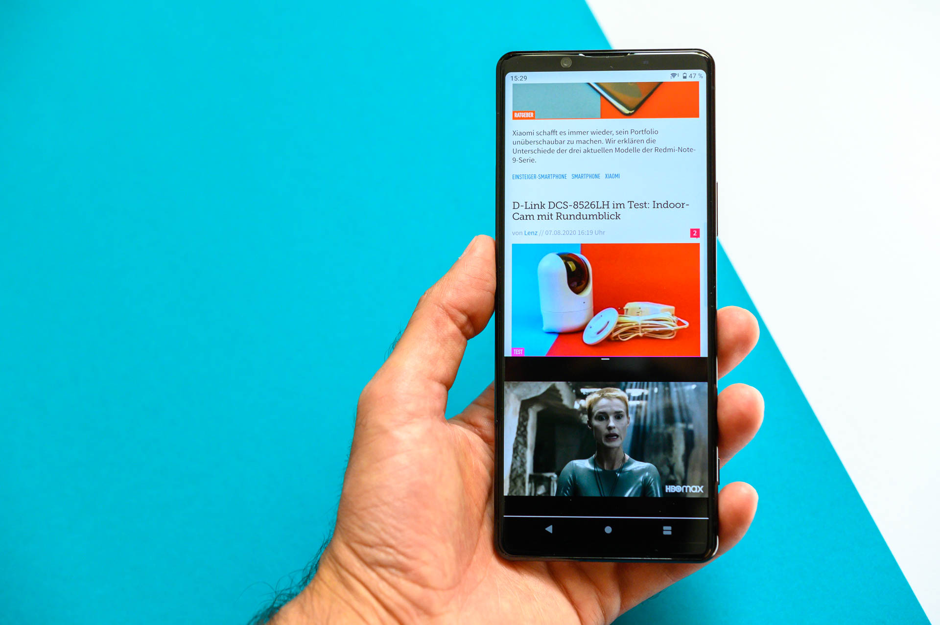 Ähnlich ungenau geht Sony bei der Bildwiederholrate vor. Das Xperia 1 II hat ein Display mit 60 Hertz und hat damit in diesem Punkt gegenüber vielen anderen aktuellen Smartphones, die mit 90 oder gar 120 Hertz daherkommen, das Nachsehen. Allerdings soll die Software-Einstellung „Reduzierung der Bewegungsunschärfe“ weichere Bildläufe erzeugen. Wir sind ehrlich: Ein Unterschied ist kaum zu erkennen, ein natives 90-Hertz-Display bleibt überlegen.