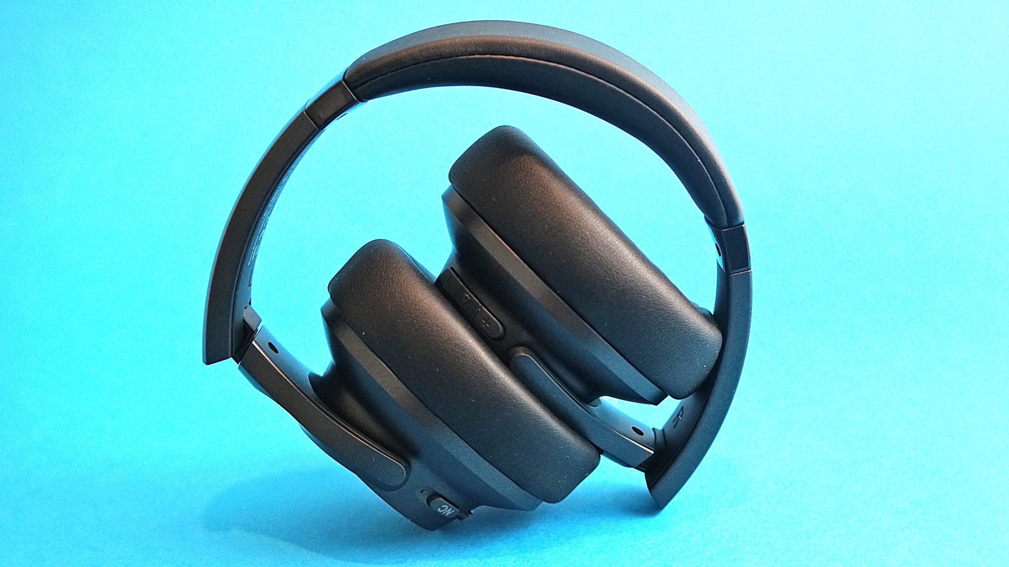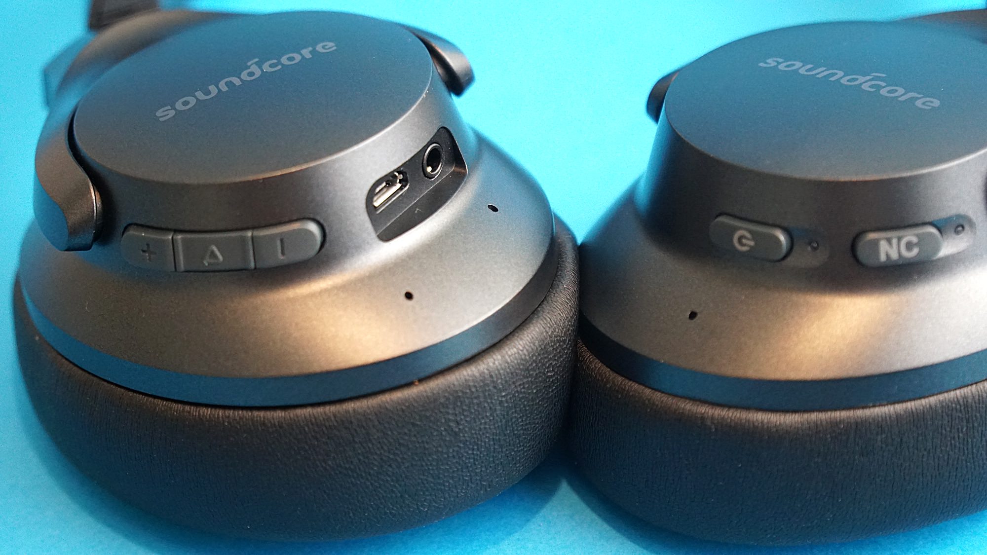 An der Innenseite der Hörmuscheln prangen groß die Buchstaben L und R, damit man den Kopfhörer ja nicht verkehrt herum aufsetzt. Am linken Hörer befinden sich die Powertaste – die auch für die Bluetooth-Kopplung verwendet wird – sowie der Button für die Geräuschunterdrückung. Auch hier meinte es Anker mit der auffälligen Kennzeichnung ein wenig zu gut. Außerdem: Was bringt es, wenn auf einem Button in großer Schrift NC gedruckt werde, das Headset gerade auf dem Knopf sitzt. Die weiße Schrift wirkt nicht dezent, sondern torpediert ein wenig den unauffälligen Look. Auf der rechten Seite befinden sich Lautstärke-Regelung, die Start- und Stopp-Taste, ein Micro-USB-Anschluss zum Aufladen und ein Eingang für Klinkenstecker für den Betrieb per Kabel.