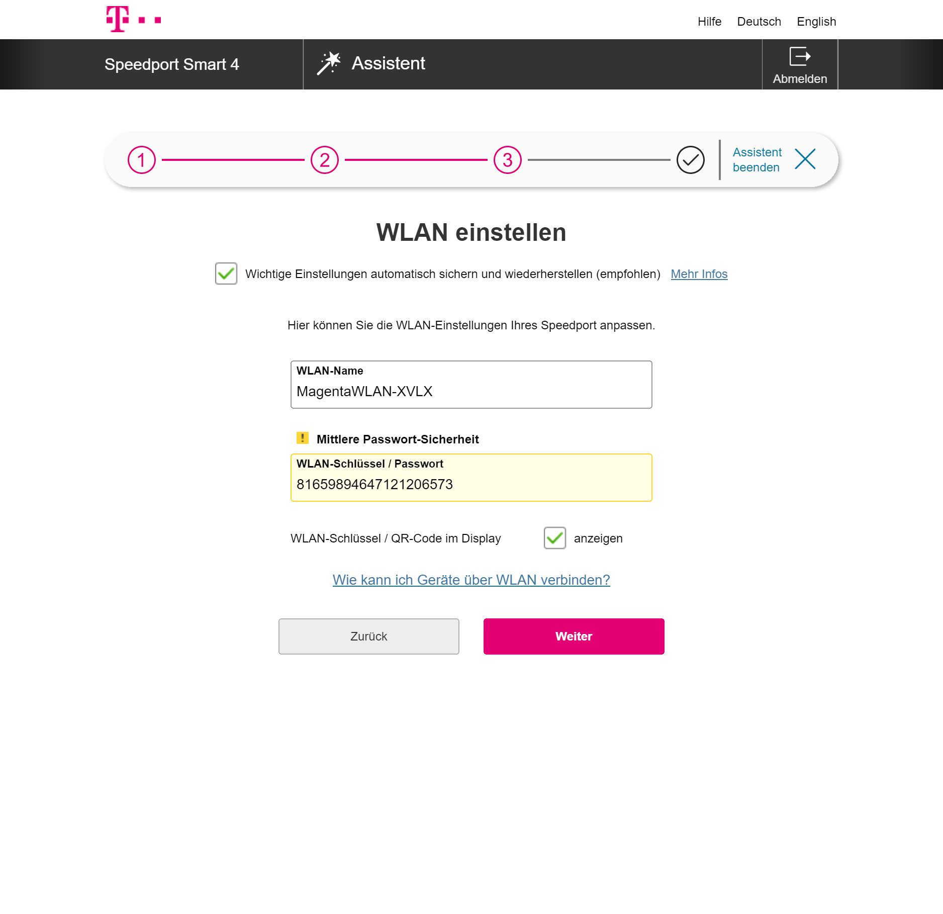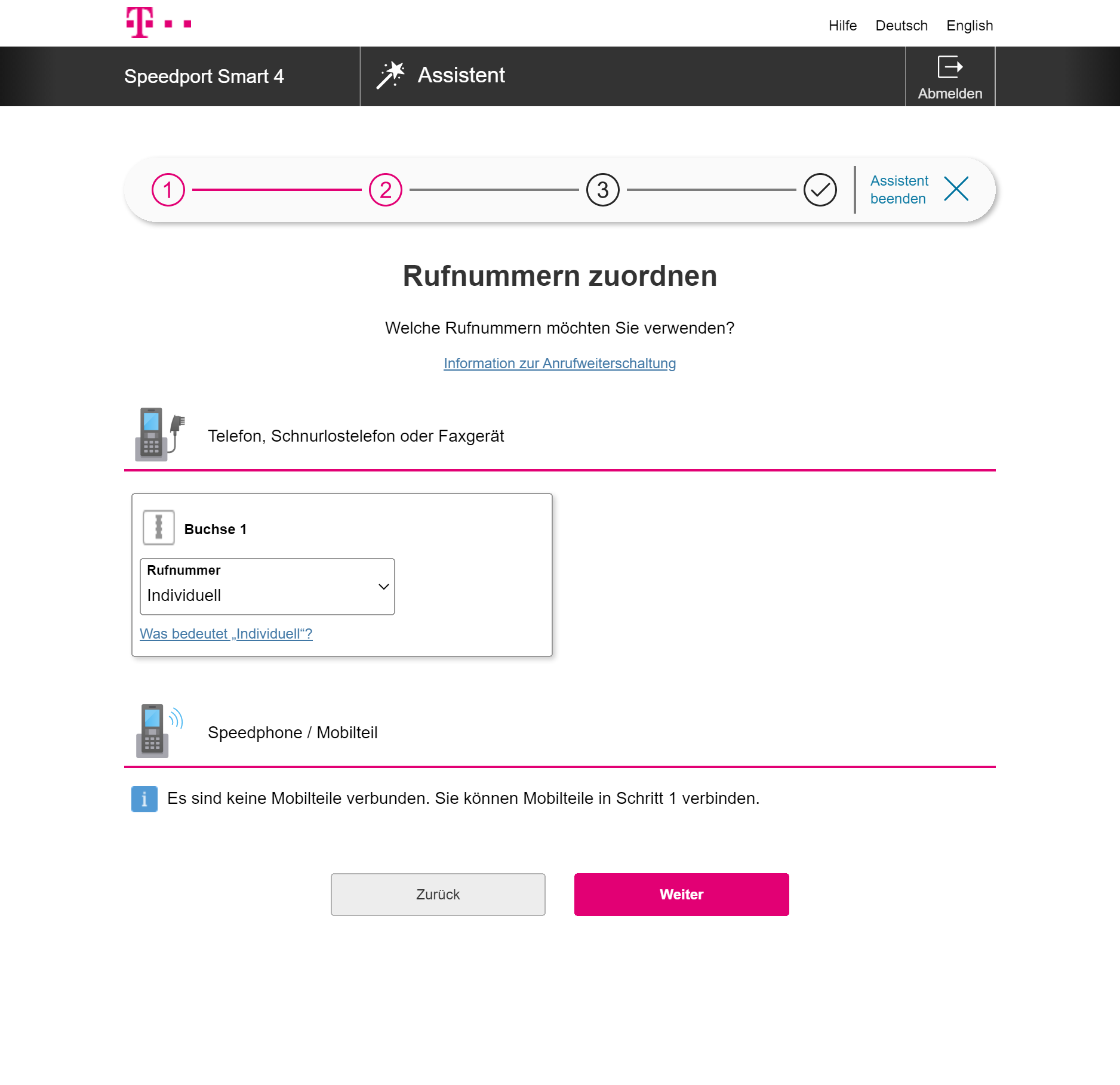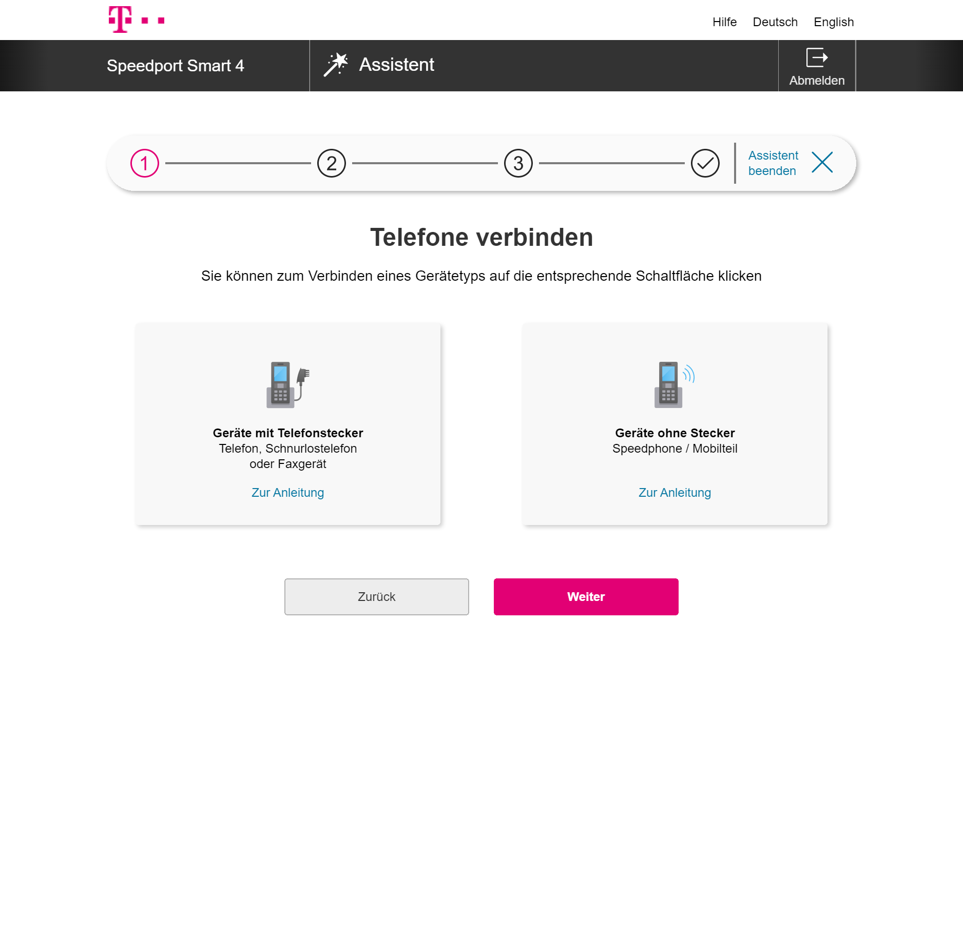 Nach dem ersten Start kann man einen Assistenten nutzen, der bei der Einrichtung des WLANs und etwaiger DECT-Telefone hilft. Wir hatten allerdings das Problem, dass der Router zwar erkannte, dass wir ans Internet angeschlossen waren, aber sich partout nicht verbinden wollte. Offenbar reicht eine Verbindung per LAN nicht, es sollte schon DSL samt Zugangsdaten für die Telekom oder einen anderen Anbieter sein. In der Praxis betrifft dies alle, die ein anderes Modem vor den Router schalten wollen, etwa um den Speedport Smart 4 mit Glasfaser oder Kabelanschluss nutzen zu können.