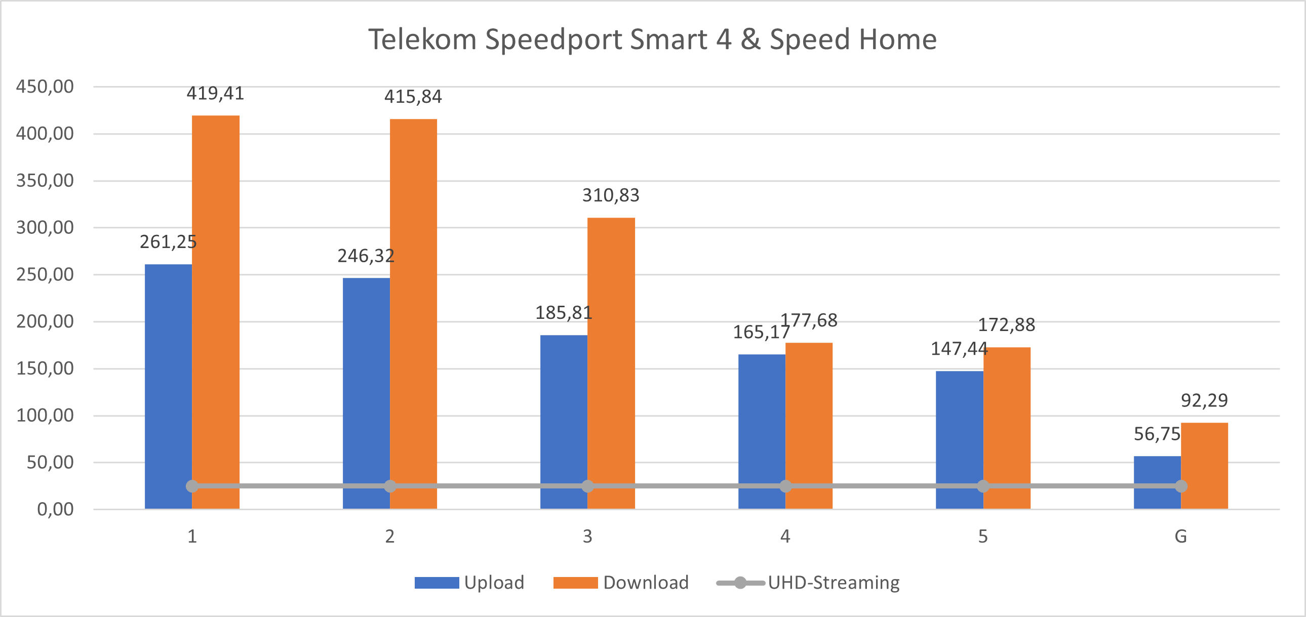 Auf den ersten Blick ist klar zu sehen, wie solide sich das Mesh-Gespann aus Speedport Smart 4 und Speed Home schlägt. Die ersten drei Messpunkte sind super abgedeckt (die Reichweite des Routers ist schon erstaunlich gut), aber selbst nach dem Wechsel auf den Mesh-Satelliten bleibt der Durchsatz hoch. Einzig der Garten fällt ab, aber das war zu erwarten – das Telekom-Gespann ist einer der schnellsten Mesh-Systeme, die wir aktuell im Test hatten.