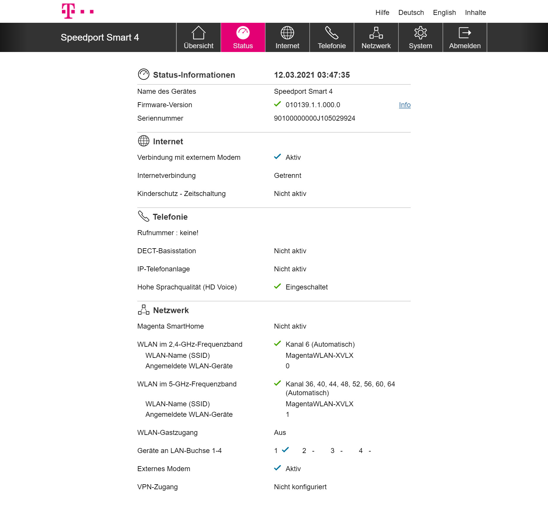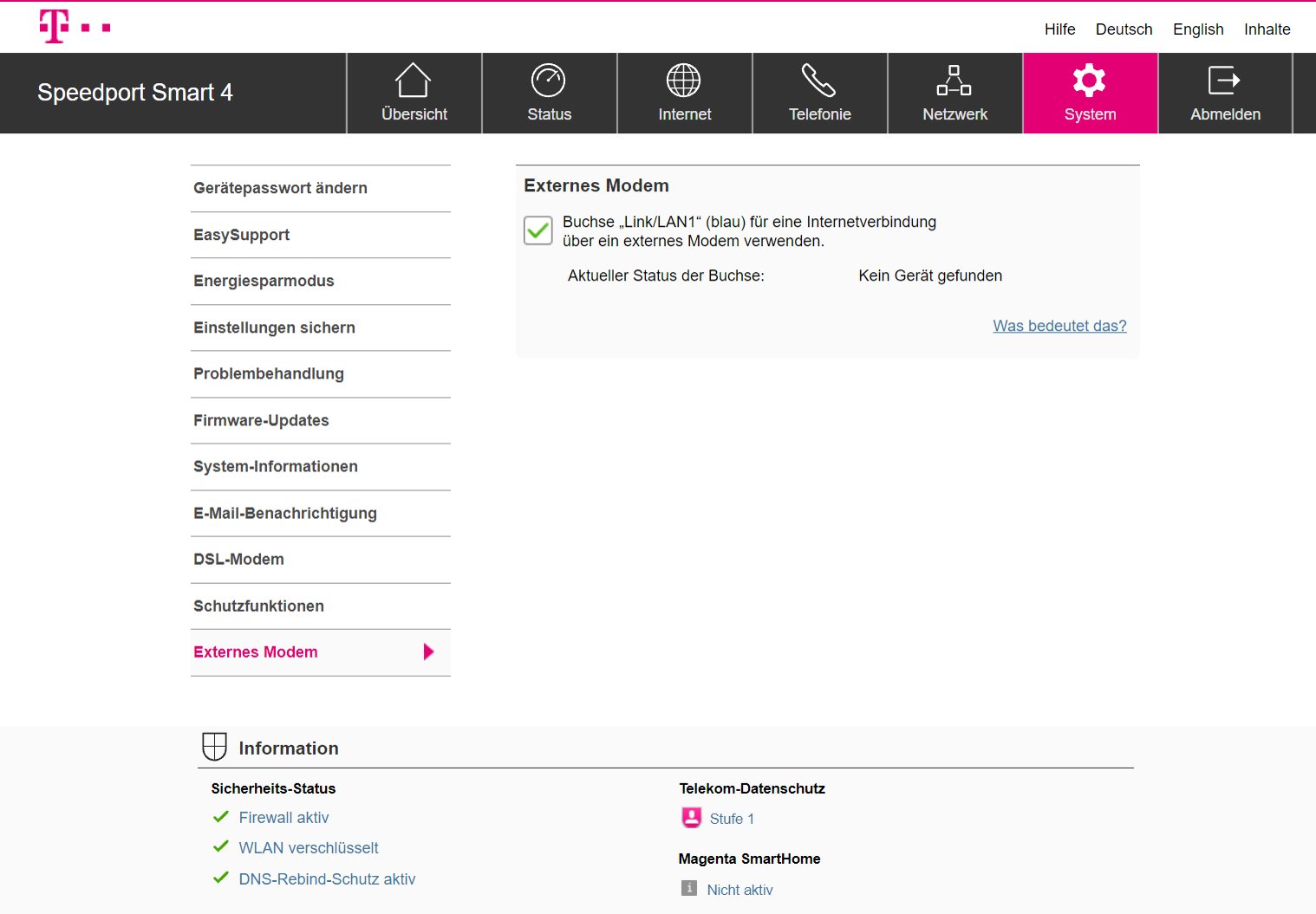Wahrscheinlich kann man dieses Problem irgendwie umgehen, unsere Suchen waren aber zunächst ergebnislos. Wir hatten zwar Zugang zum Internet, nachdem wir den Haken in der Option “Externes Modem” entfernt hatten, dann aber schaltet sich der Router transparent und man kommt nicht mehr über speedport.ip auf die Admin-Oberfläche. Sprich: Wer den Router nicht mit DSL nutzen möchte, der sollte ein anderes Gerät wählen.
