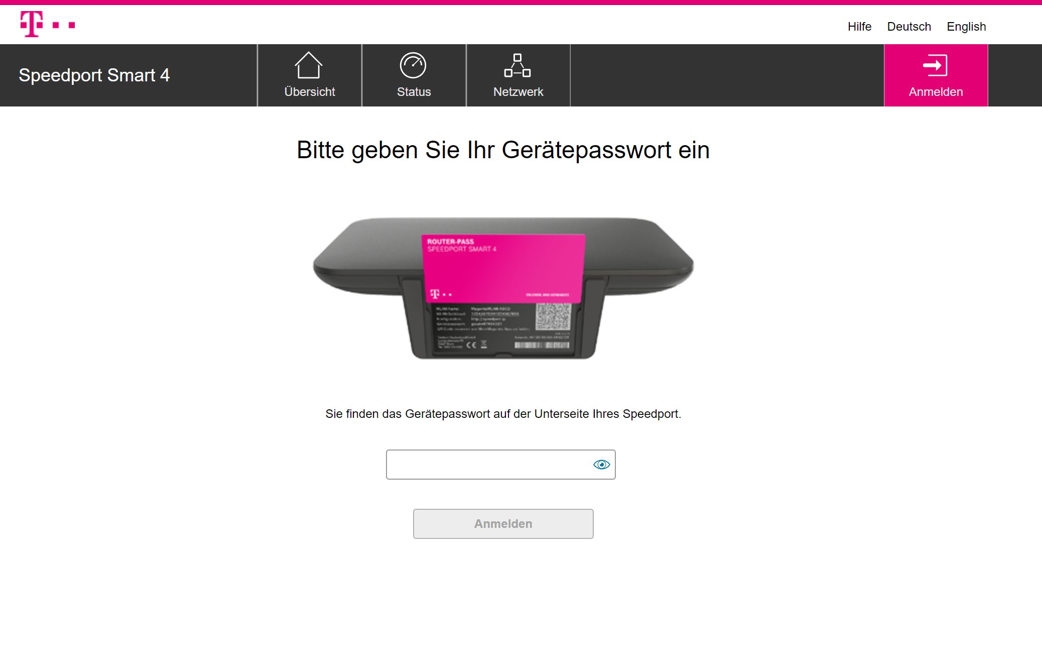 Ist man im Netzwerk des Routers, kann man über die URL speedport.ip auf die Admin-Oberfläche zugreifen. Die ist durch ein Kennwort geschützt, das auf der Unterseite des Routers gedruckt und ausreichend komplex ist, Standard-Passwörter gibt es nicht.