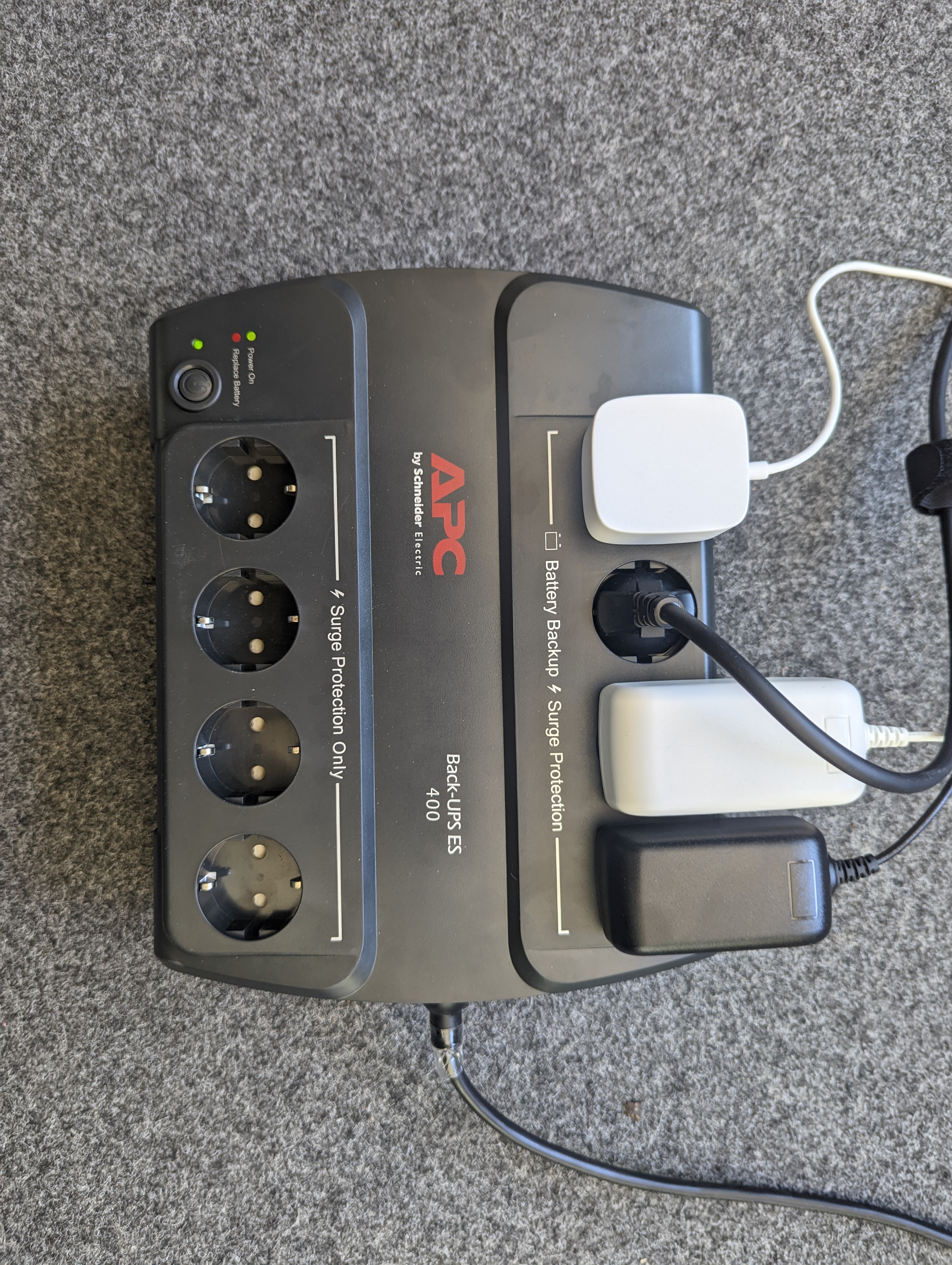 Die APC-USV besitzt acht Steckdosen, die in zwei Viererreihen auf dem Gehäuse angeordnet sind. Die Anschlussdosen, unter denen „Battery Backup Surge Protection“ steht, sind für Geräte vorgesehen, die die USV bei einem Stromausfall versorgen soll. Die vier Anschlüsse unter der Bezeichnung „Surge Protection Only“ schützen eingesteckte Geräte vor Überspannung, auch wenn die USV nicht eingeschaltet ist, erledigen also die gleiche Aufgabe wie eine Steckdosenleiste mit Überspannungsschutz.