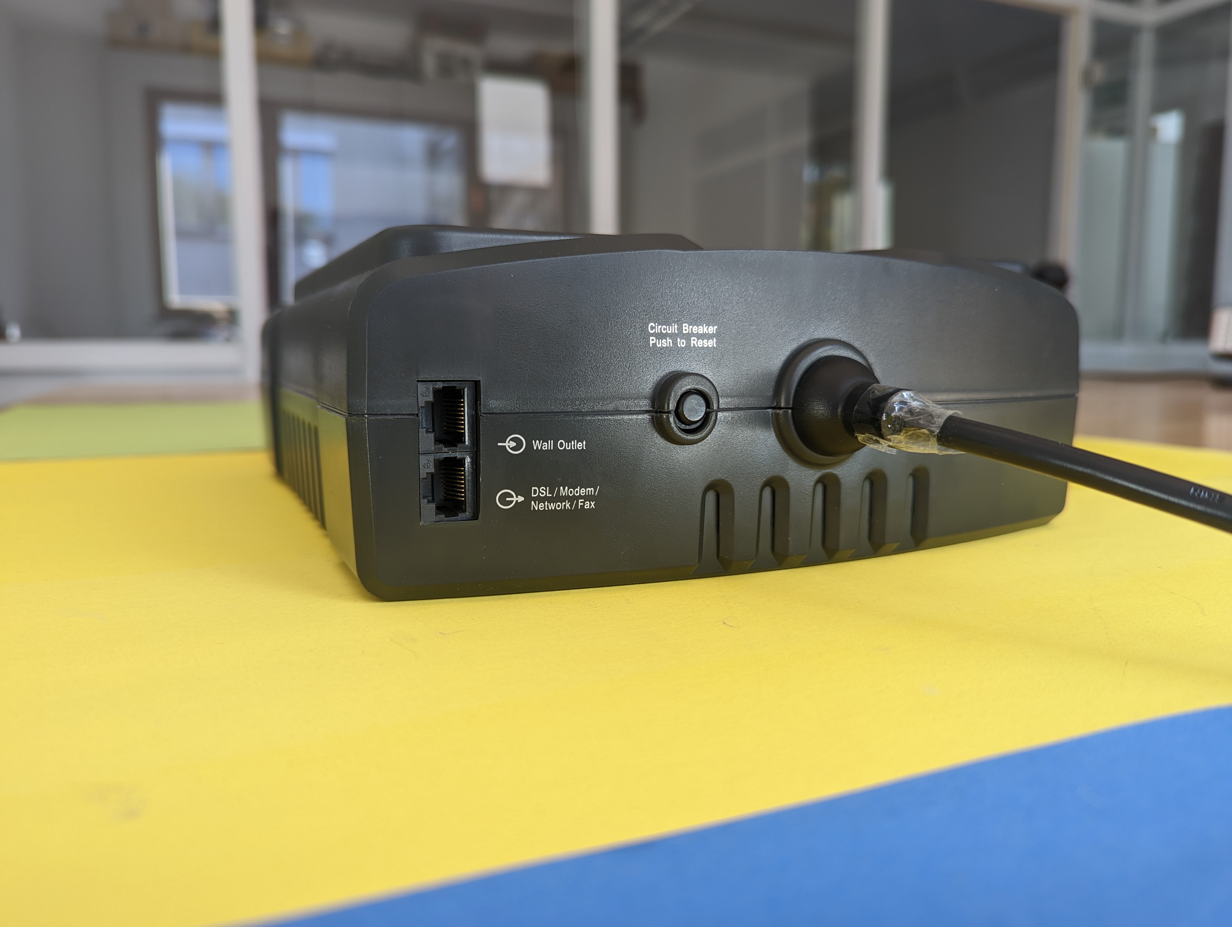 Ebenfalls vor Überspannung kann die APC-USV Telefon-, Fax-, DSL- oder Ethernet-Leitung schützen: Je eine Ein- und Ausgangsbuchse für ein entsprechendes Kabel sitzen vorne am Gehäuse. Buchsen für Kaltgerätestecker hat das Offline-Modell nicht, ebenso fehlen USB-Ports, um Mobilgeräte zu laden oder einen Rechner anzuschließen, um die USV zu steuern. Dementsprechend bietet APC für die Back-UPS ES 400VA auch keine Software an.