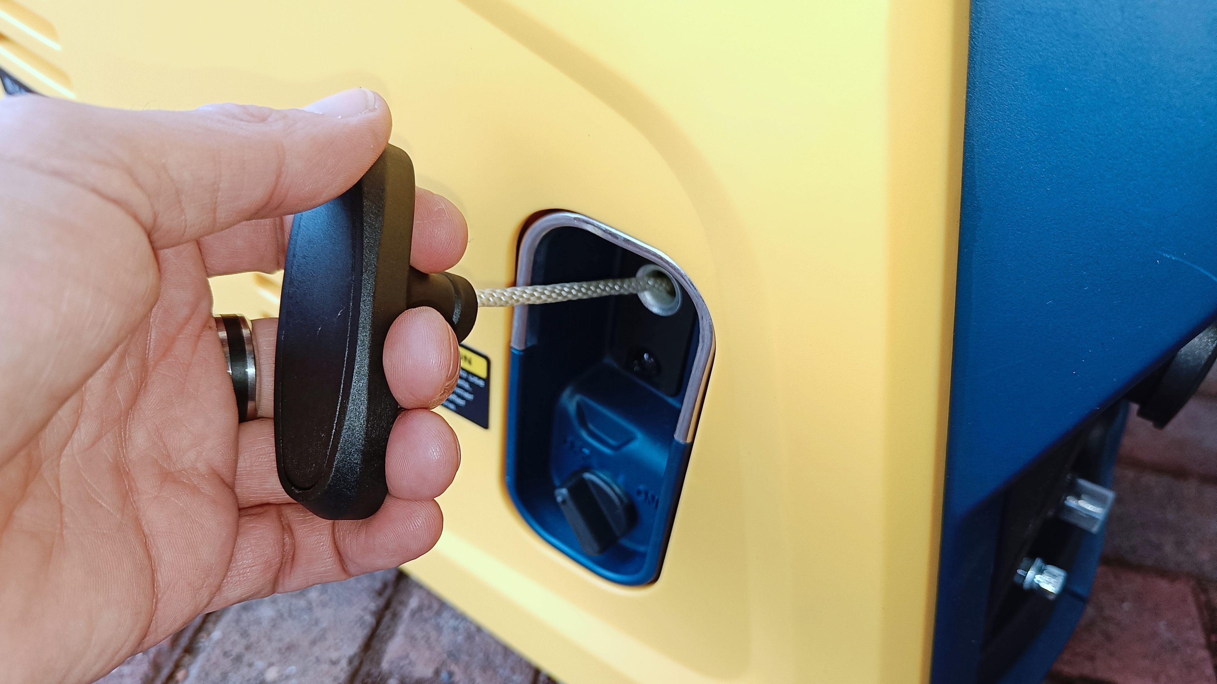 Bevor es aber tatsächlich losgeht, öffnen wir noch die Treibstoffzufuhr und das Tankventil. Zudem benutzen wir die kleine seitliche Kraftstoffpumpe, um die Luft aus der Leitung zu bekommen und aktivieren den Choke. Nach dem Umlegen des Power-Tasters folgt der erste beherzigte Zug am Starterseil, denn einen elektronischen Starter gibt es nicht. Zu unserer Überraschung springt der Inverter auf Anhieb beim ersten Versuch an. Wir hatten uns hier eigentlich auf einen kräftezehrenden Start eingestellt.