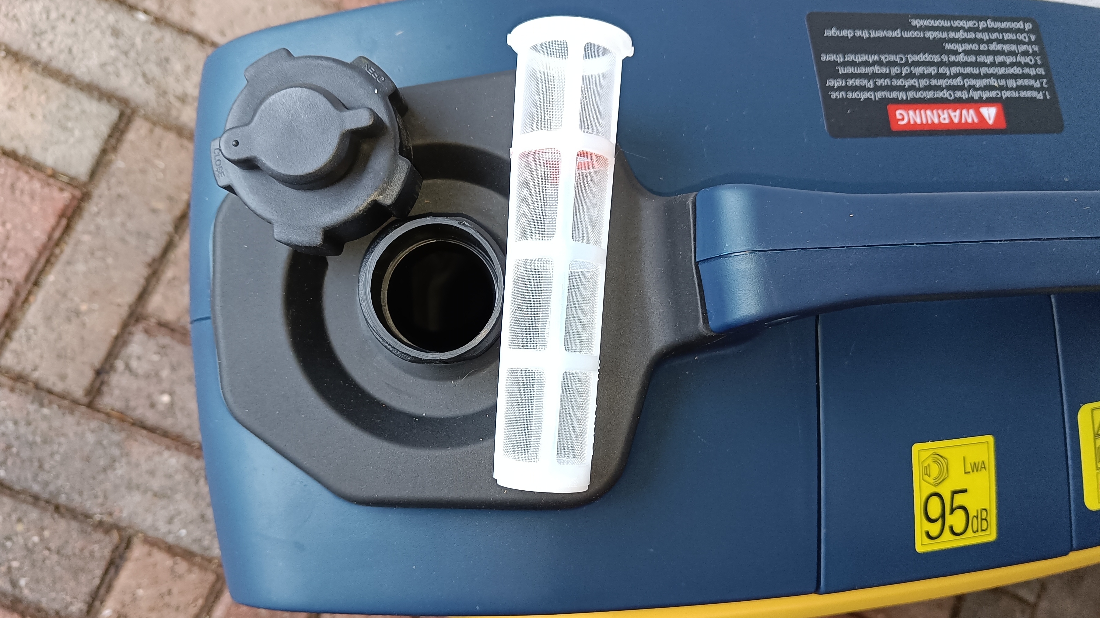 Vor der ersten Inbetriebnahme müssen zunächst Benzin und Motorenöl (10W-30) aufgefüllt werden. Die rund vier Liter Sprit durchlaufen hier einen kleinen Filter, bevor sie im Tank landen. Das Öl gießen wir in kleinen Portionen nach und kontrollieren anschließend den Ölstand. Letztlich benötigen wir hier rund einen halben Liter. Theoretisch ist der Stromgenerator startklar.