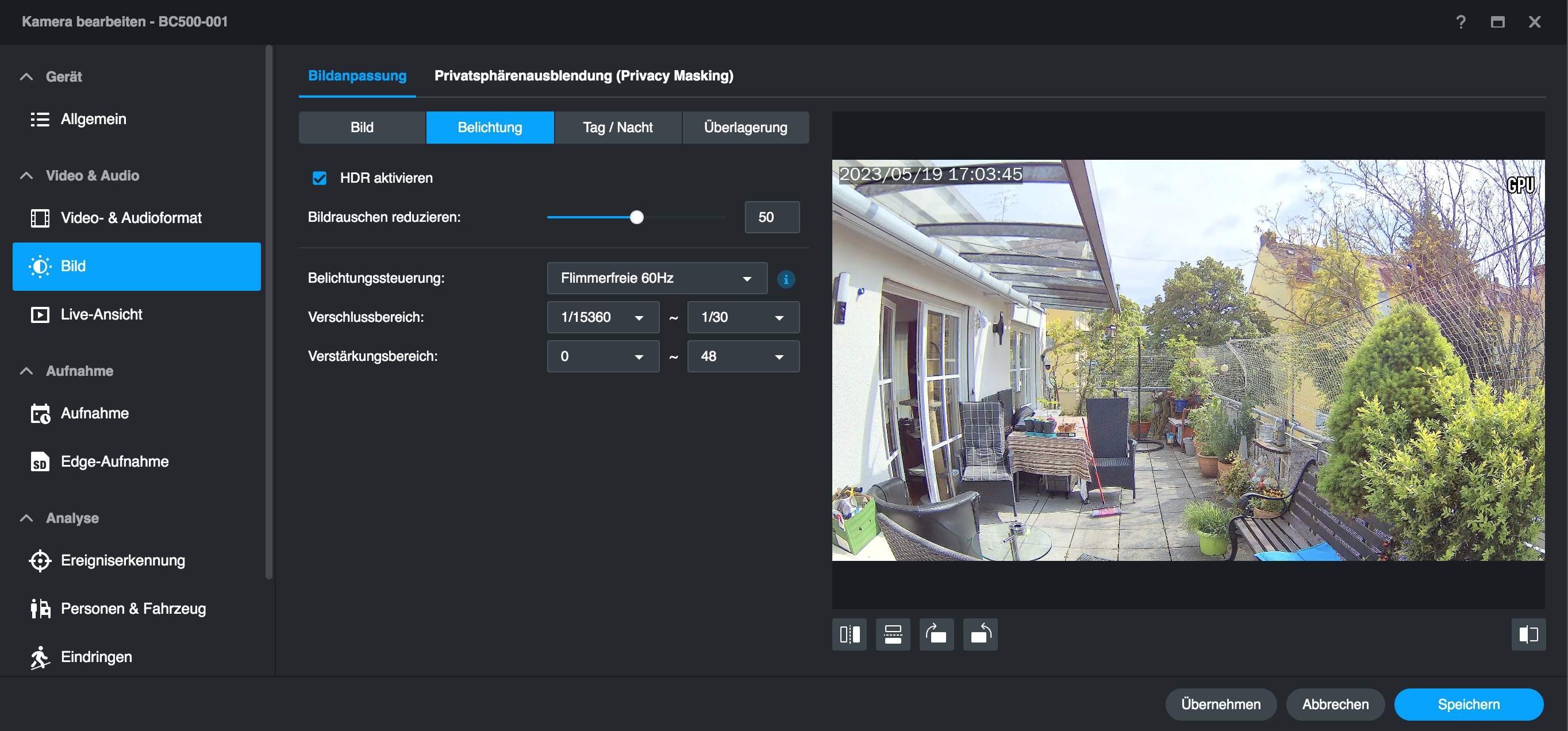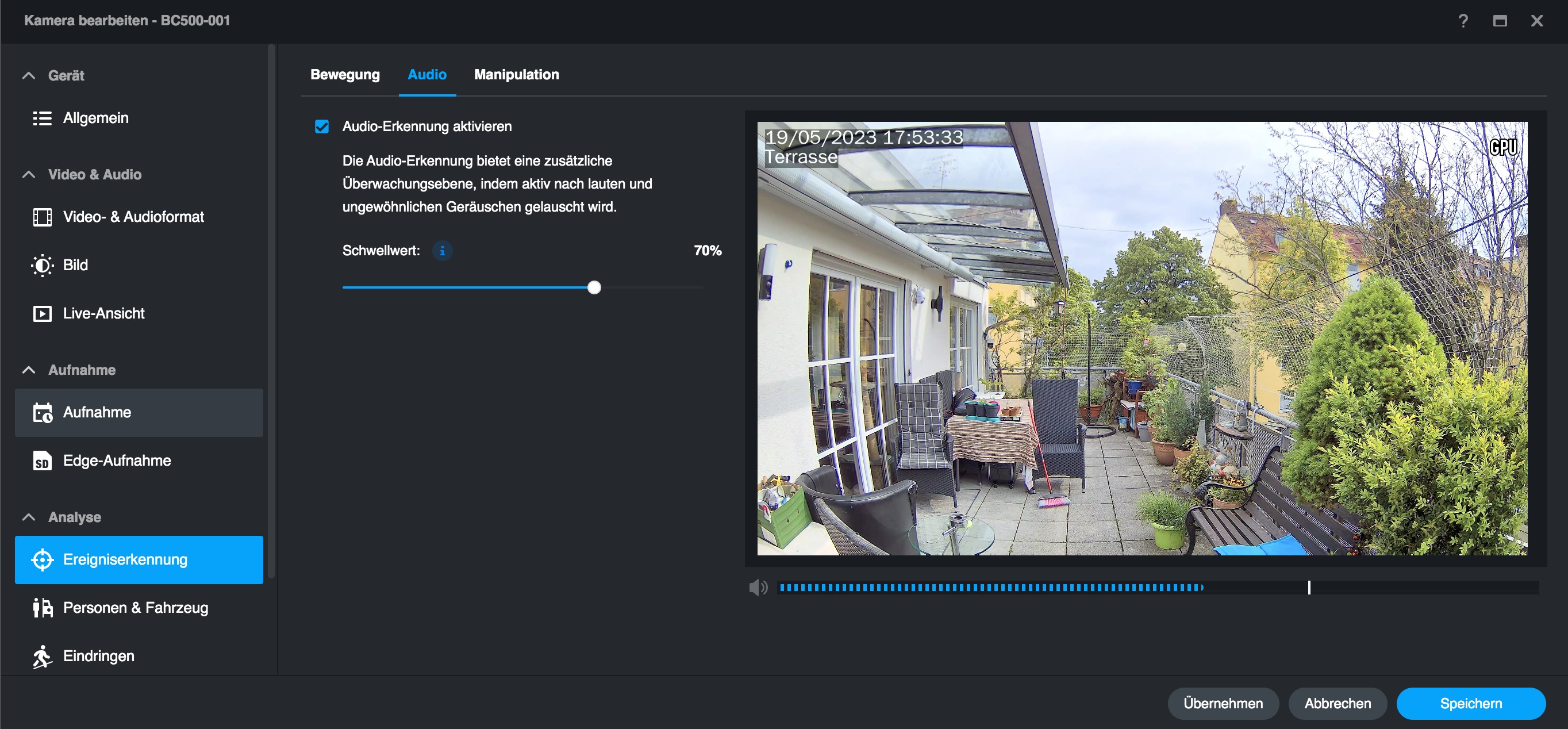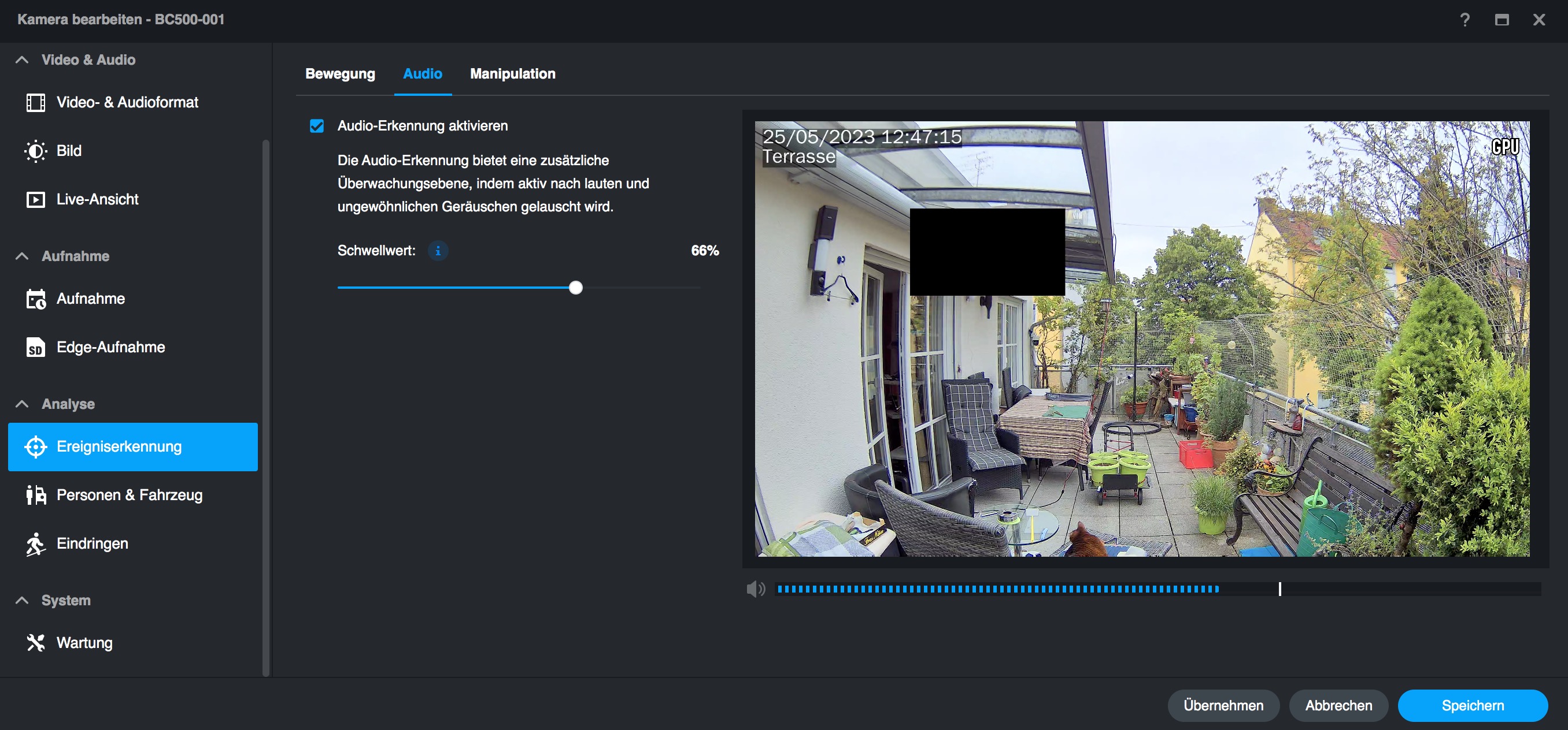 Neben den bereits beschriebenen KI-Funktionen der BC500 unterstützt die Kamera noch Privatsphährenzonen und eine Audioerkennung. Letztere können Anwender sehr einfach konfigurieren, da über das integrierte Mikrofon der Kamera die Lautstärke der aktuellen Außengeräusche genau dargestellt wird und somit das Setzen eines Alarmlevels sehr einfach ist (siehe auch Bildergalerie). Mit Privatsphärenzonen können Anwender Bereiche definieren, die anschließend im Video geschwärzt werden. Das ist für einen DSGVO-konformen Betrieb nötig, wenn die Kamera auf ein fremdes Grundstück oder einen öffentlichen Bereich zeigt.