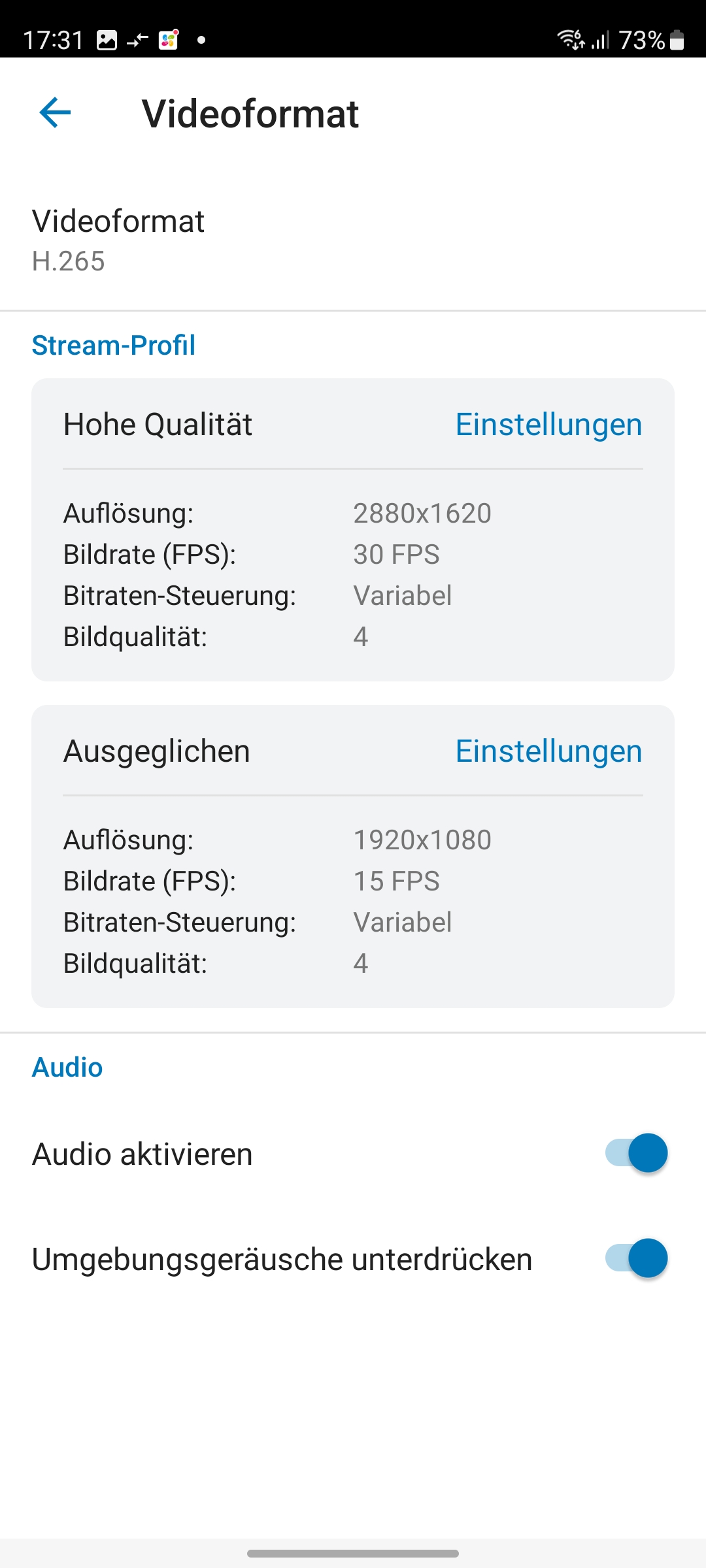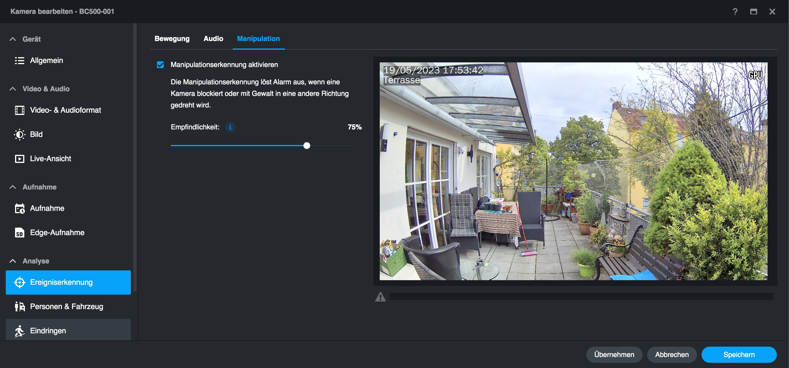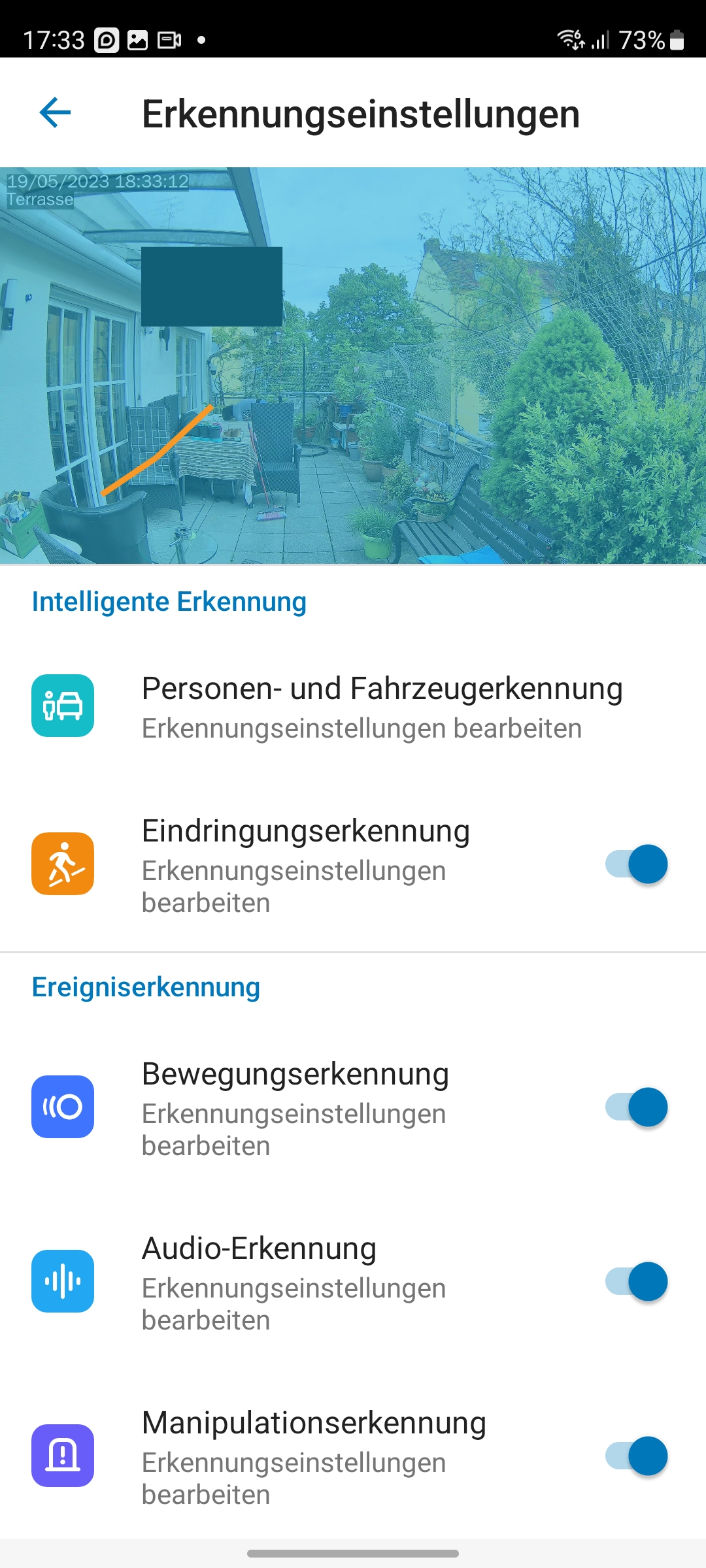Neben den bereits beschriebenen KI-Funktionen der BC500 unterstützt die Kamera noch Privatsphährenzonen und eine Audioerkennung. Letztere können Anwender sehr einfach konfigurieren, da über das integrierte Mikrofon der Kamera die Lautstärke der aktuellen Außengeräusche genau dargestellt wird und somit das Setzen eines Alarmlevels sehr einfach ist (siehe auch Bildergalerie). Mit Privatsphärenzonen können Anwender Bereiche definieren, die anschließend im Video geschwärzt werden. Das ist für einen DSGVO-konformen Betrieb nötig, wenn die Kamera auf ein fremdes Grundstück oder einen öffentlichen Bereich zeigt.