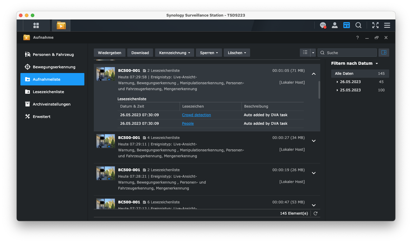 Beim Einsatz mehrerer Überwachungskameras in einem professionellen Umfeld ist eine zentrale Verwaltung der aufgenommenen Videos ein großer Vorteil. Und hier glänzt die BC500 in Kombination mit Synologys Surveillance Station. Anwender können dank zahlreicher Filterfunktionen Videos zu bestimmten Ereignissen nicht nur schnell finden, sondern auch zügig auswerten. Dass dabei mit DS Cam auch eine mobile App zur Verfügung steht, ist eher eine Randnotiz. Die Musik spielt aufgrund der Komplexität der vielen Daten und der begrenzten Möglichkeit zur Videoauswertung am Smartphone eher am Desktop. Die mobile App ist dennoch von Vorteil, da man darüber auch unterwegs entsprechende Pushbenachrichtigungen erhalten kann.