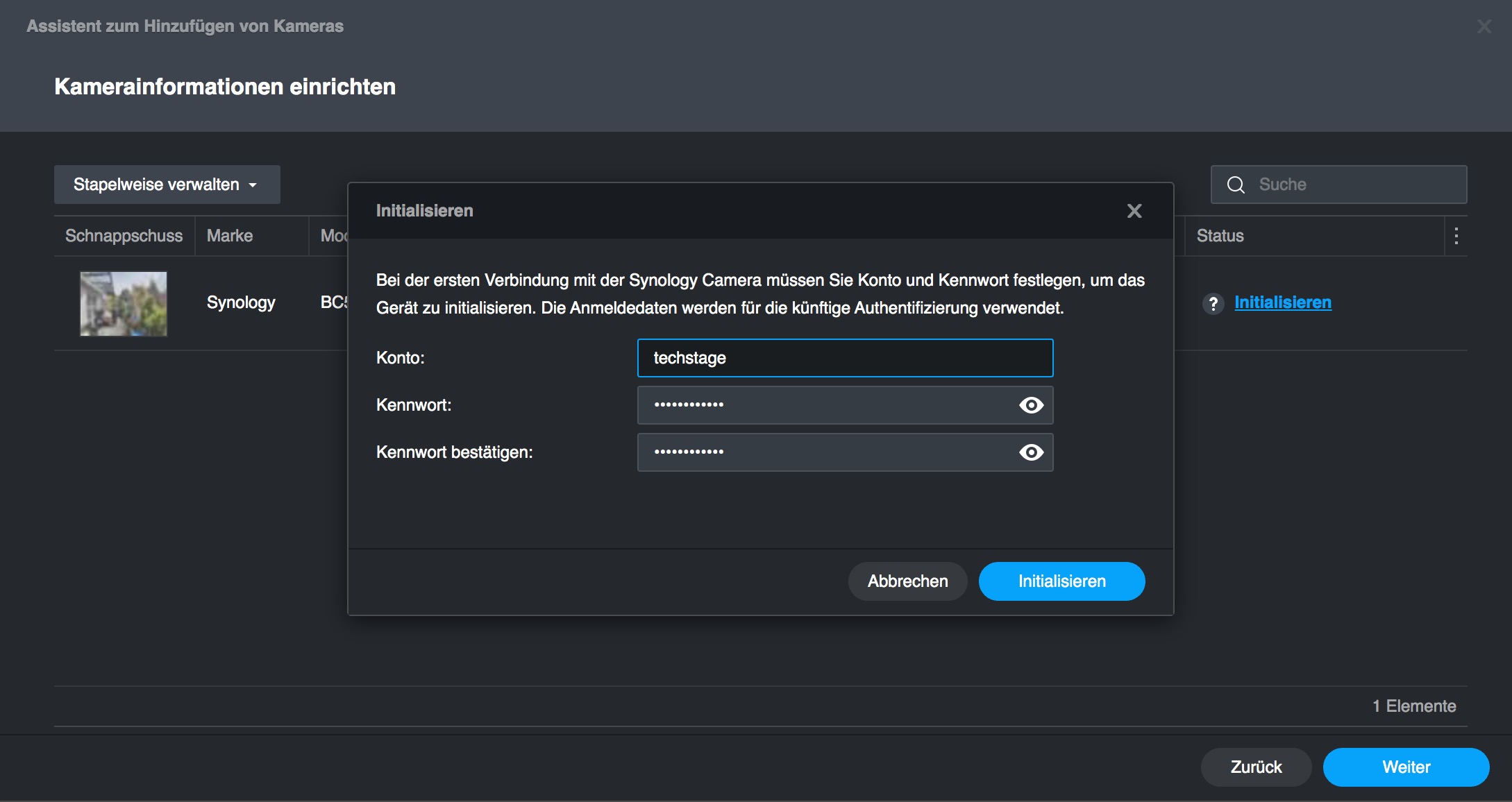Sobald man die Kamera mit einem Ethernetkabel an einen PoE-Switch anschließt, wird sie von der Surveillance Station erkannt und über einen Assistenten eingerichtet (siehe auch Bildergalerie). Zunächst muss man Konto und Kennwort für die Kamera vergeben. Anschließend kann man sich zwischen einem schnellen Setup und einer Inbetriebnahme mit vollständiger Konfiguration entscheiden. Letzteres kann aber auch später nachholen.