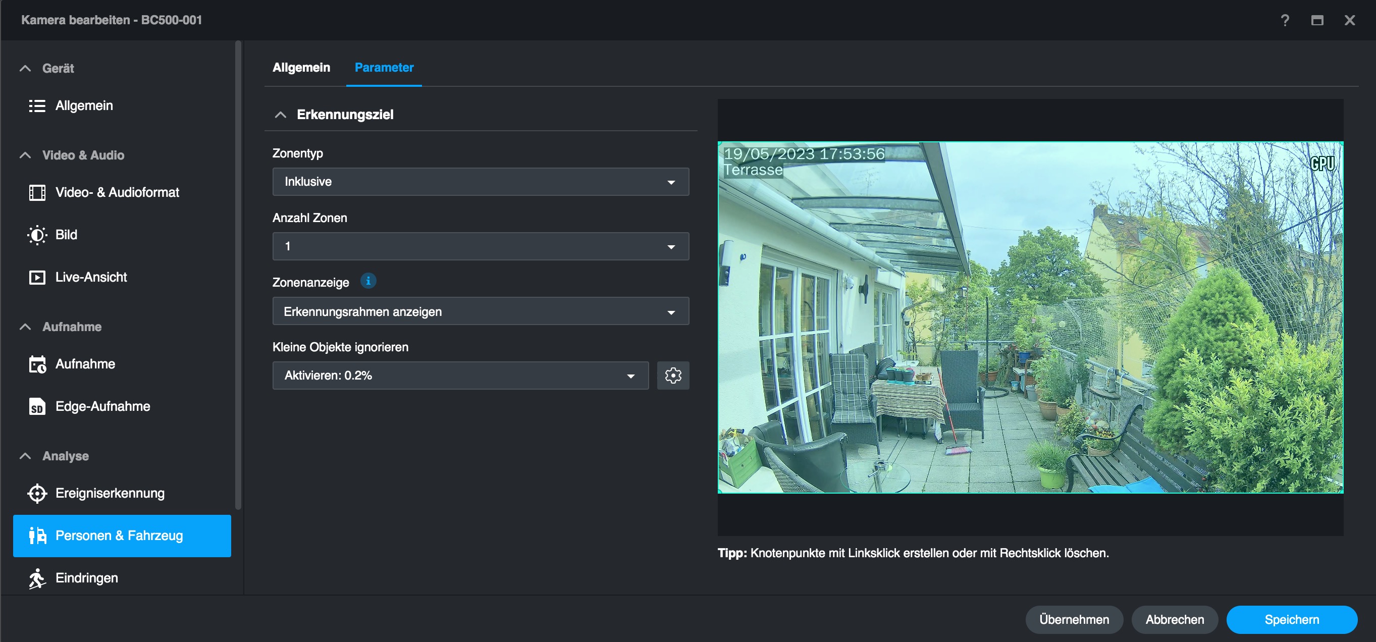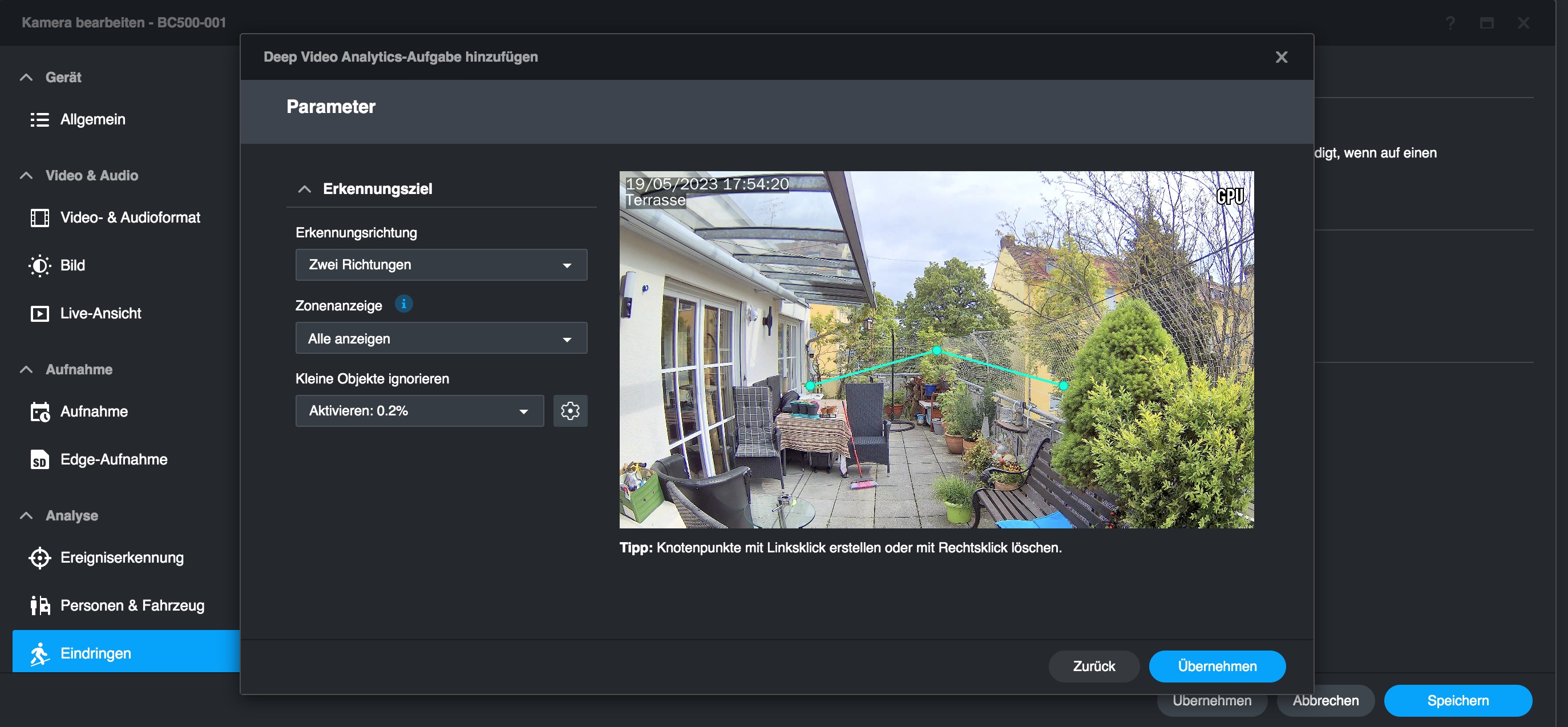 Mit „Eindringungserkennung“ bietet die Synology BC500 noch ein weiteres smartes KI-Feature. Damit können Anwender virtuelle Zäune einrichten, sodass sie informiert werden, sobald Objekte diese Grenze überschreiten. Objekte können dabei entweder Personen oder/und Fahrzeuge sein.