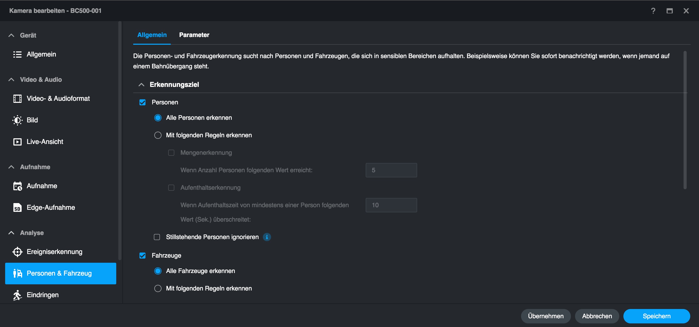 Die integrierte KI kann bei der Bewegungserkennung zwischen Personen, Fahrzeugen und sonstigen sich bewegenden Objekten differenzieren. Das reduziert Fehlalarme und erleichtert die Suche in Aufnahmen nach relevanten Ereignissen. Die Personenerkennung kann außerdem an eine bestimmte Anzahl von Menschen (Mengenerkennung) und an die Aufenthaltsdauer gekoppelt werden. Letzteres ist auch für die Erkennung von Fahrzeugen möglich, sodass etwa nur Fahrzeuge, die länger als 10 Sekunden stehen, von der KI erkannt werden, wobei man stillstehende Fahrzeuge ausschließen kann. Diese Bedingungen kann man kombinieren, sodass eine Aufnahme respektive Ereignis nur ausgelöst wird, wenn Personen und Fahrzeuge nach den zuvor festgelegten Parametern erkannt werden. Die Mengenerkennung von Personen und Fahrzeugen ist etwa bei der Überwachung von Veranstaltungsorten und Parkplätzen nützlich, um frühzeitig auf Kapazitätsengpässe regieren zu können.
