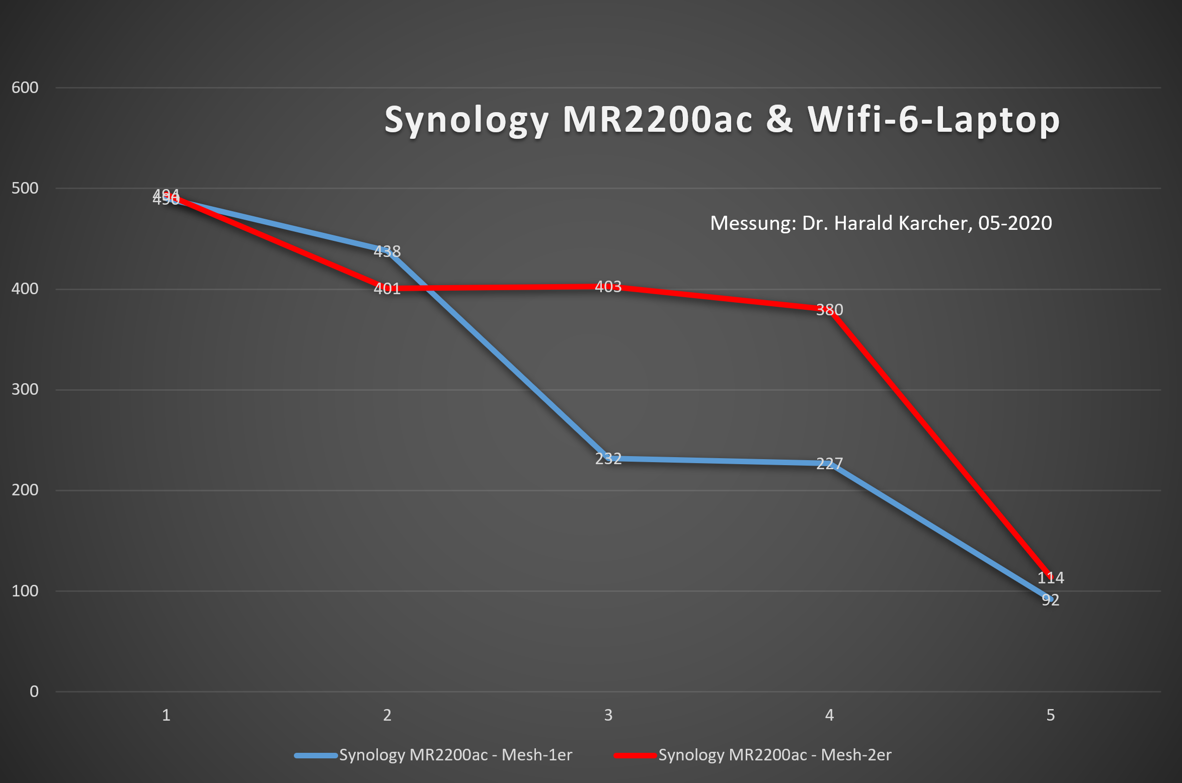Die folgende Grafik zeigt nur die Messwerte aus dem 5 GHz Band: In der blauen Kurve war ein einziger Synology MR2200ac eingeschaltet. In der roten Kurve arbeiten zwei Geräte im Mesh zusammen. Der zweite Funker zog den Durchsatz vor allem in den entfernteren Räumen 4 und 5 deutlich hoch. Zwar nicht auf das Doppelte, aber immerhin merklich besser als ohne so ein Mesh-Gespann.