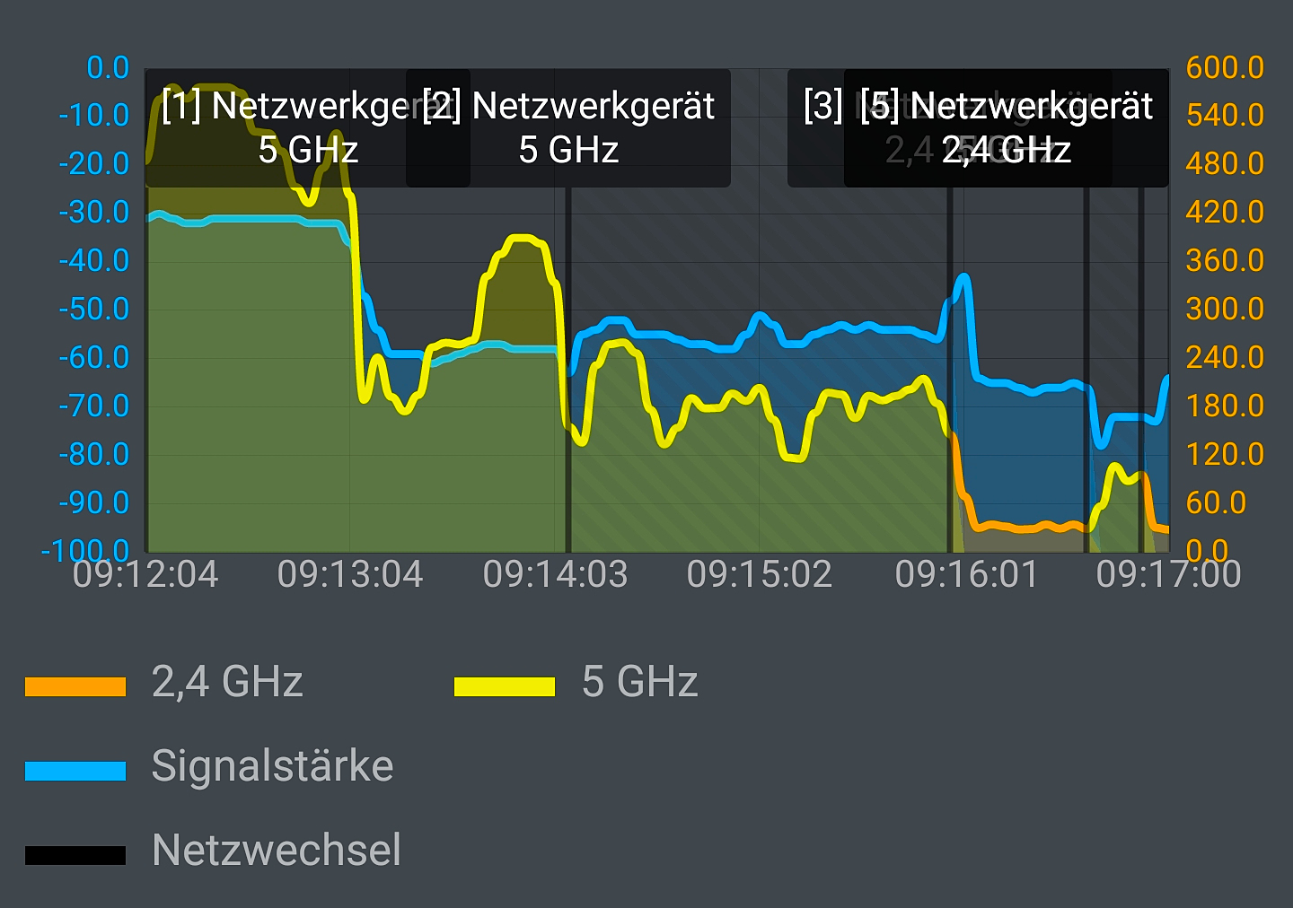 Bei der zweiten Messung waren beide Synology MR2200ac Mesh Router auf beiden Etagen eingeschaltet: Wie man sieht, hat das Handy jetzt mehrmals die Bänder gewechselt. Wie schon der Laptop, so hat auch das Handy vor allem in den Räumen 4 und 5 dank 2er-Mesh-Set einen merklich höheren Durchsatz erzielt, als wenn nur ein einziger Mesh-Funker aktiv war.