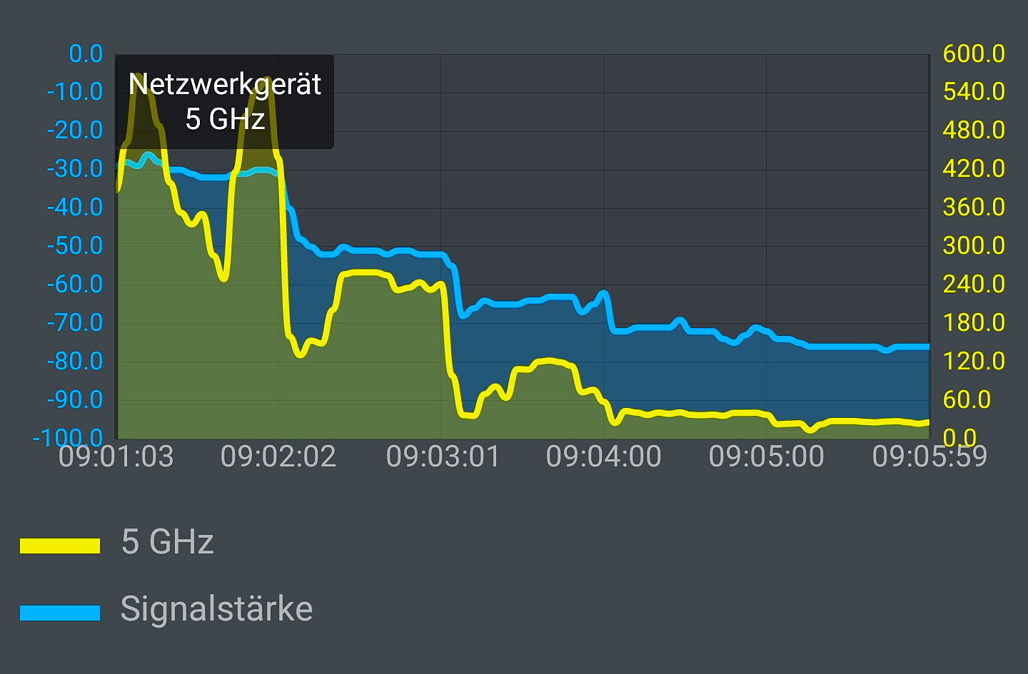 Für eine weitere Messung nutzen wir ein Samsung Galaxy Note+ mit Wifi-6-Modul. Die folgende Grafik zeigt eine Messung durch 5 Räume über zwei Etagen hinweg, zuerst mal mit nur einem eingeschalteten Synology MR2200ac Funker: