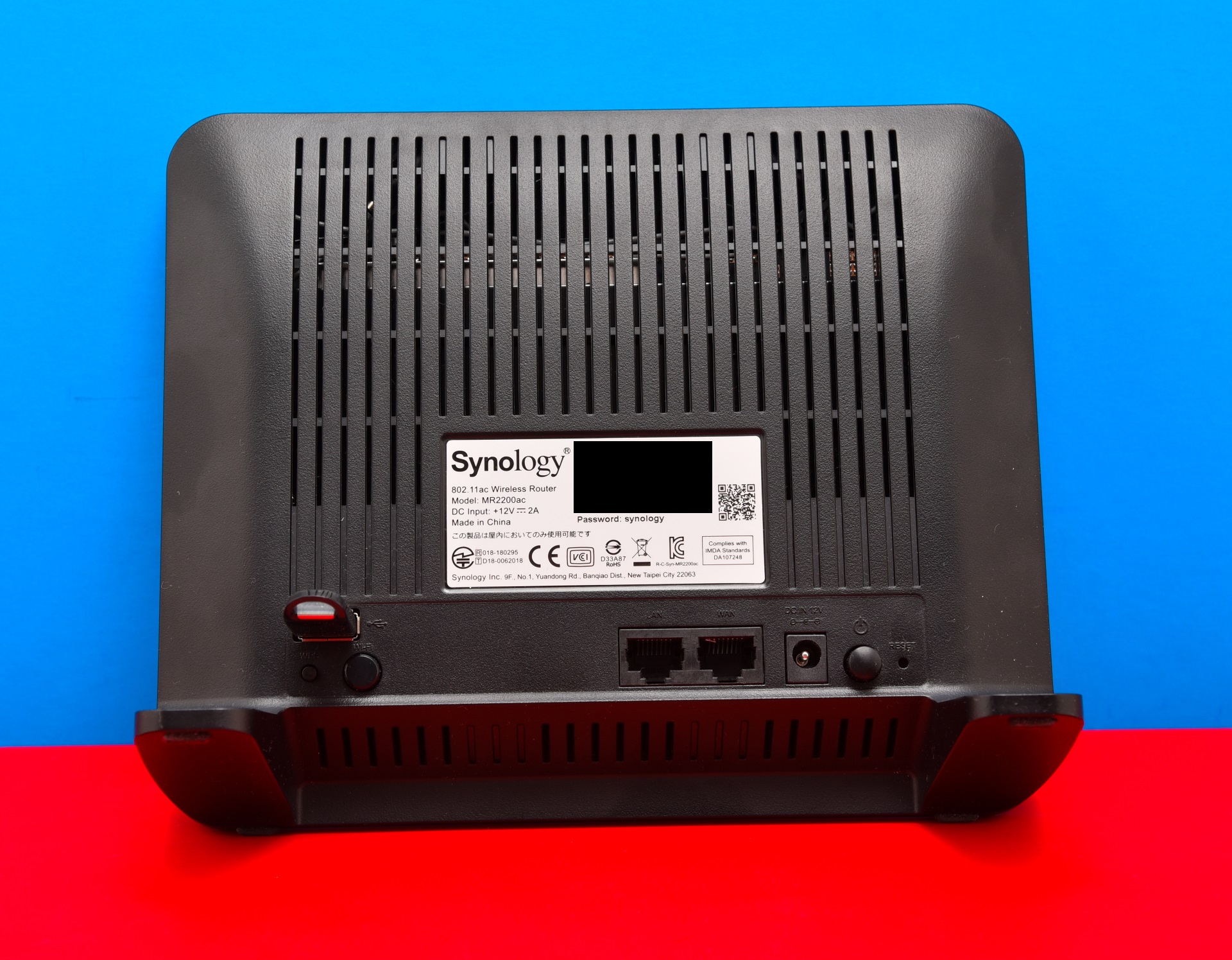 Der Synology MR2200ac funkt 2x2-MU-MIMO, im 2,4 GHz Band bis zu 400 MBit/s, im 5 GHz Band bis zu 2x 866 MBit/s, zusammen also 2132 MBit/s. Etwas aufgerundet wird daraus 2200, daher der Name MR2200ac. Von hinten ist der MR2200ac genauso schwarz und nüchtern wie von vorne. Die Beschriftung der Schnittstellen ist schwarz auf schwarz in Plastik gepresst. Richtig gelesen, schwarz auf schwarz, also kaum lesbar. Das bitte beim nächsten Modell besser machen!