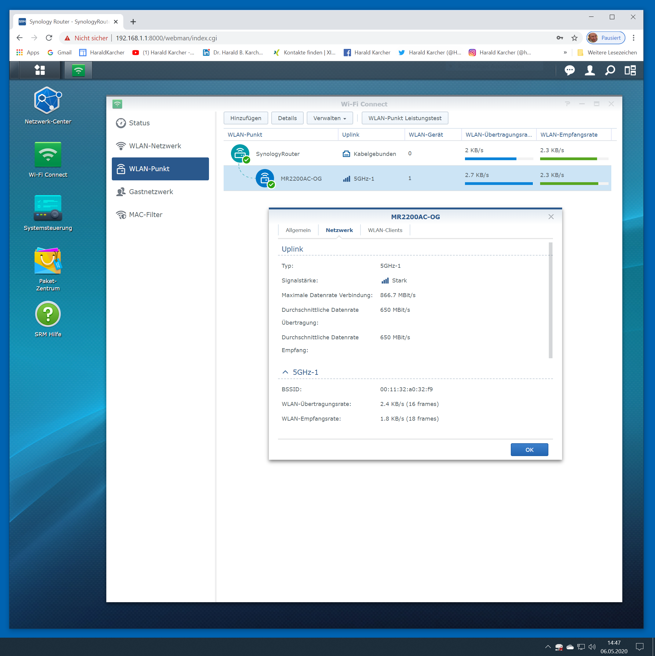 Der kleine Tri-Band-Funker Synology MR2200ac kann maximal 80 MHz breite Kanäle nutzen, allerdings zwei gleichzeitig, im unteren und im oberen 5 GHz-Band, also auf 5G-1 und auf 5G-2. Trotzdem bleibt der maximale Netto-Speed (pro Band) weit unter 1000 MBit/s netto.