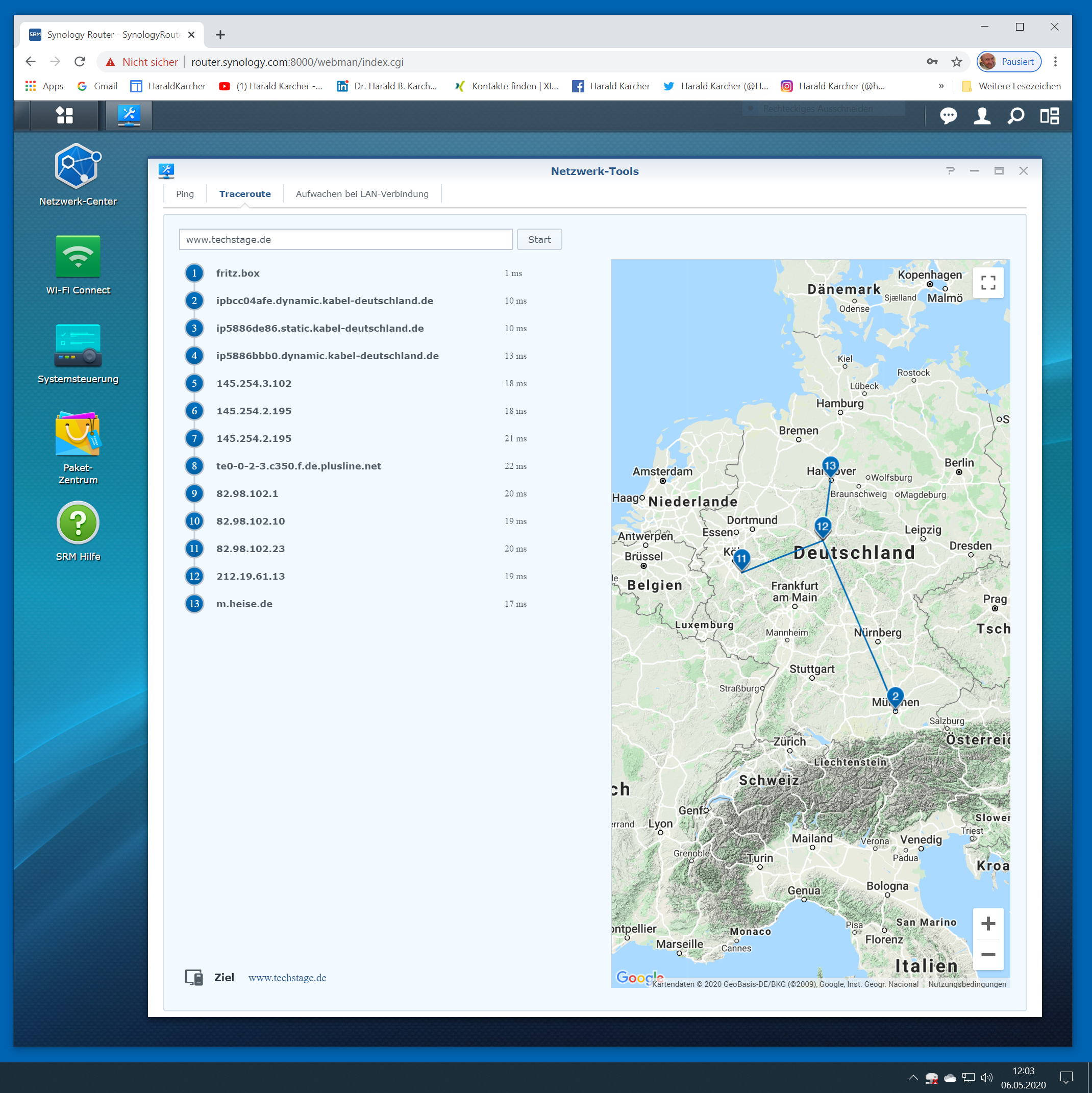 Schlankere Netzwerktools wie Ping und Traceroute waren schon ab Werk auf dem MR2200ac installiert. Eine Verknüpfung der Internet-Paket-Routen mit Google Maps macht die knöcherne Netzwerk-Materie gleich viel anschaulicher.
