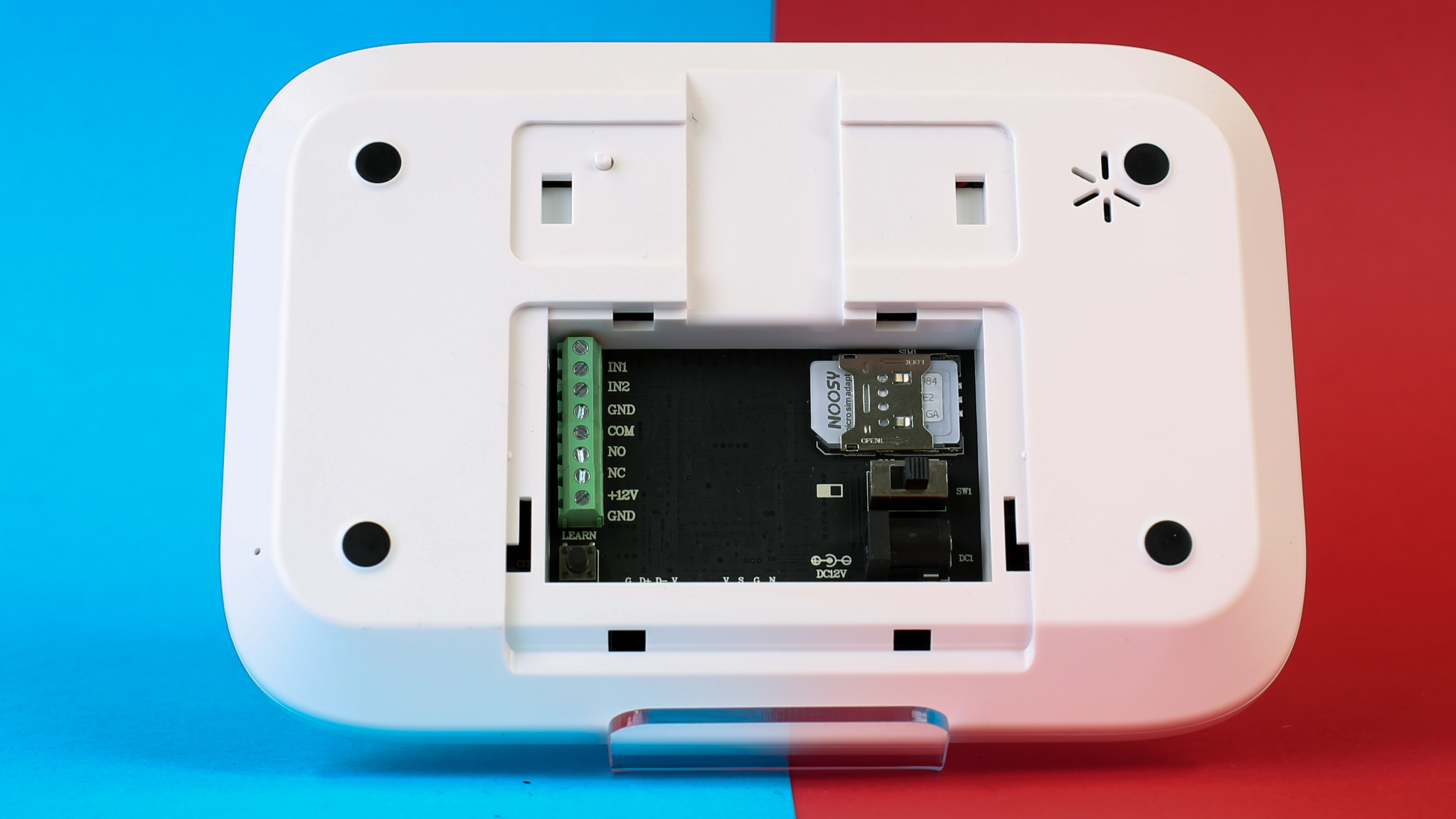Danach steckt man das Netzteil in die Steckdose, das Kabelende in die passende Buchse auf der Rückseite der Alarmanlage und stellt den versteckt hinten und per Sabotagekontakt überwachten Schiebeschalter an. Ist die SIM-Karte aktiv, war es das: Das System ist startklar. Die mitgelieferten Komponenten (zwei Fernbedienungen, Bewegungsmelder, Magnetkontakt) sind bereits angelernt. Dank integriertem Puffer-Akku läuft das System auch bei Stromausfall weiter. Geht die eigene Batterie zur Neige, meldet sich das System per SMS.